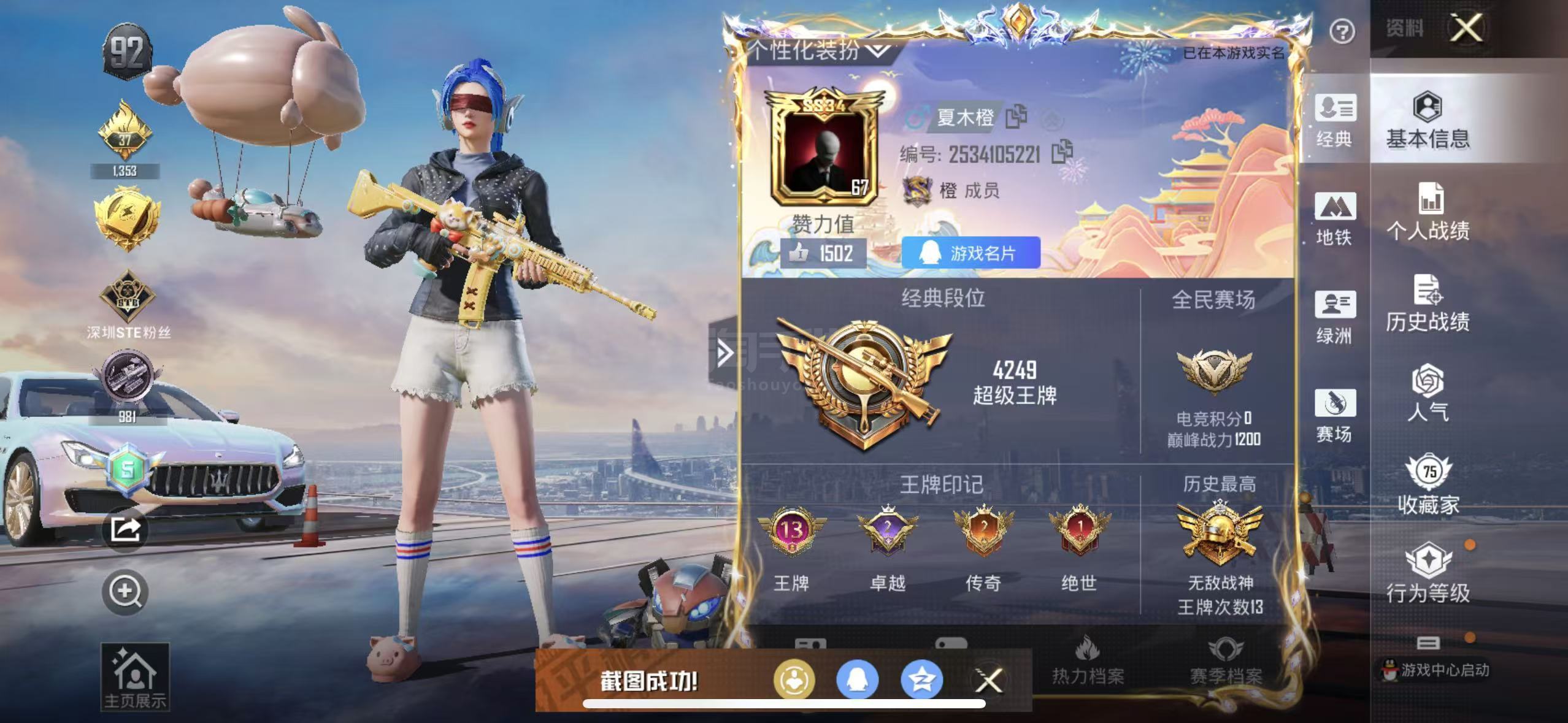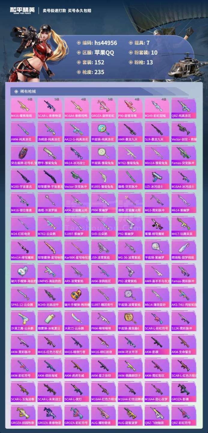 hs44956 苹果手Q-13王牌印记-有战神框-10粉装-13特效枪-7载具-85531热力值-1