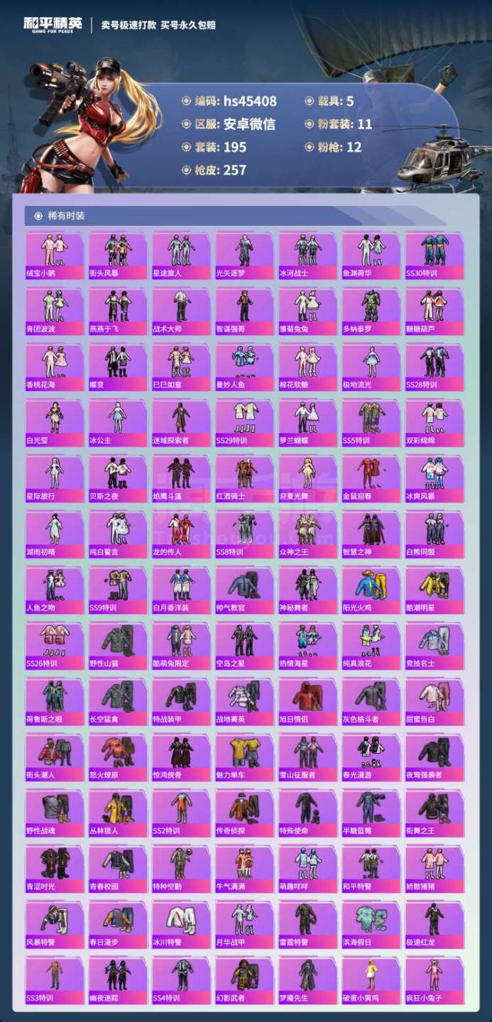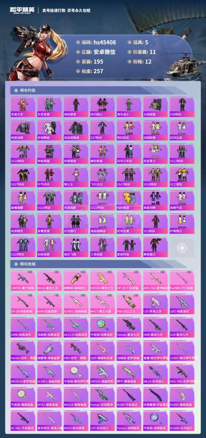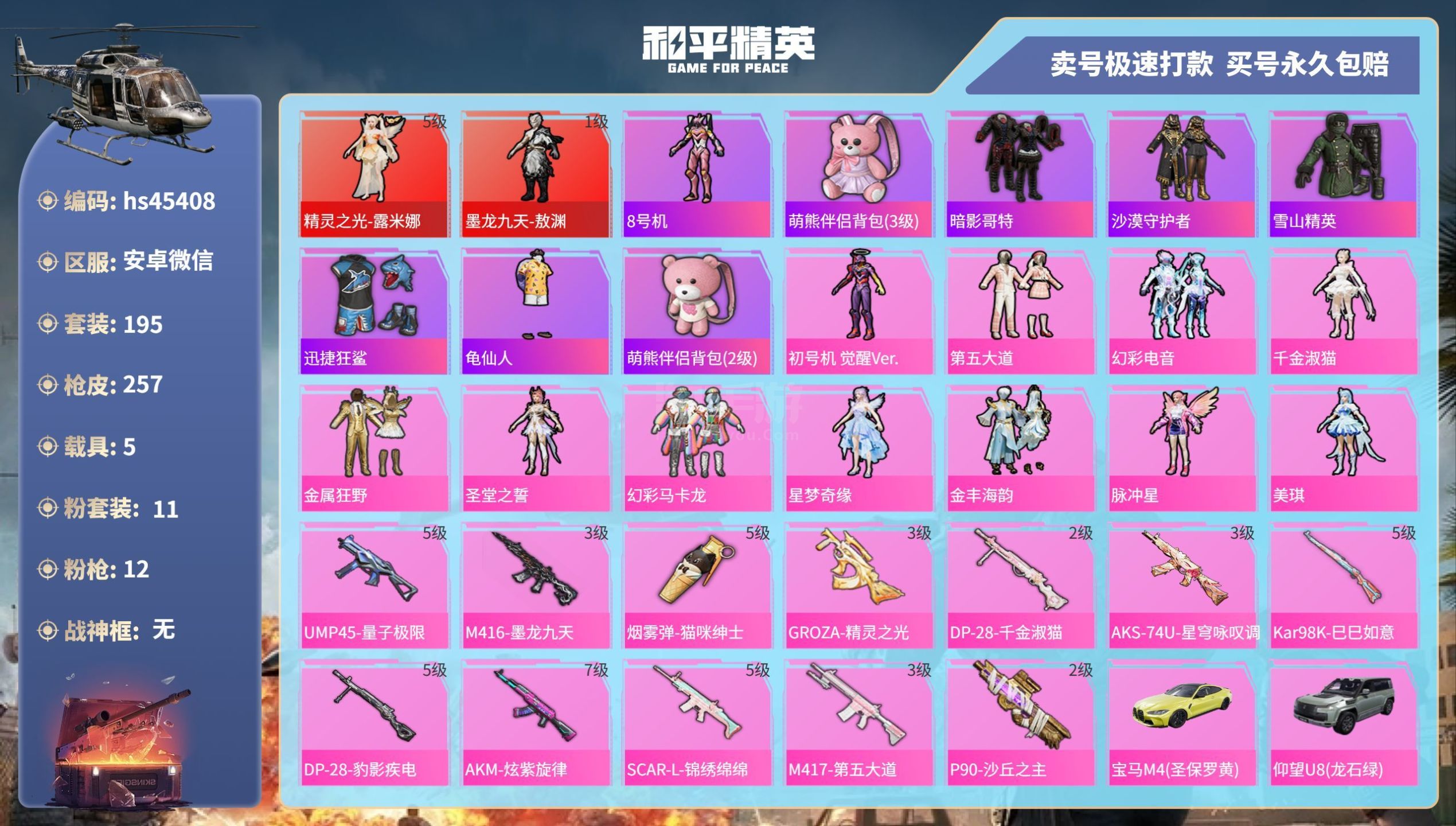 hs45408 安卓微-13王牌印记-11粉装-12特效枪-5载具-102353热力值-195套装