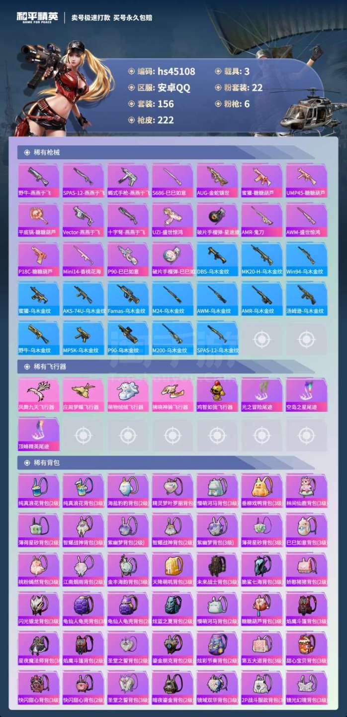 hs45108 安卓手Q-9王牌印记-22粉装-6特效枪-3载具-77609热力值-156套装-22