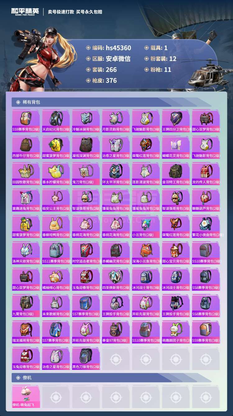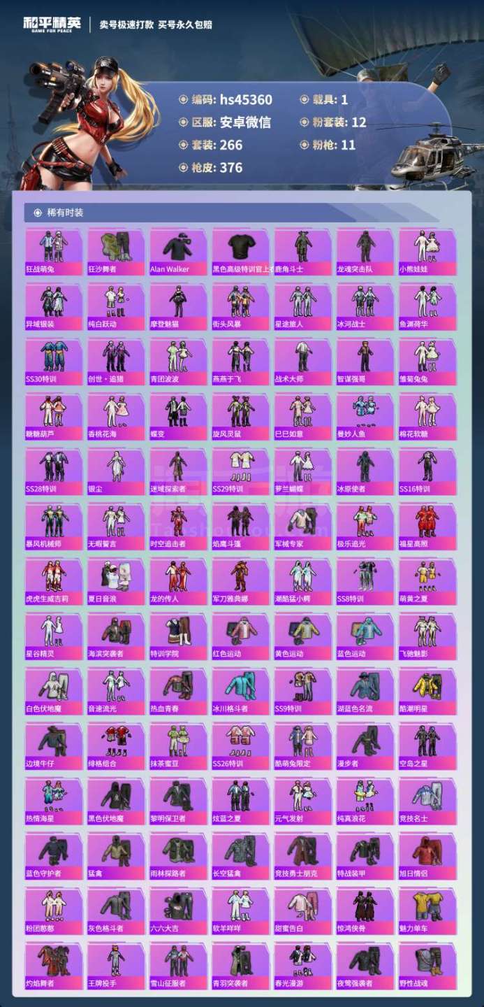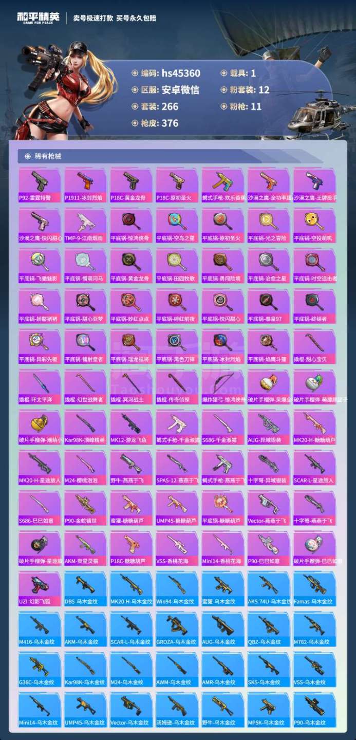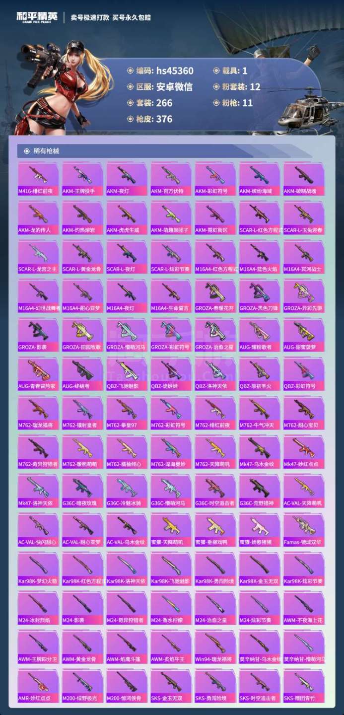 hs45360 安卓微-18王牌印记-12粉装-11特效枪-1载具-122953热力值-266套装