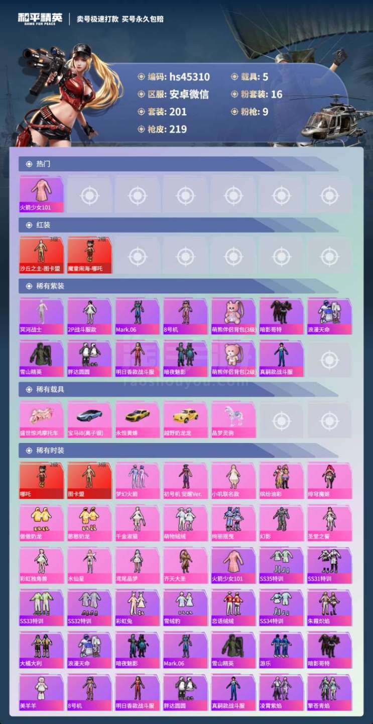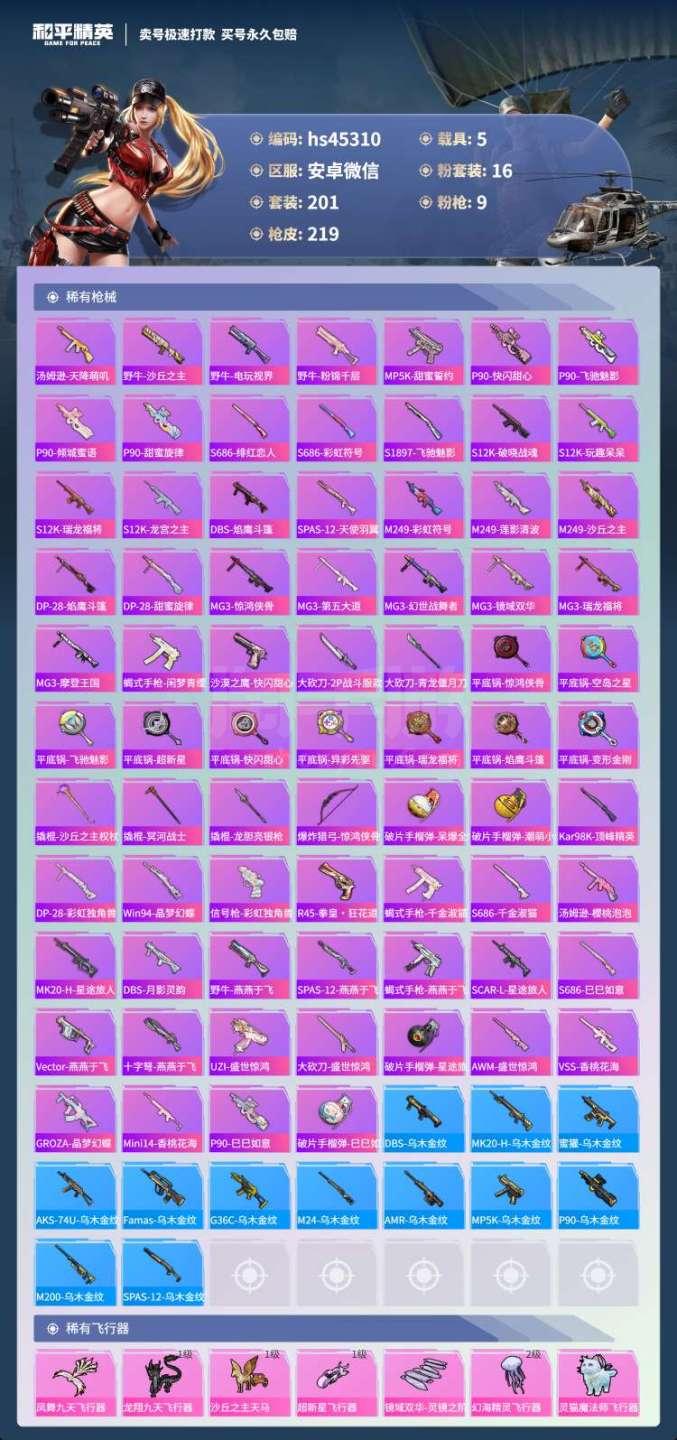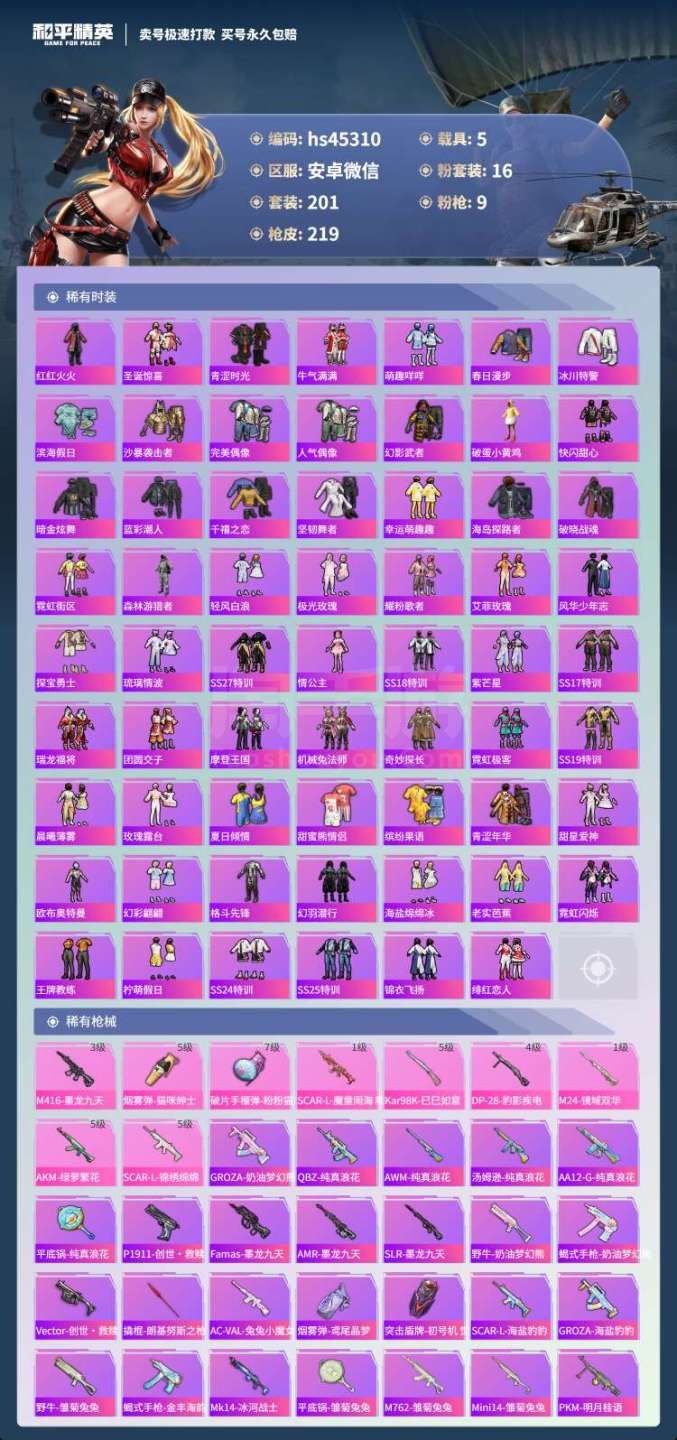 hs45310 安卓v-6王牌印记-16粉装-9特效枪-5载具-88977热力值-201套装-21