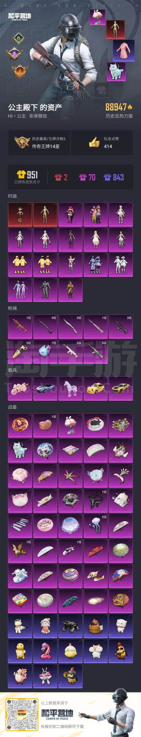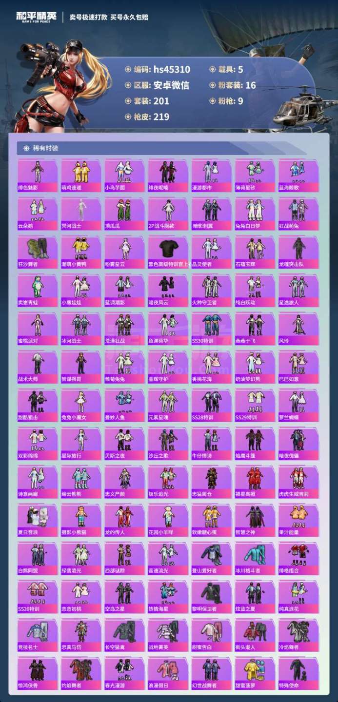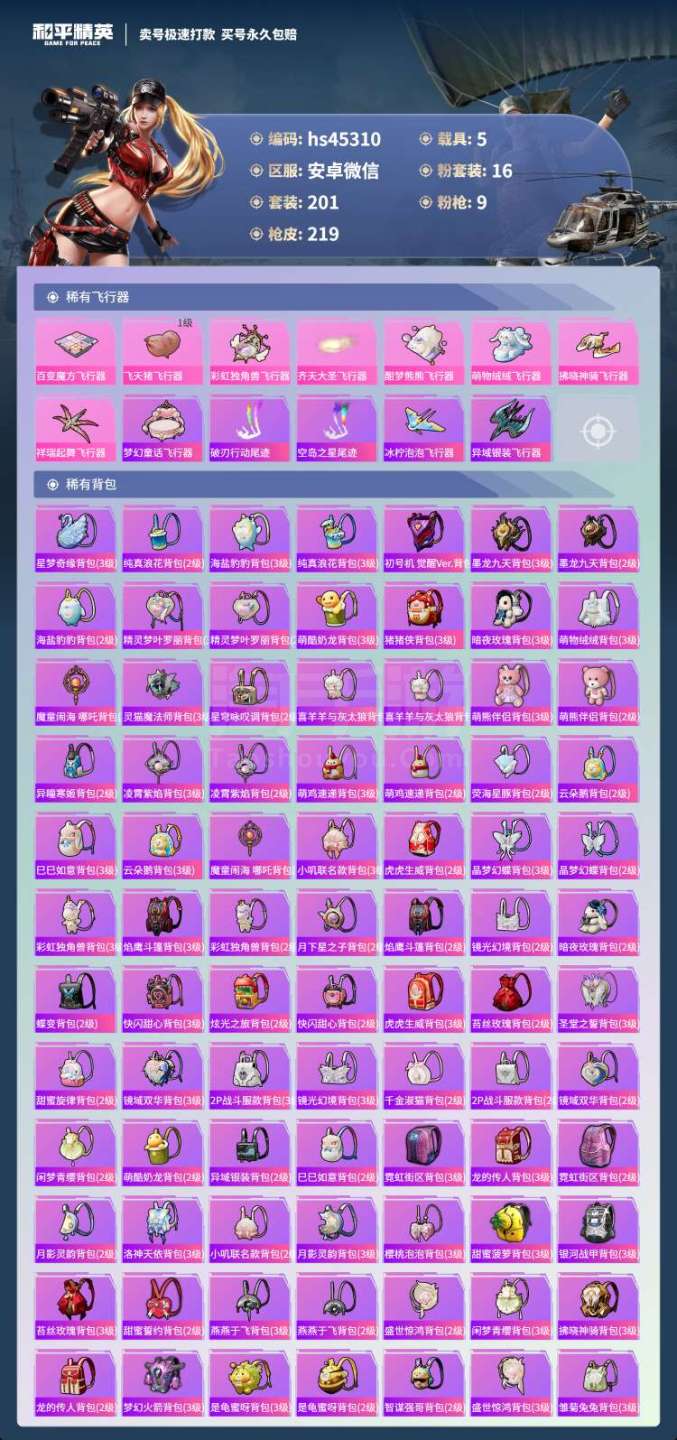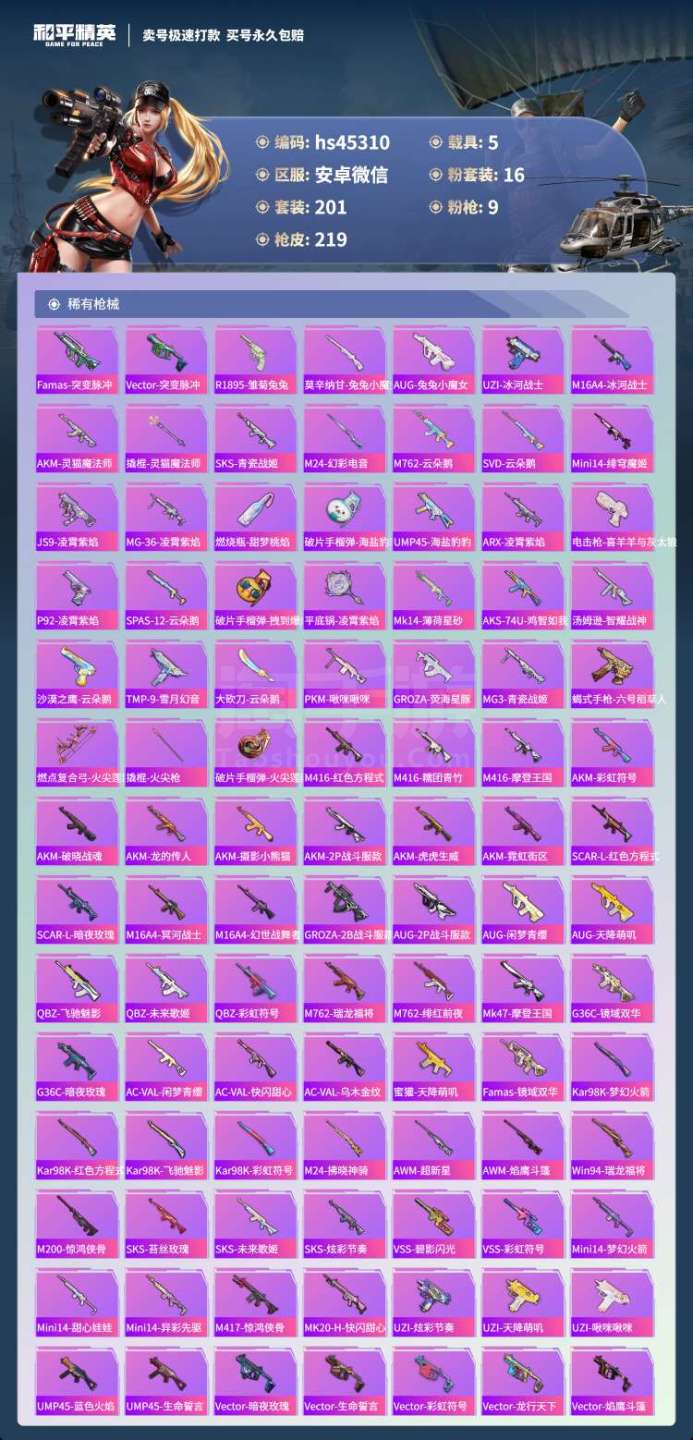 hs45310 安卓v-6王牌印记-16粉装-9特效枪-5载具-88977热力值-201套装-21