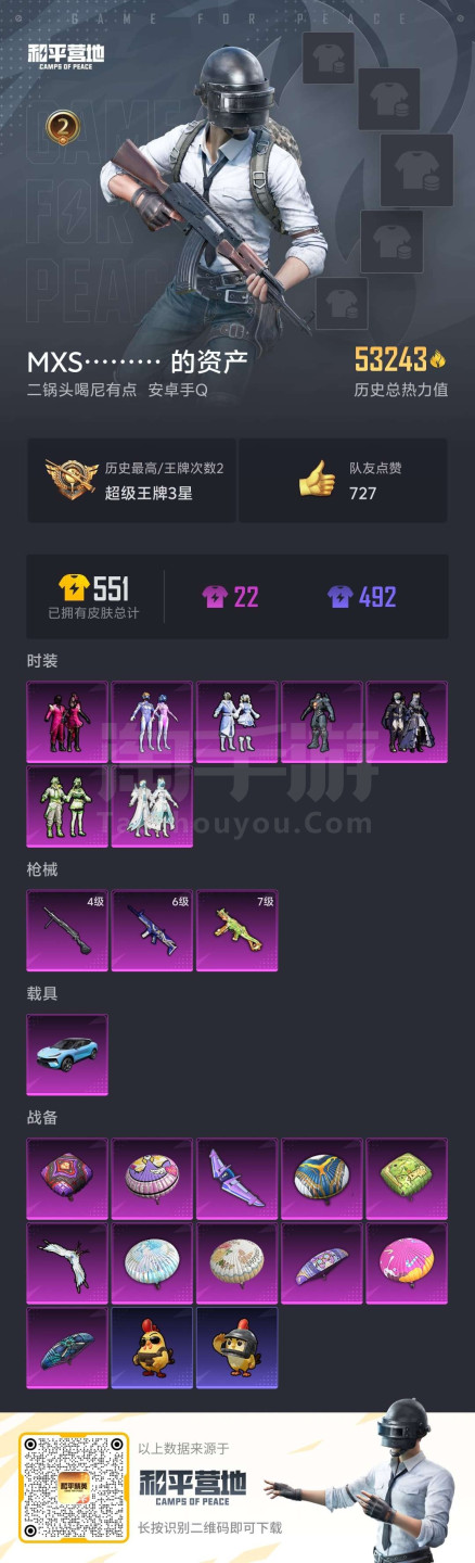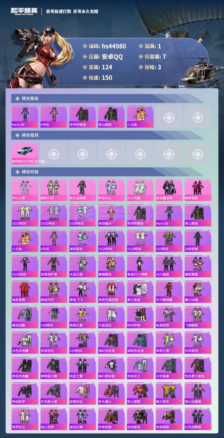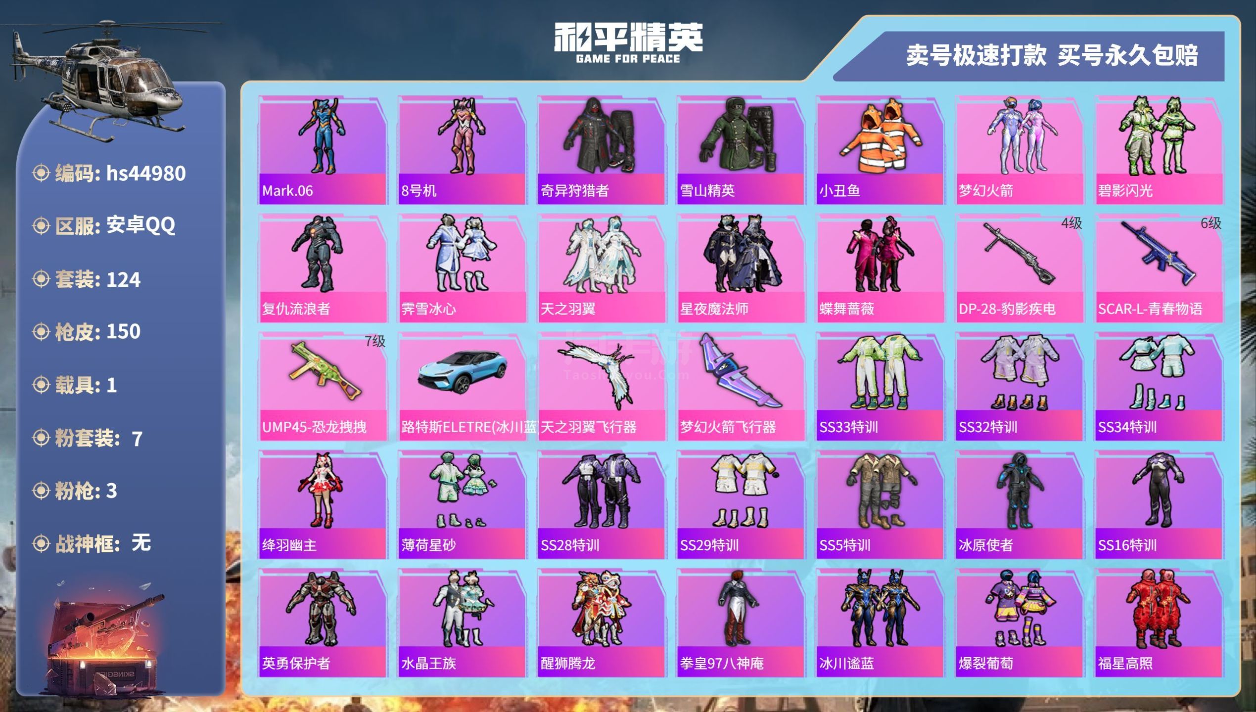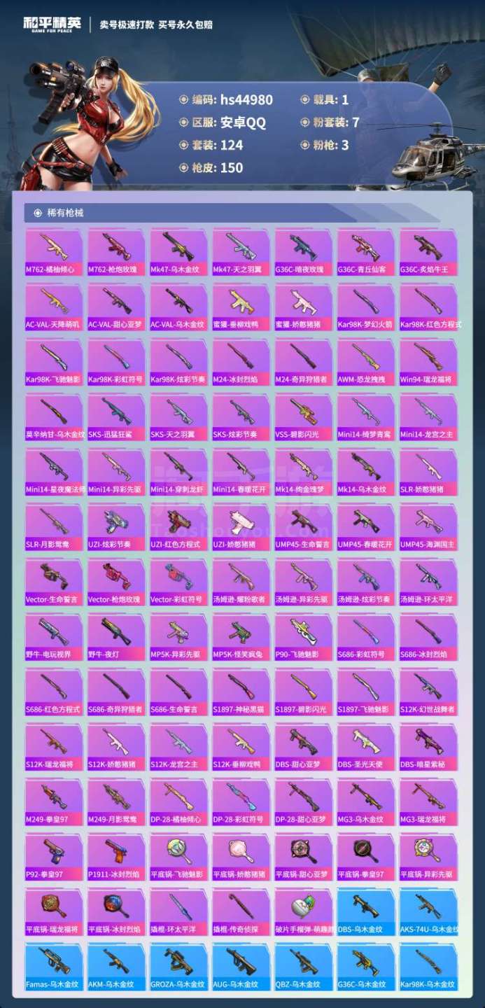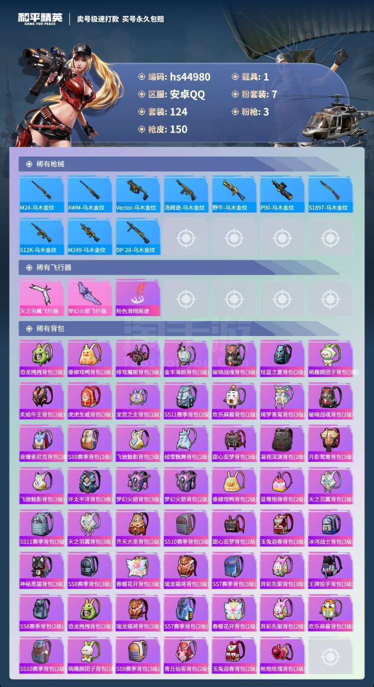 hs44980 安卓手Q-2王牌印记-7粉装-3特效枪-1载具-53243热力值-124套装-150