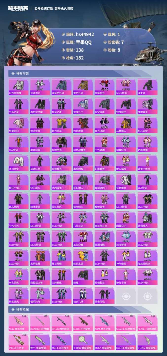 hs44942 苹果手Q-6王牌印记-7粉装-8特效枪-1载具-63771热力值-138套装-182