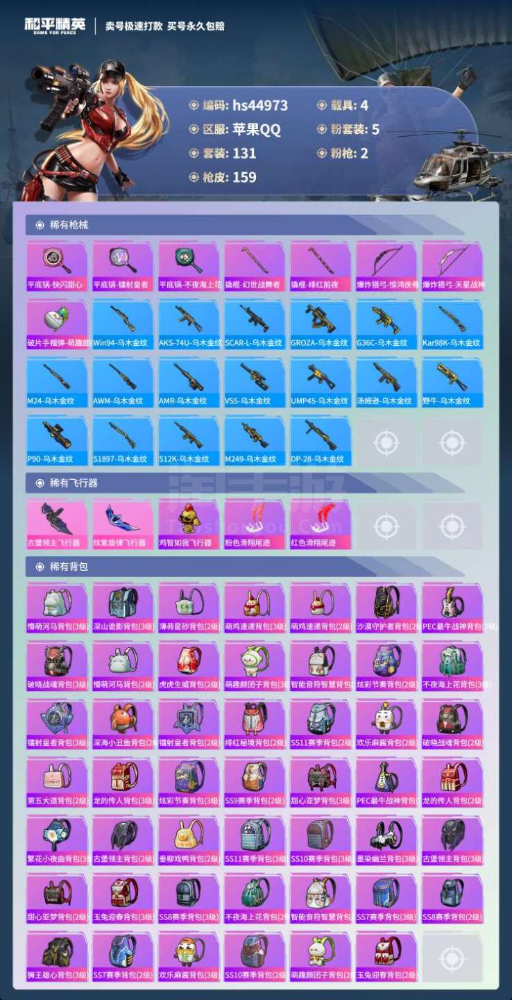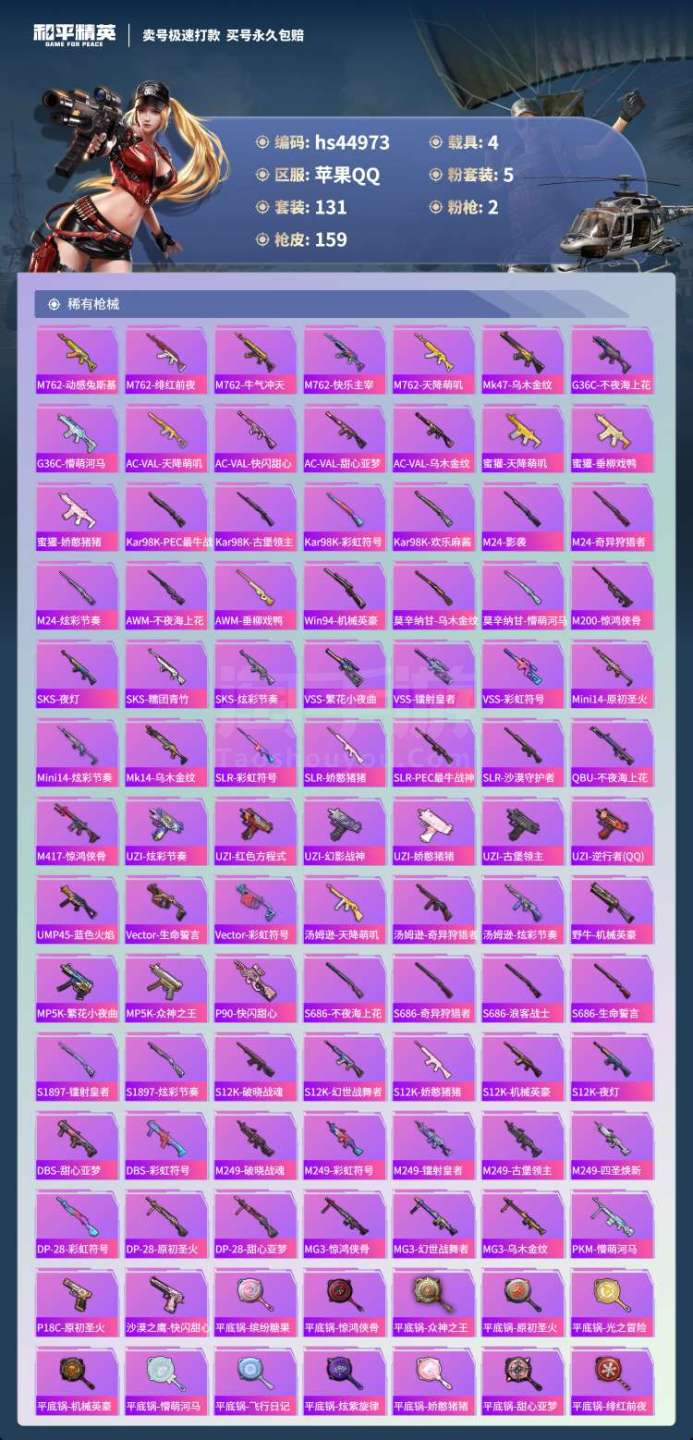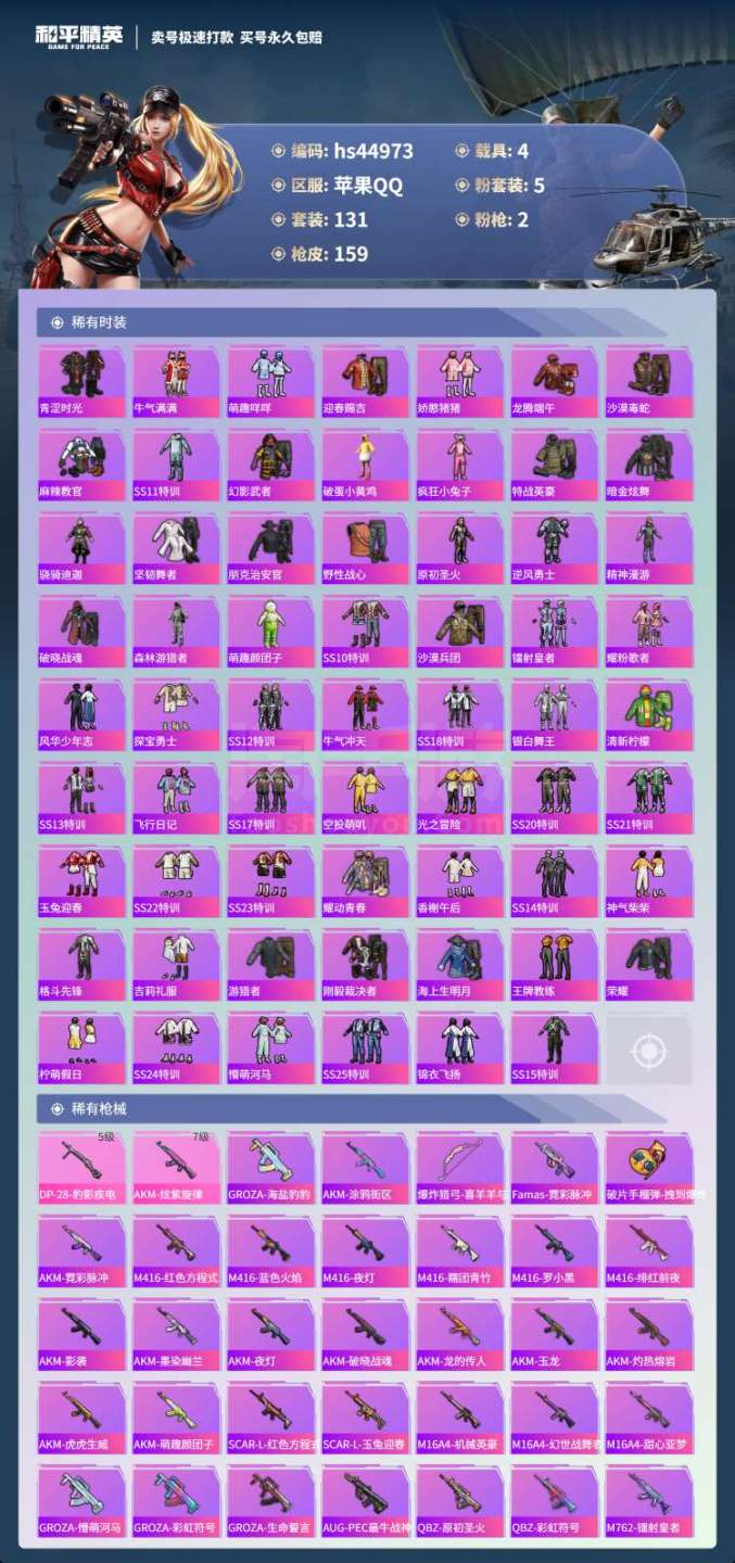 hs44973 苹果手Q-6王牌印记-5粉装-2特效枪-4载具-54239热力值-131套装-159
