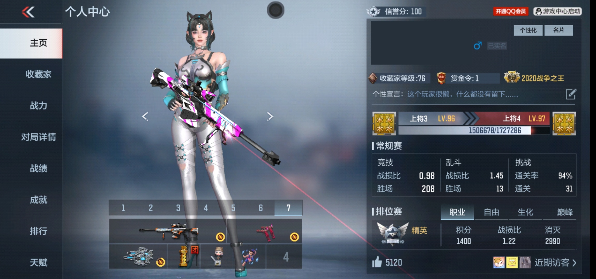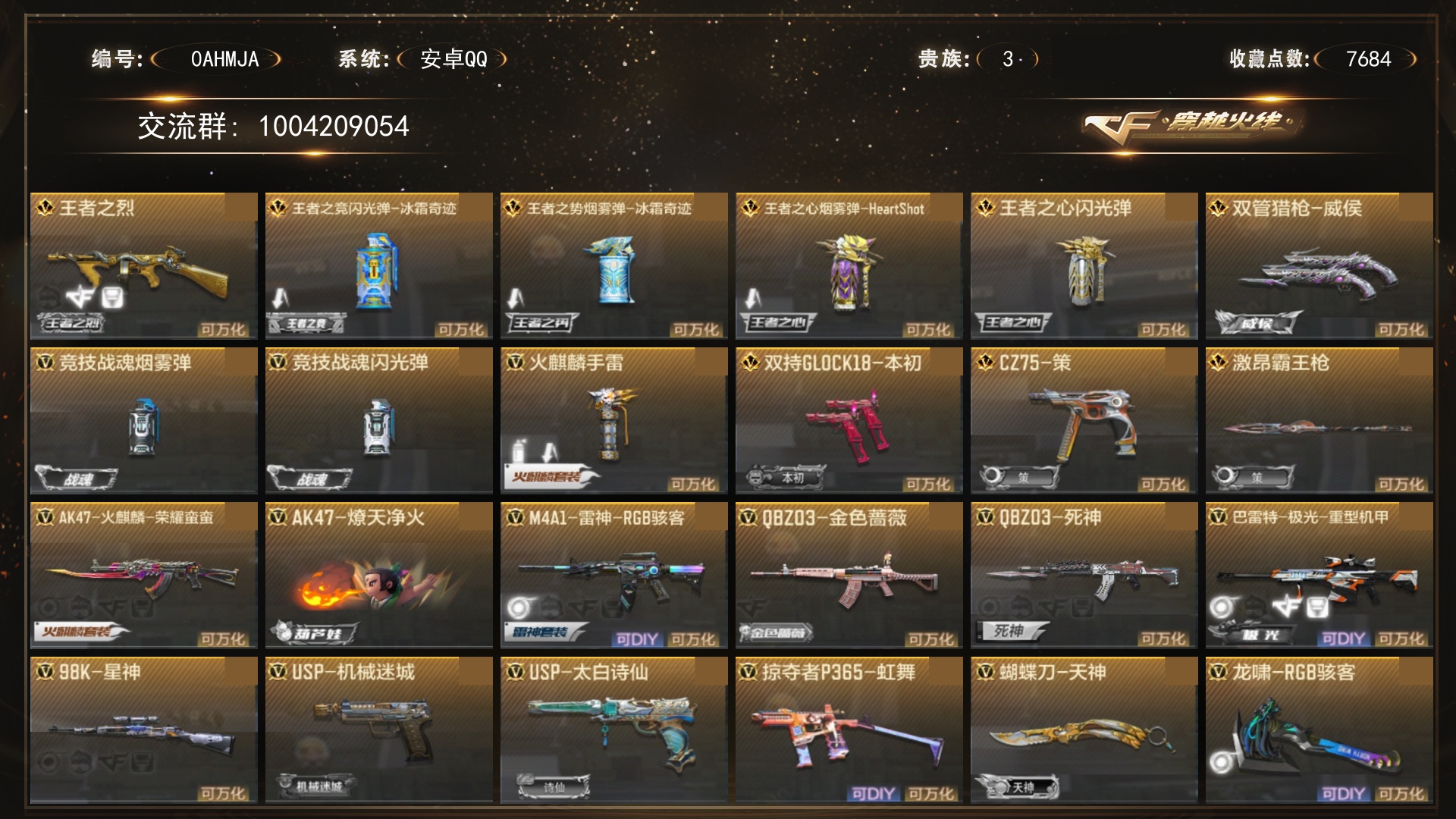 穿越火线-枪战王者(CFM)-安卓QQ 等级96, 信誉分100, 贵族等级3, 收藏点数7684, 王者武器数量5, 英雄武器数量118 【武器】 武器-王者之烈, 武器-双管猎枪-威侯, 武器-98K-星神, 武器-9A91-魔蜥觉醒, 武器-AA12-火药觉醒, 武器-AK12-天启, 武器-AK47-幸运日, 武器-AK47-无影, 武器-AK47-木兰, 武器-AK47-樱斗士-一觉,
