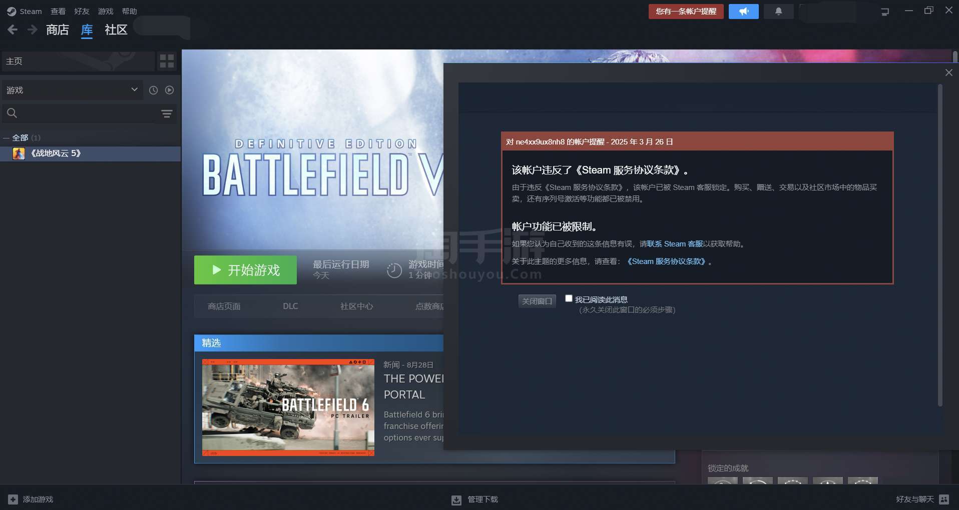 Steam账号【全服通用】战地风云5成品号,可正常游戏联账,可改绑,可修改密码,可绑定手机,被制了部分功能如图所示