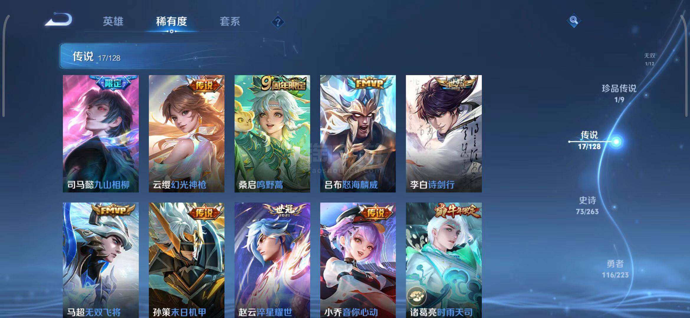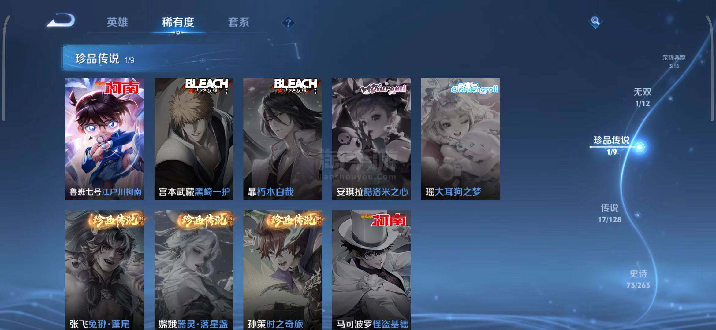 安卓Q-V8-最强王者段位-124英雄-261皮肤-3典藏-0珍品无双-1无双-1珍品传说-17传说
