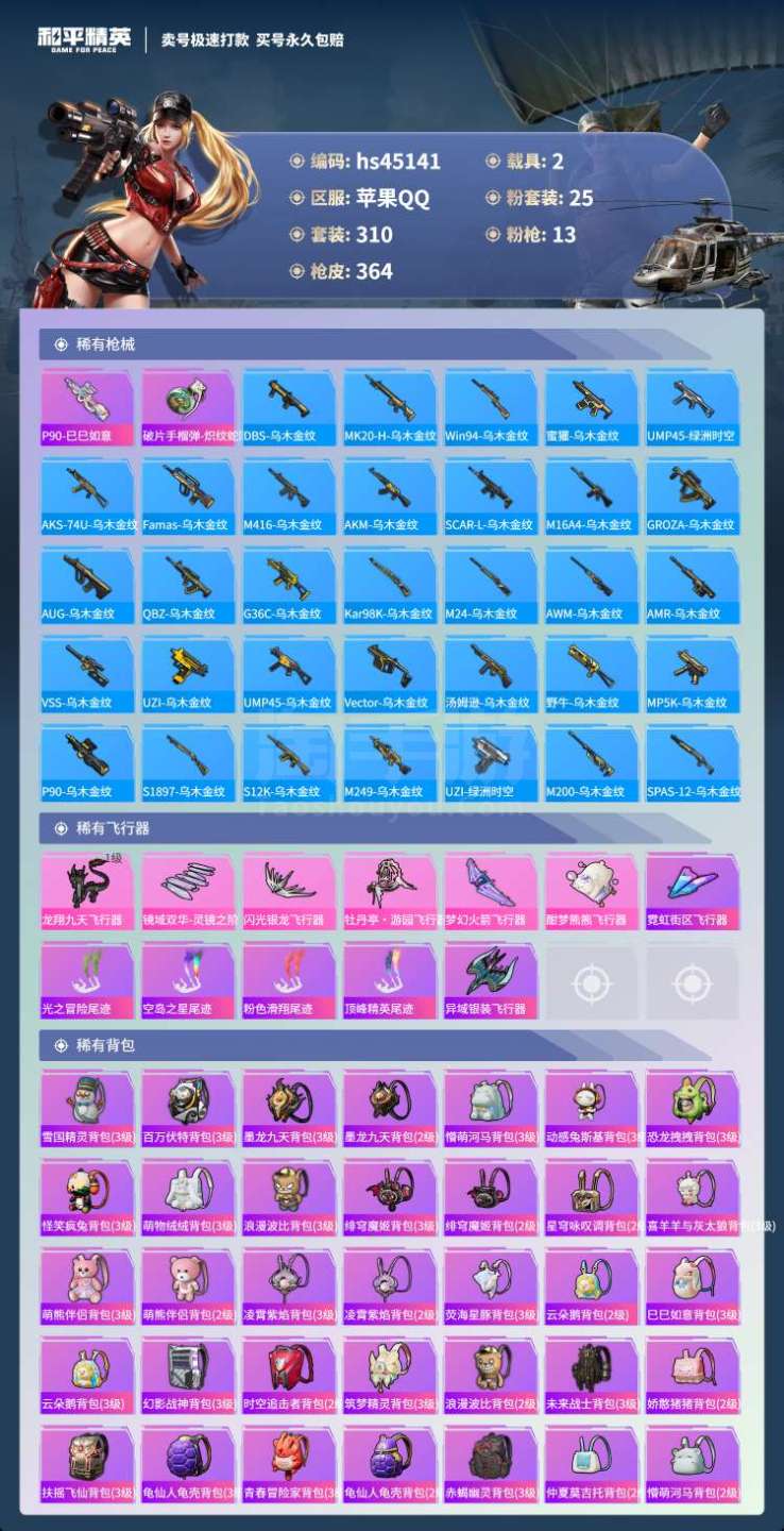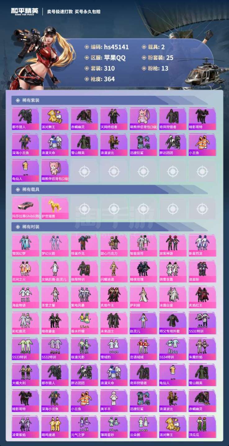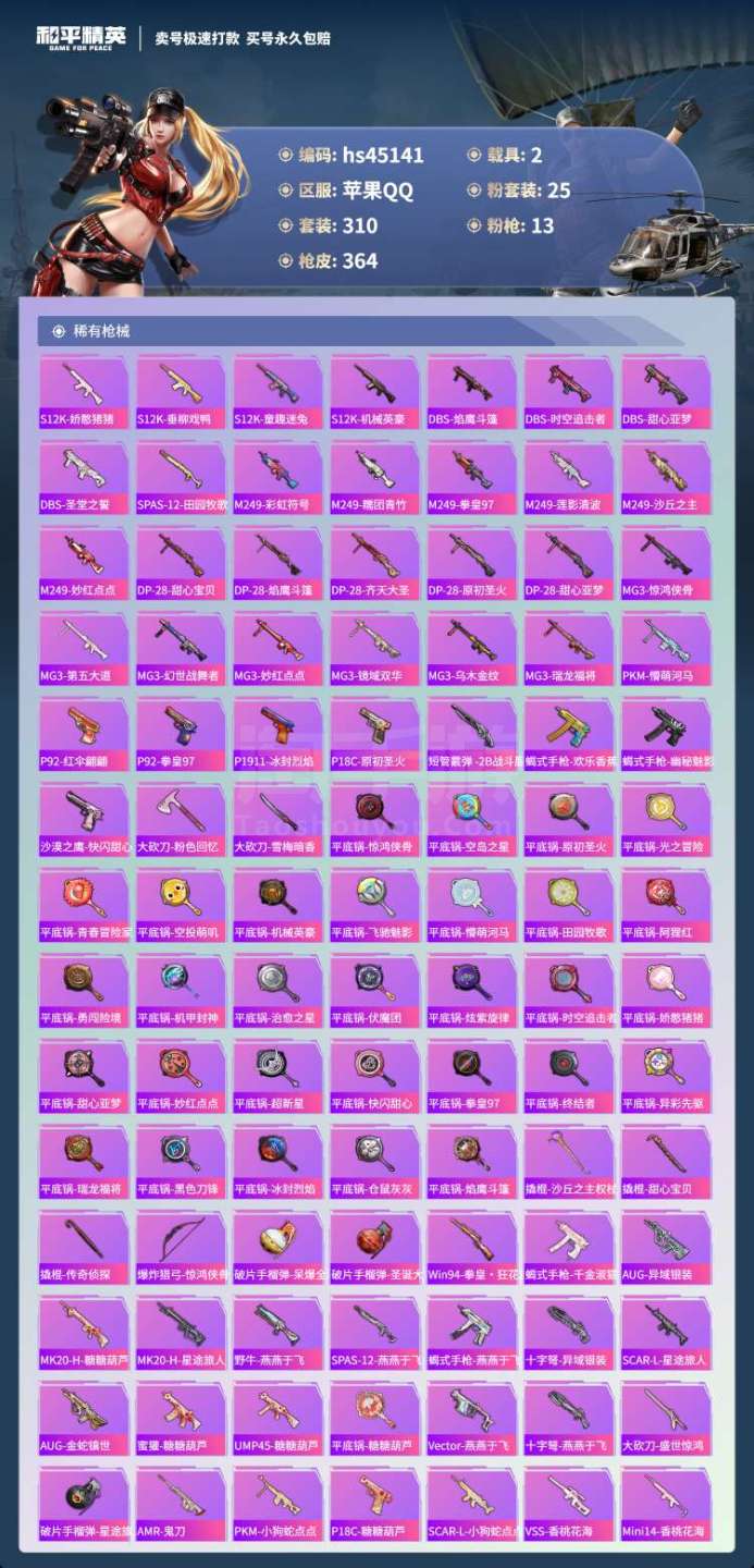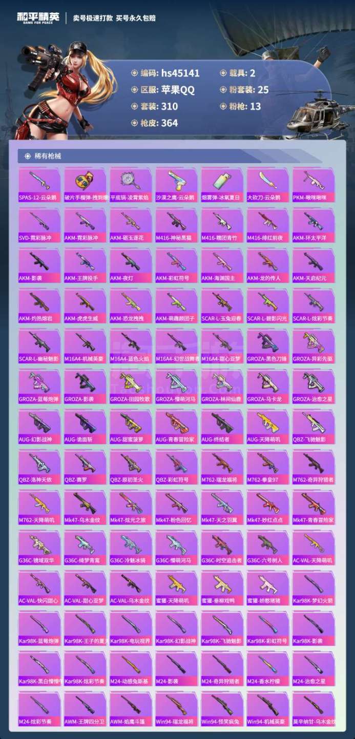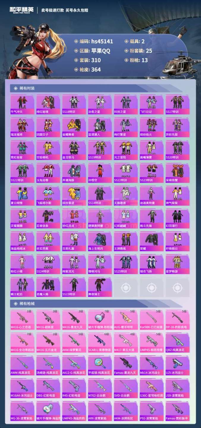hs45141 苹果手Q-16王牌印记-25粉装-13特效枪-2载具-133569热力值-310套装