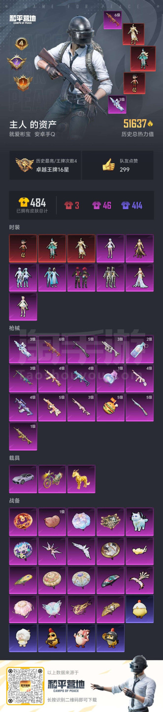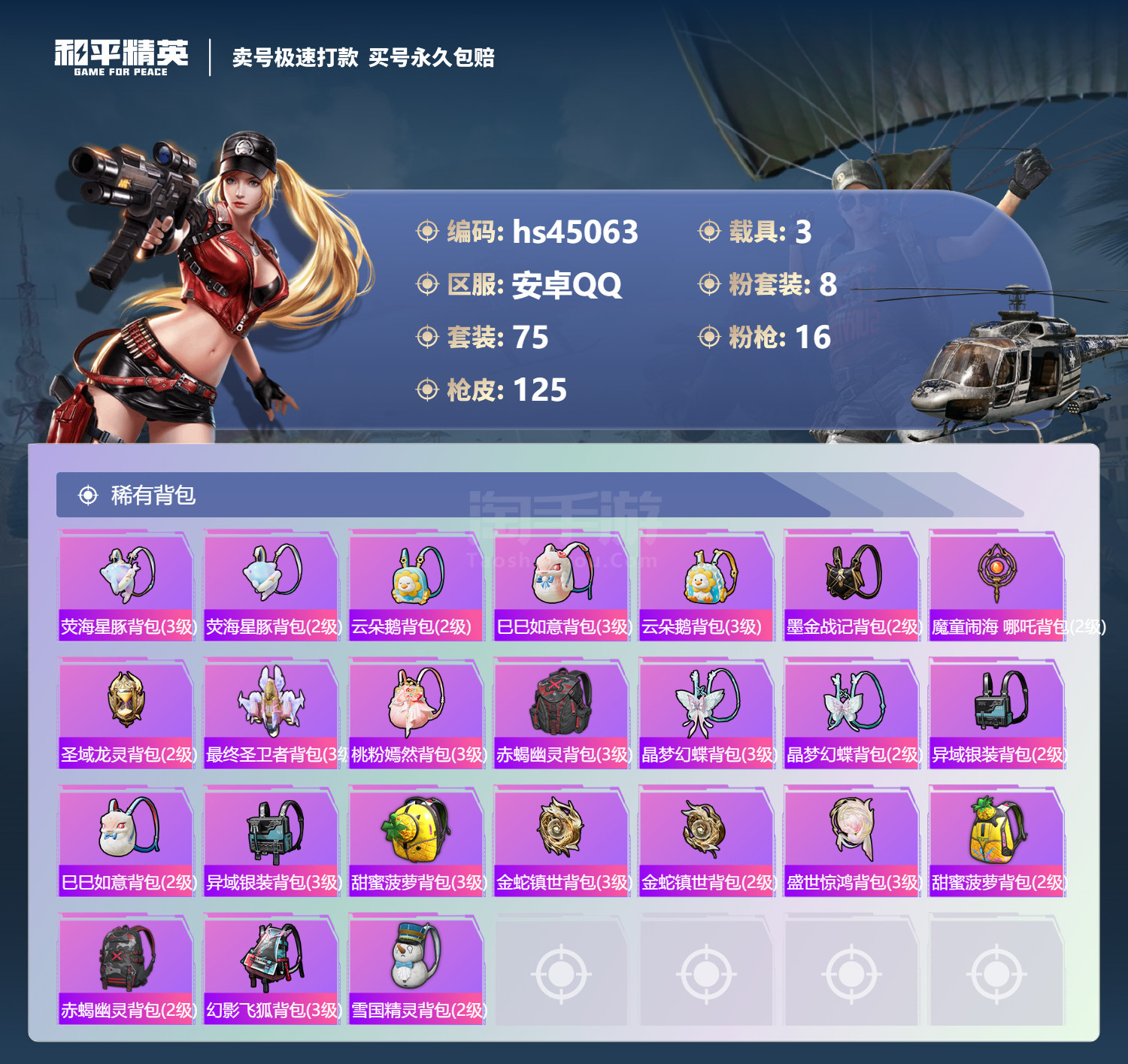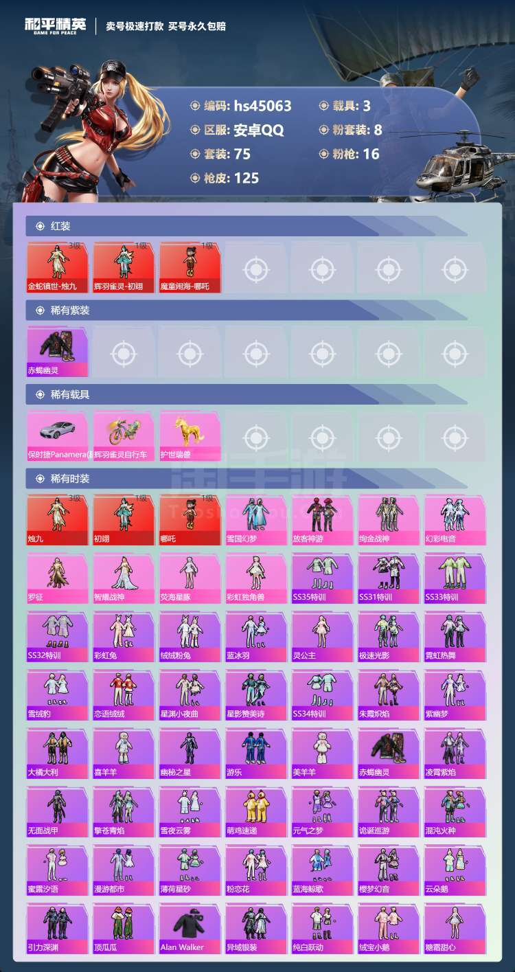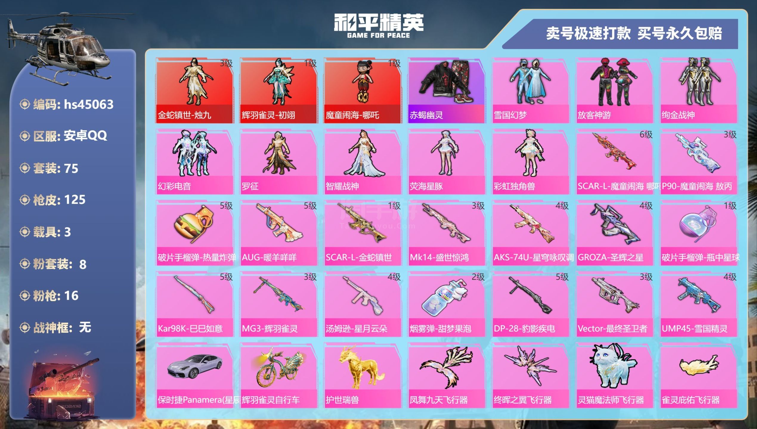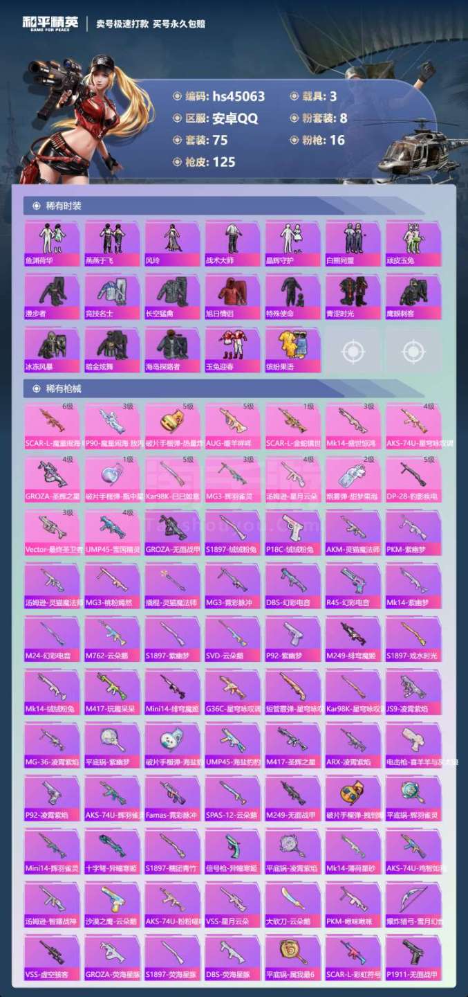 hs45063 安卓手Q-4王牌印记-8粉装-16特效枪-3载具-51682热力值-75套装-125