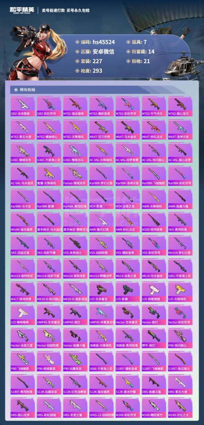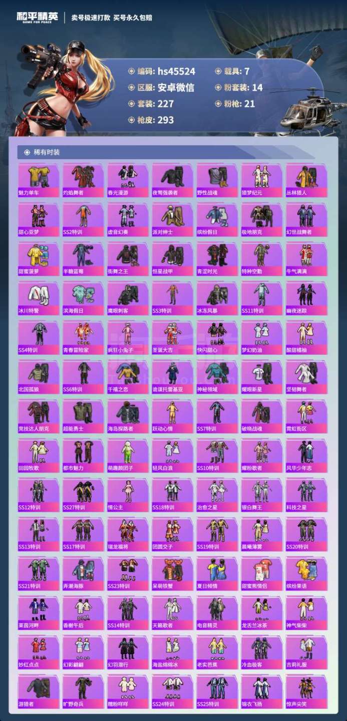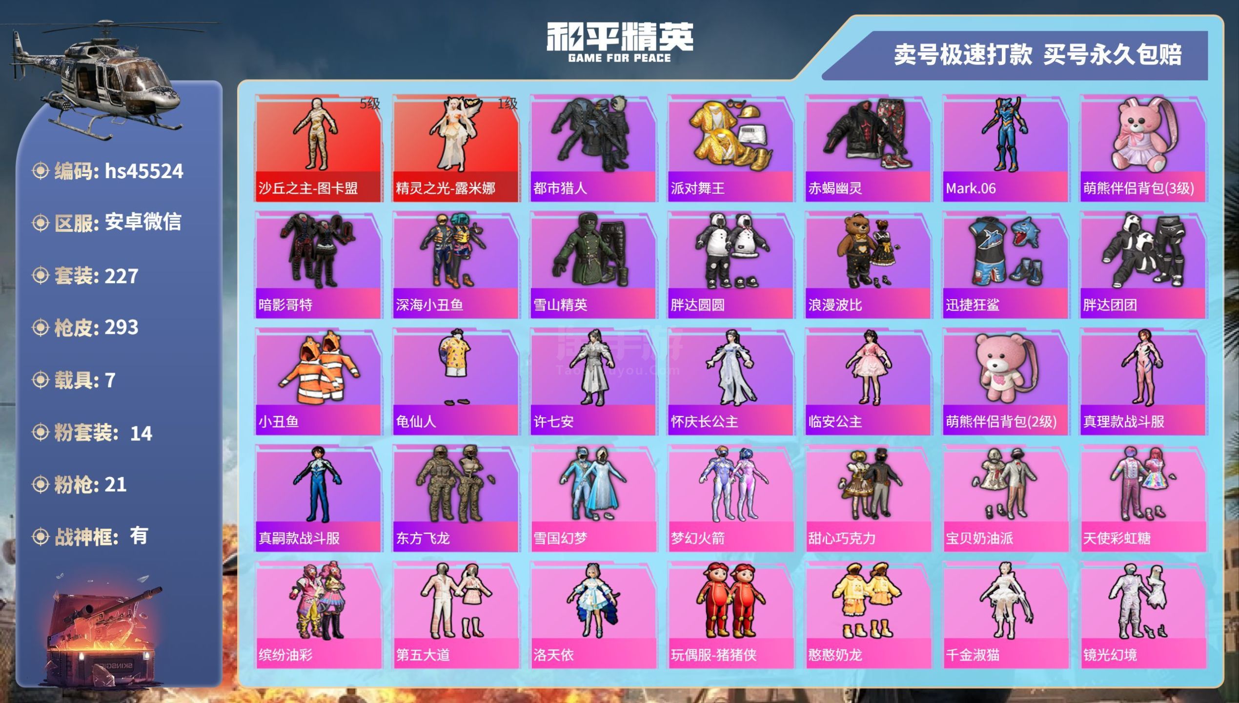 hs45524 安卓微-22王牌印记-有战神框-14粉装-21特效枪-7载具-122879热力值-