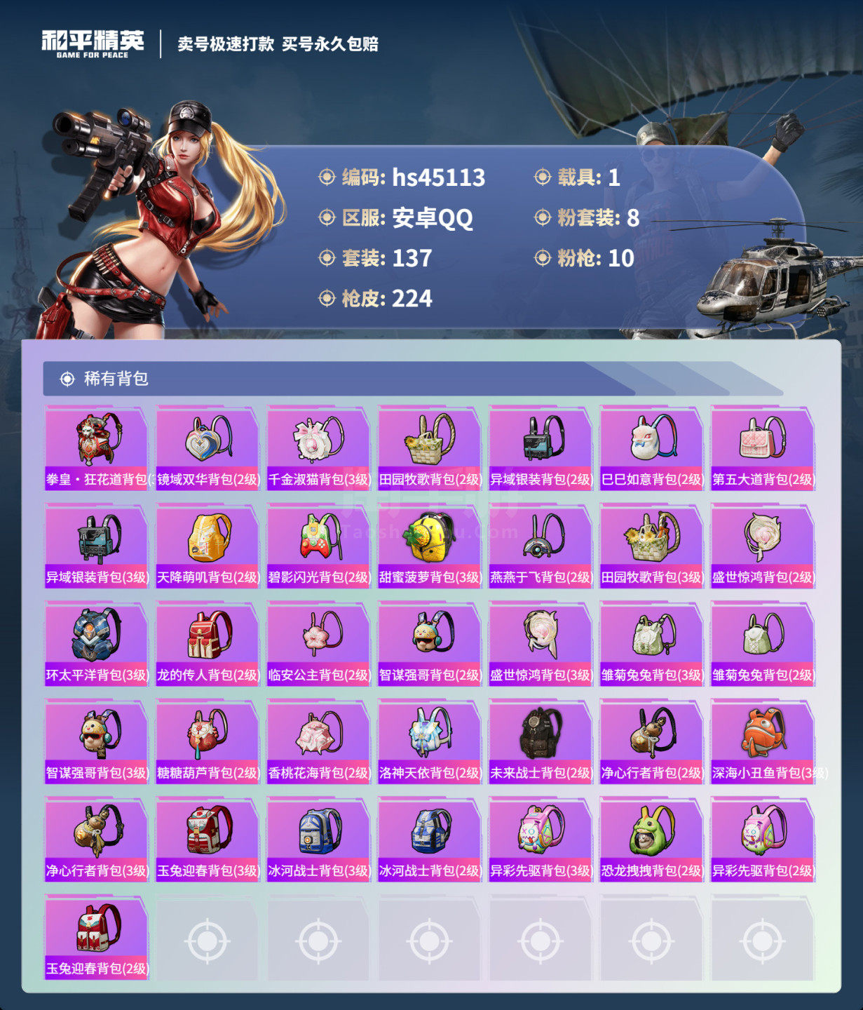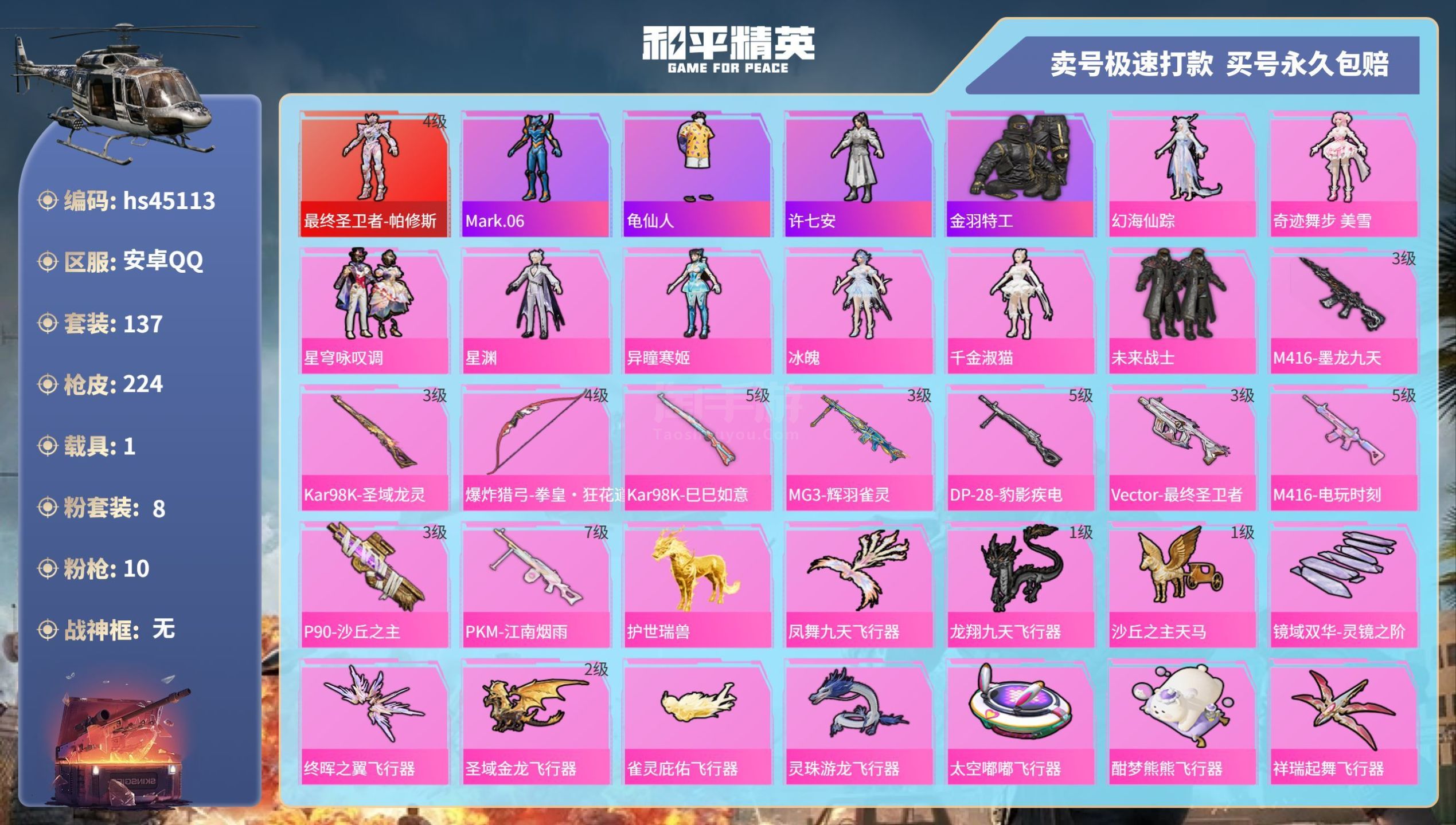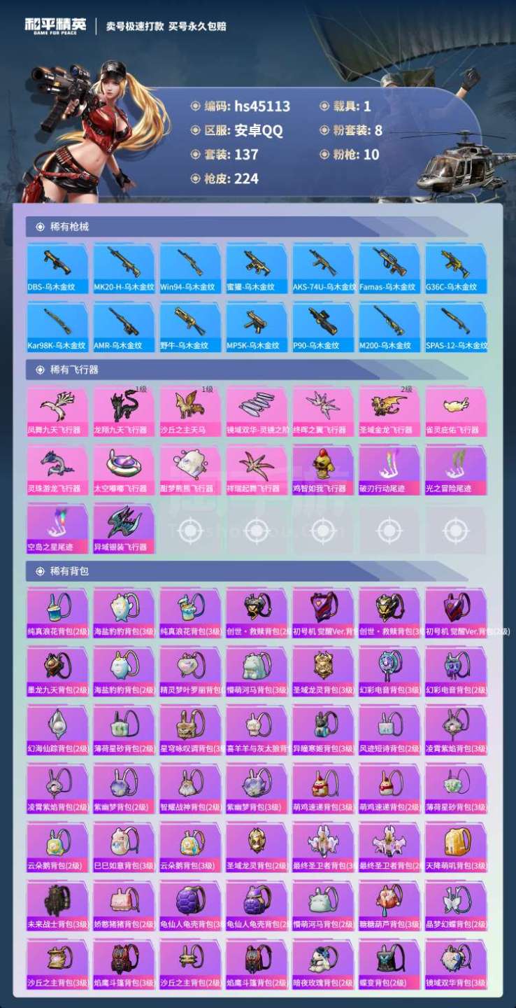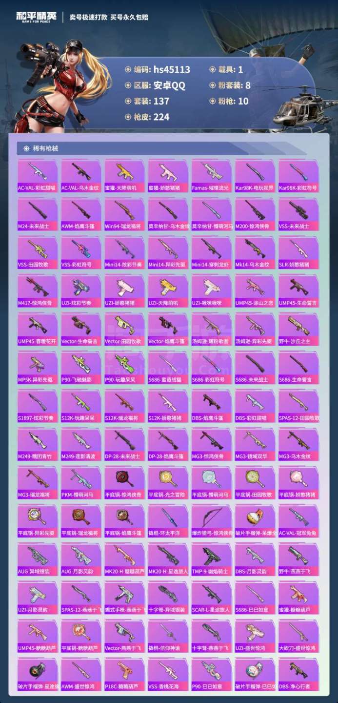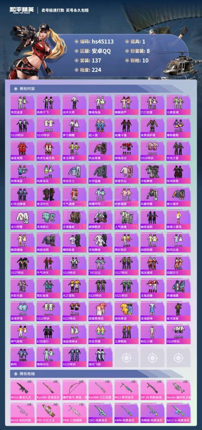 hs45113 安卓手Q-17王牌印记-8粉装-10特效枪-1载具-74943热力值-137套装-2