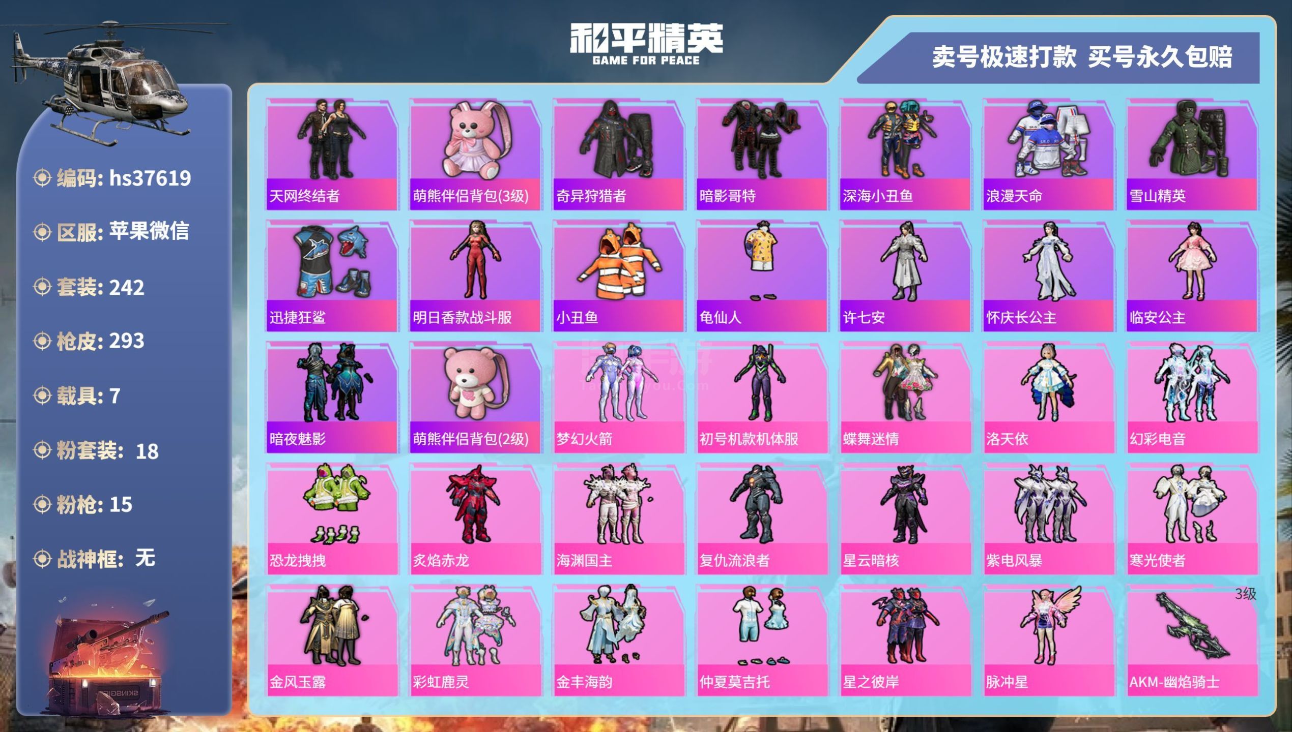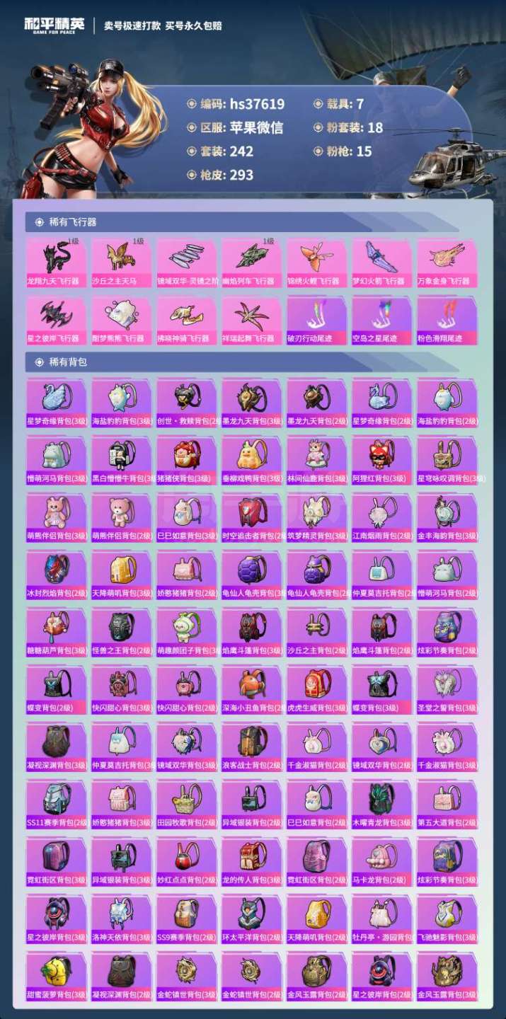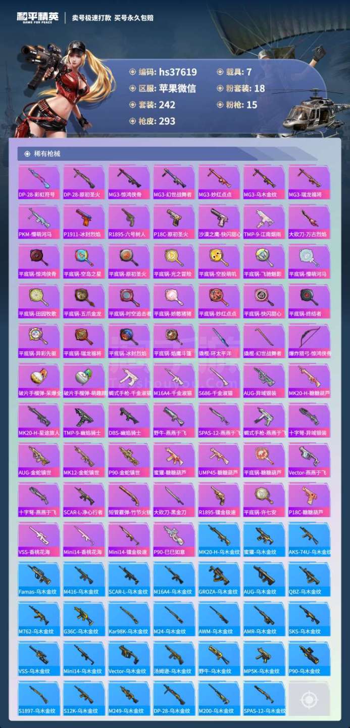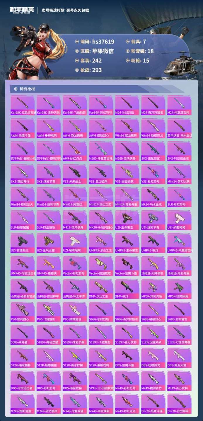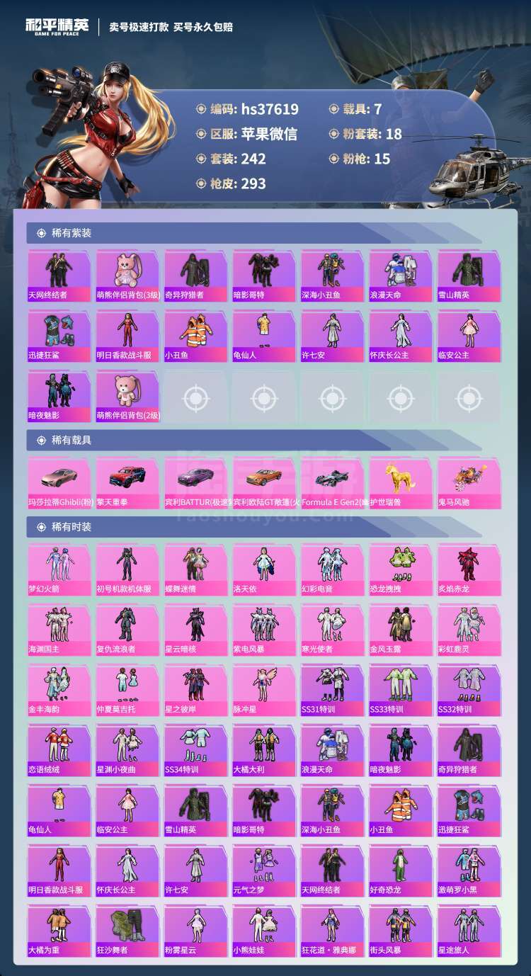 hs37619 苹果微-17王牌印记-18粉装-15特效枪-7载具-114015热力值-242套装