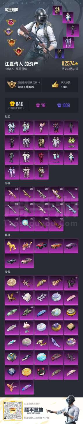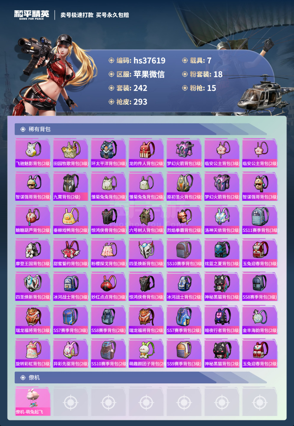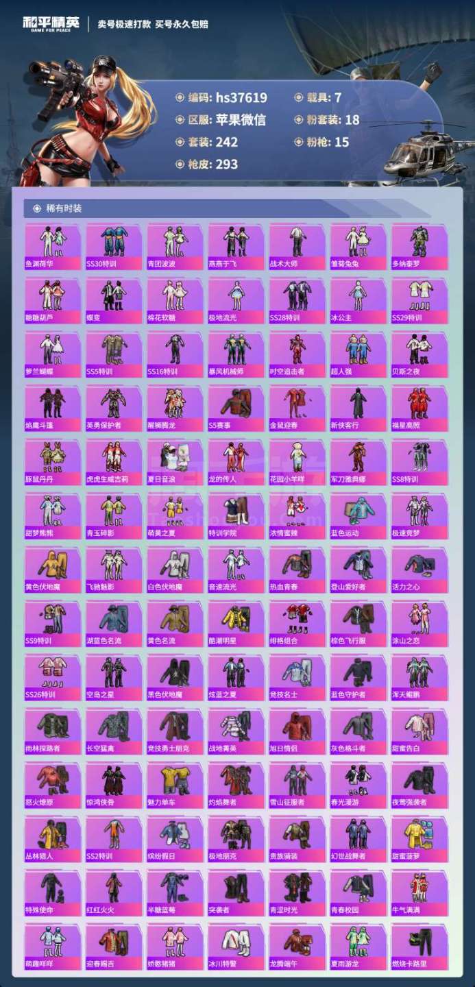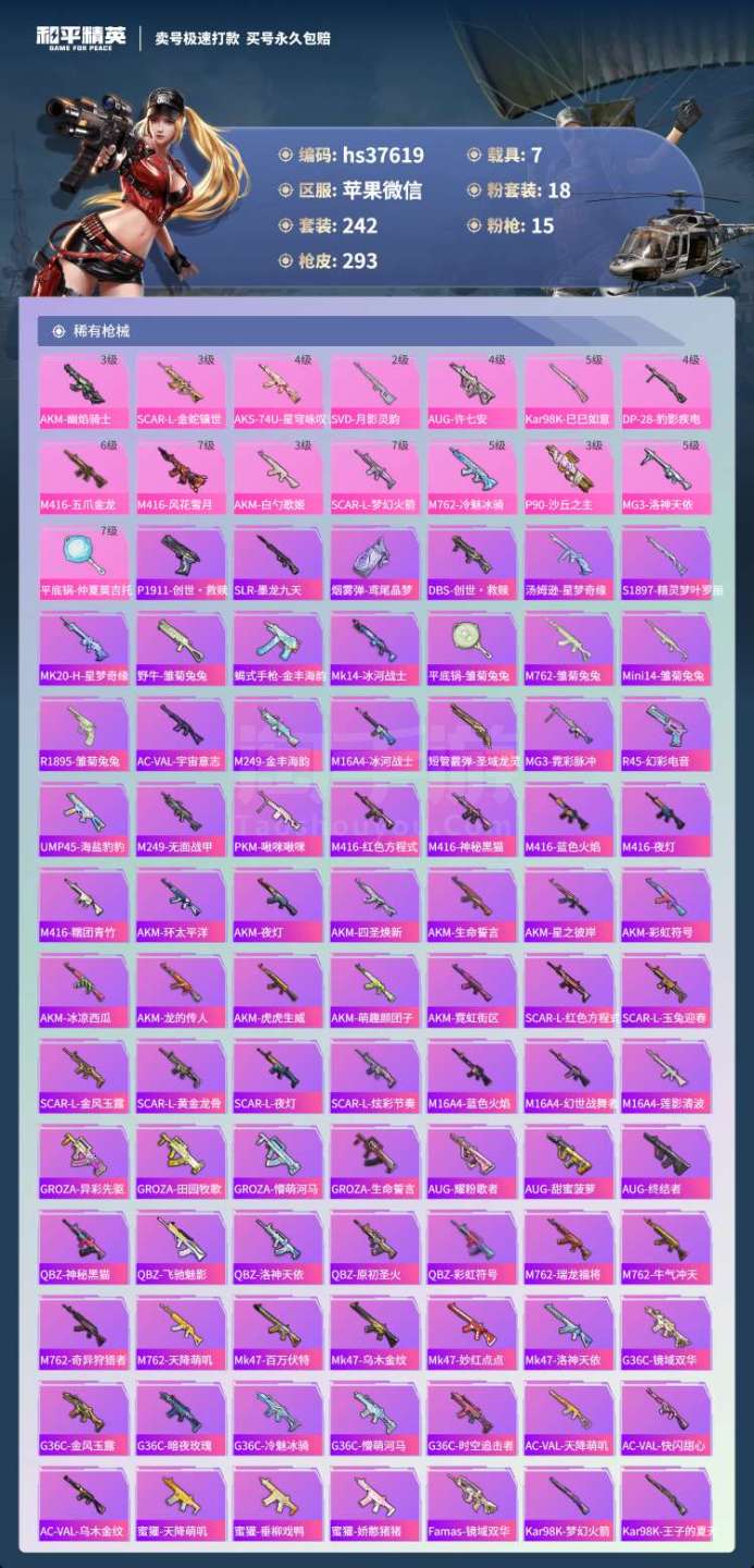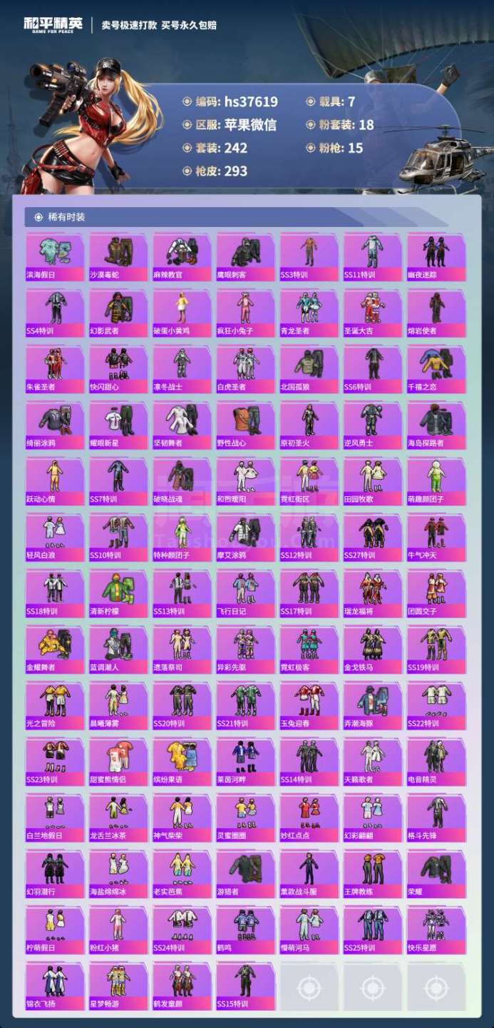 hs37619 苹果微-17王牌印记-18粉装-15特效枪-7载具-114015热力值-242套装