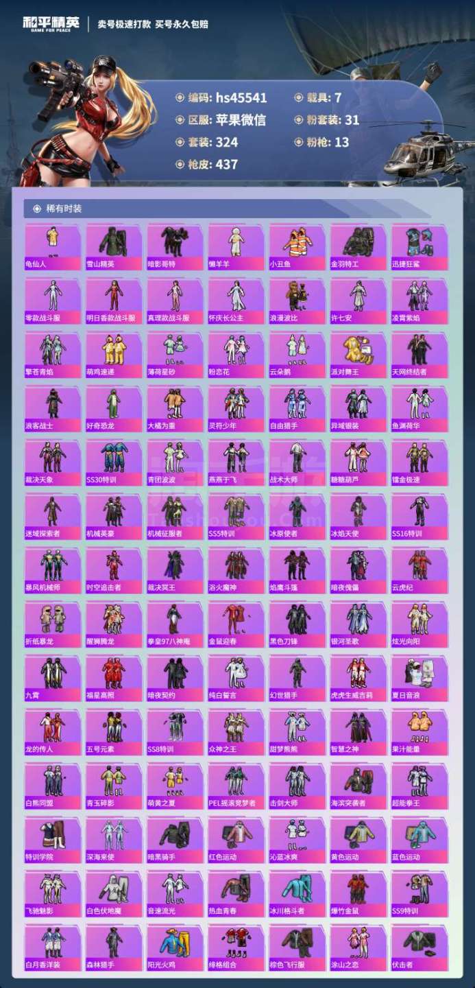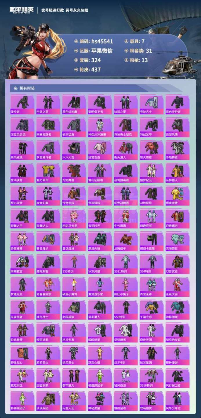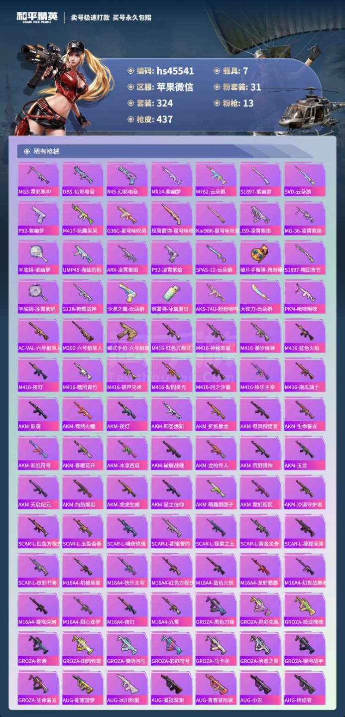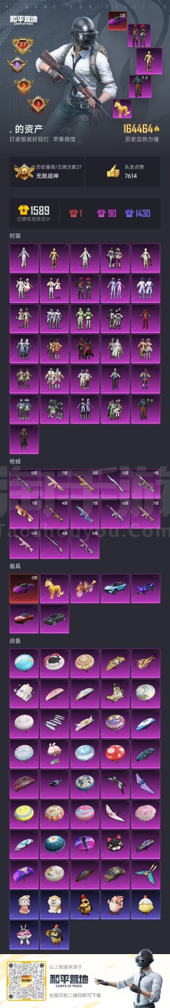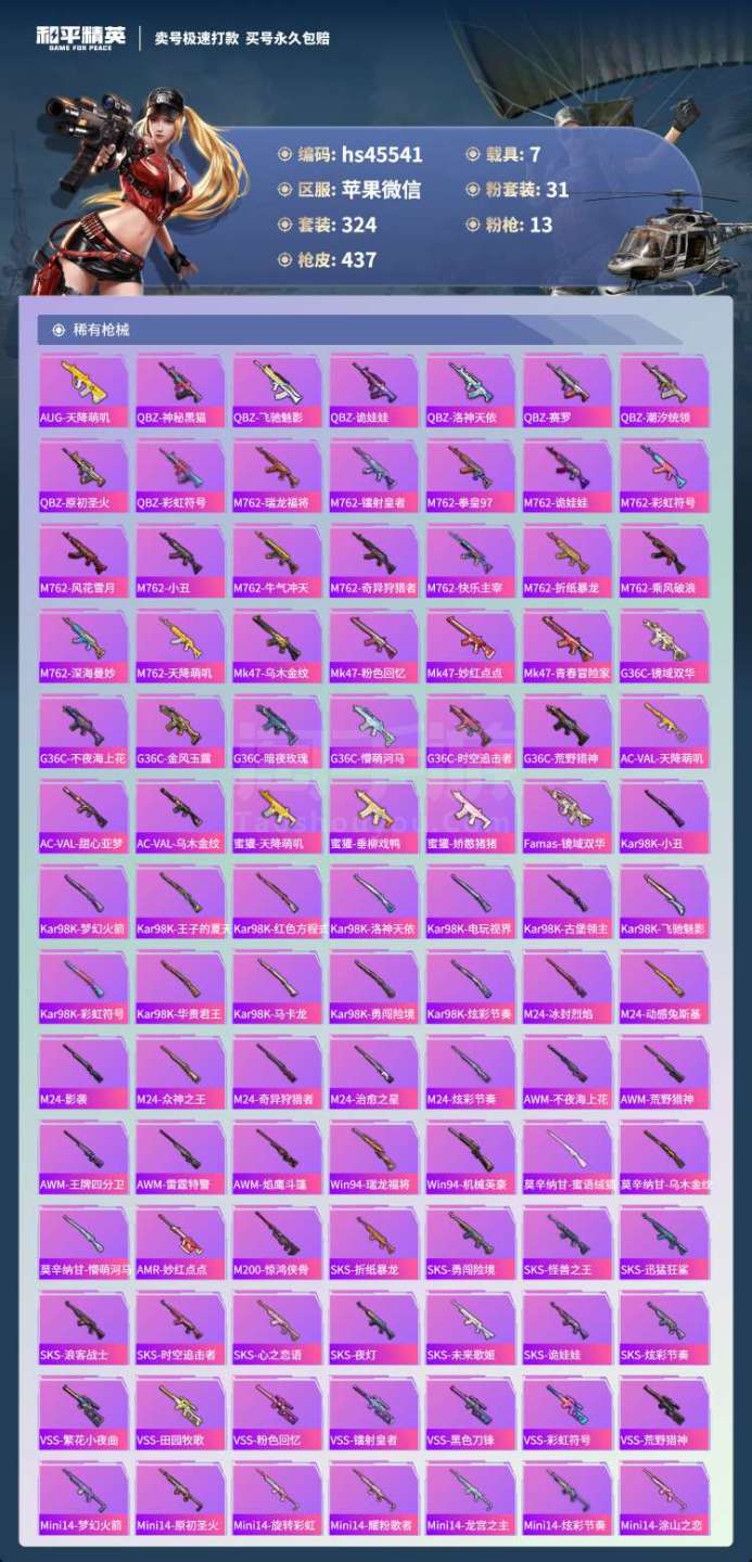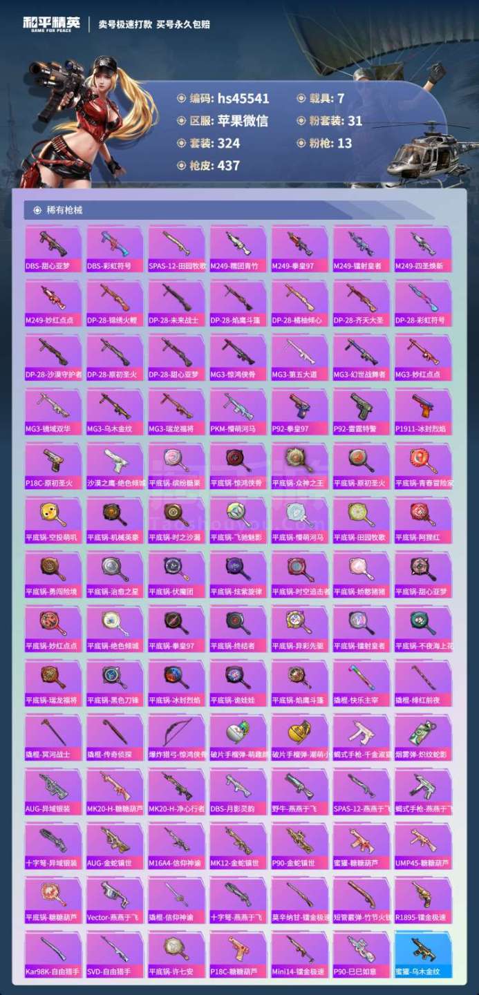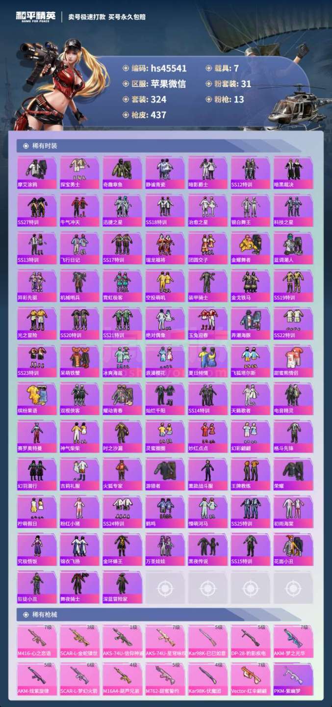 hs45541 苹果微-27王牌印记-有战神框-31粉装-13特效枪-7载具-164464热力值-