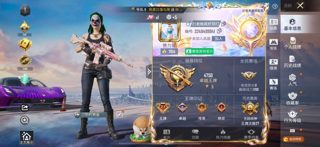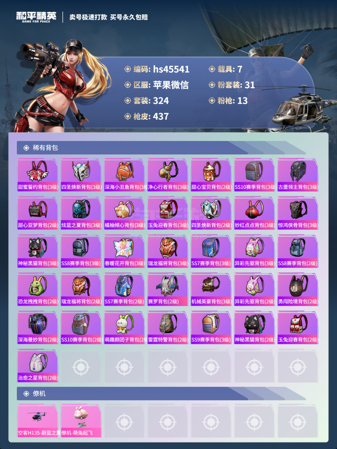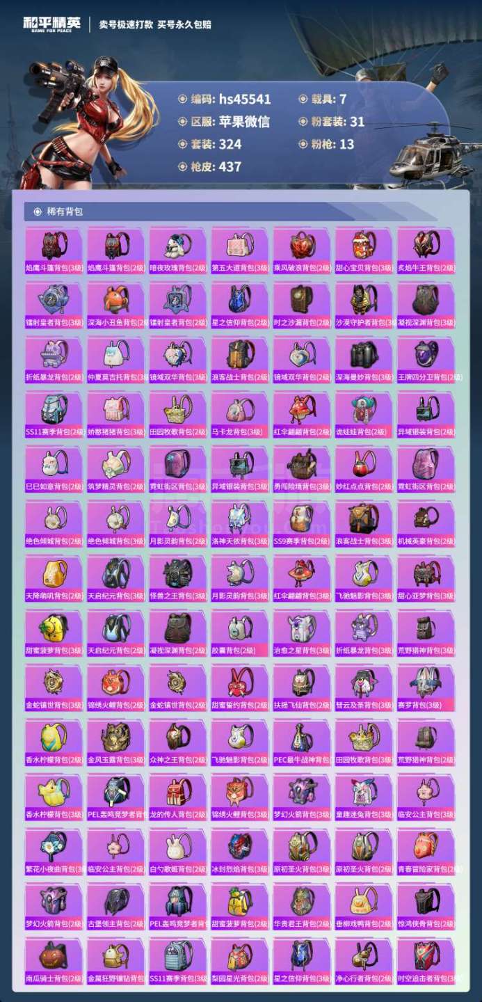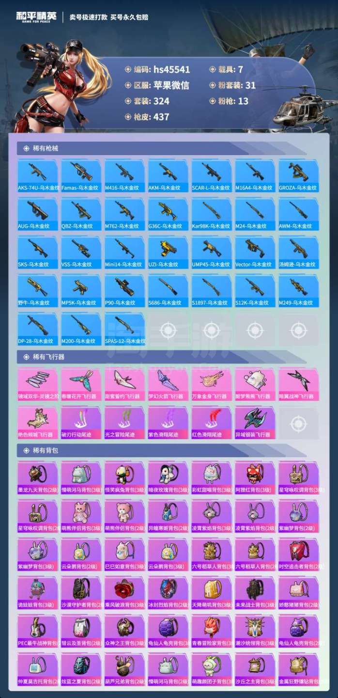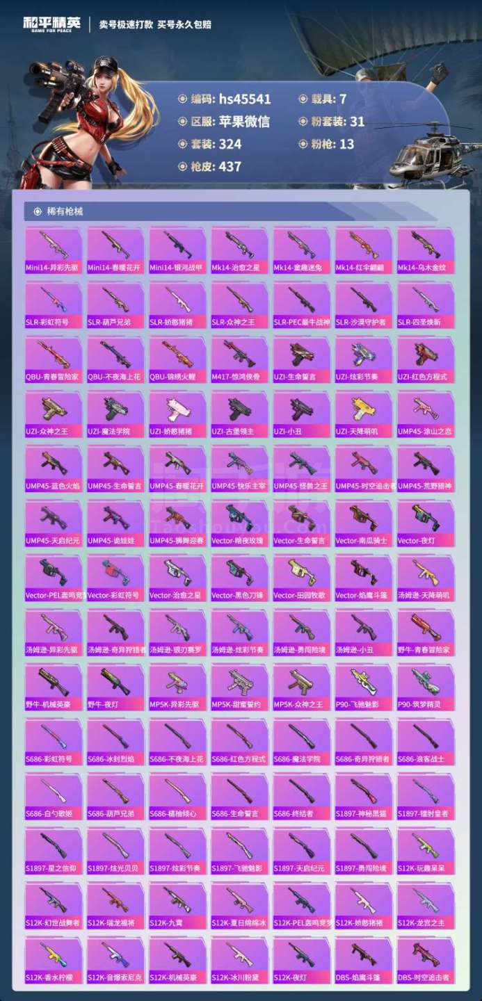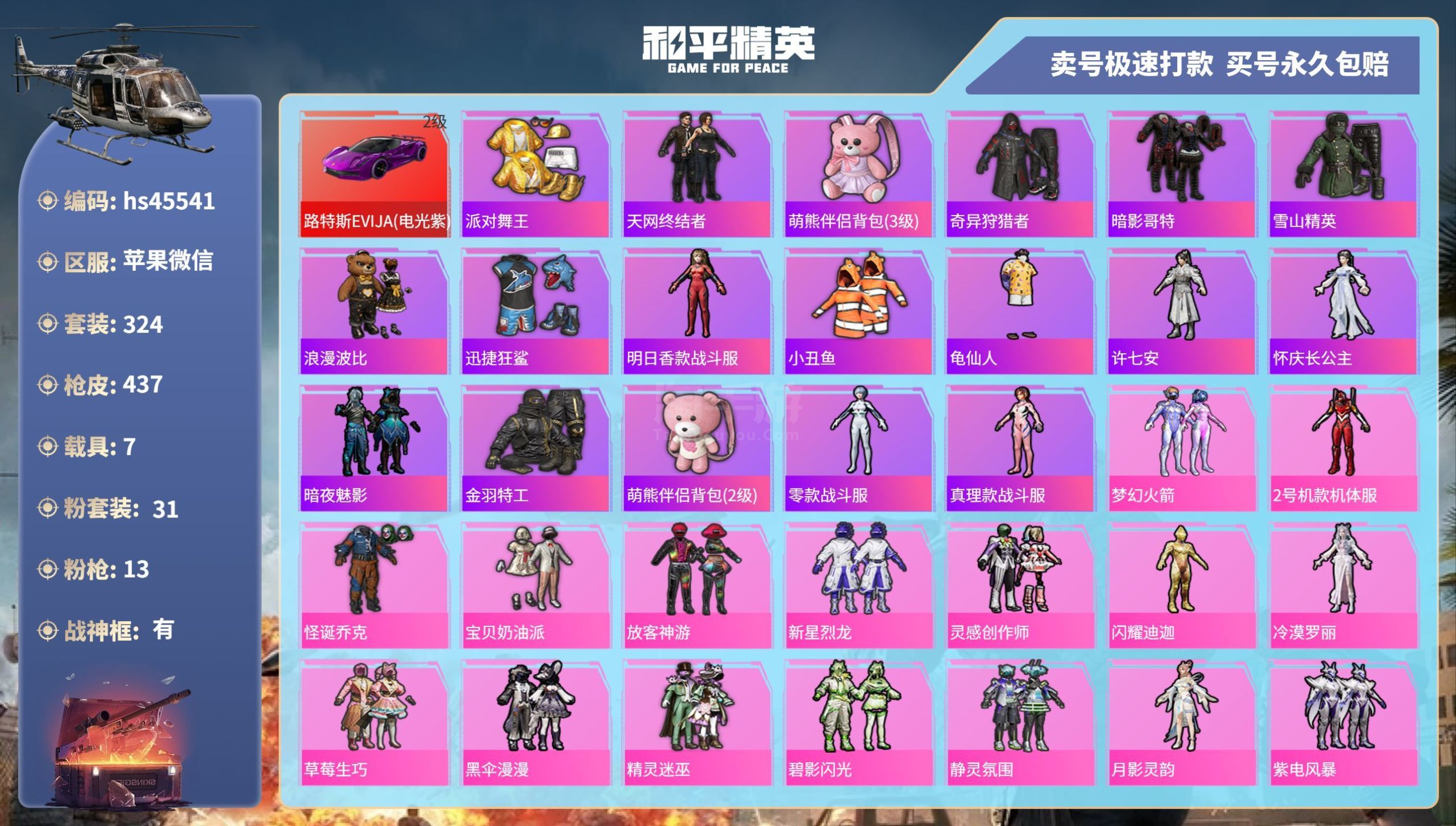 hs45541 苹果微-27王牌印记-有战神框-31粉装-13特效枪-7载具-164464热力值-