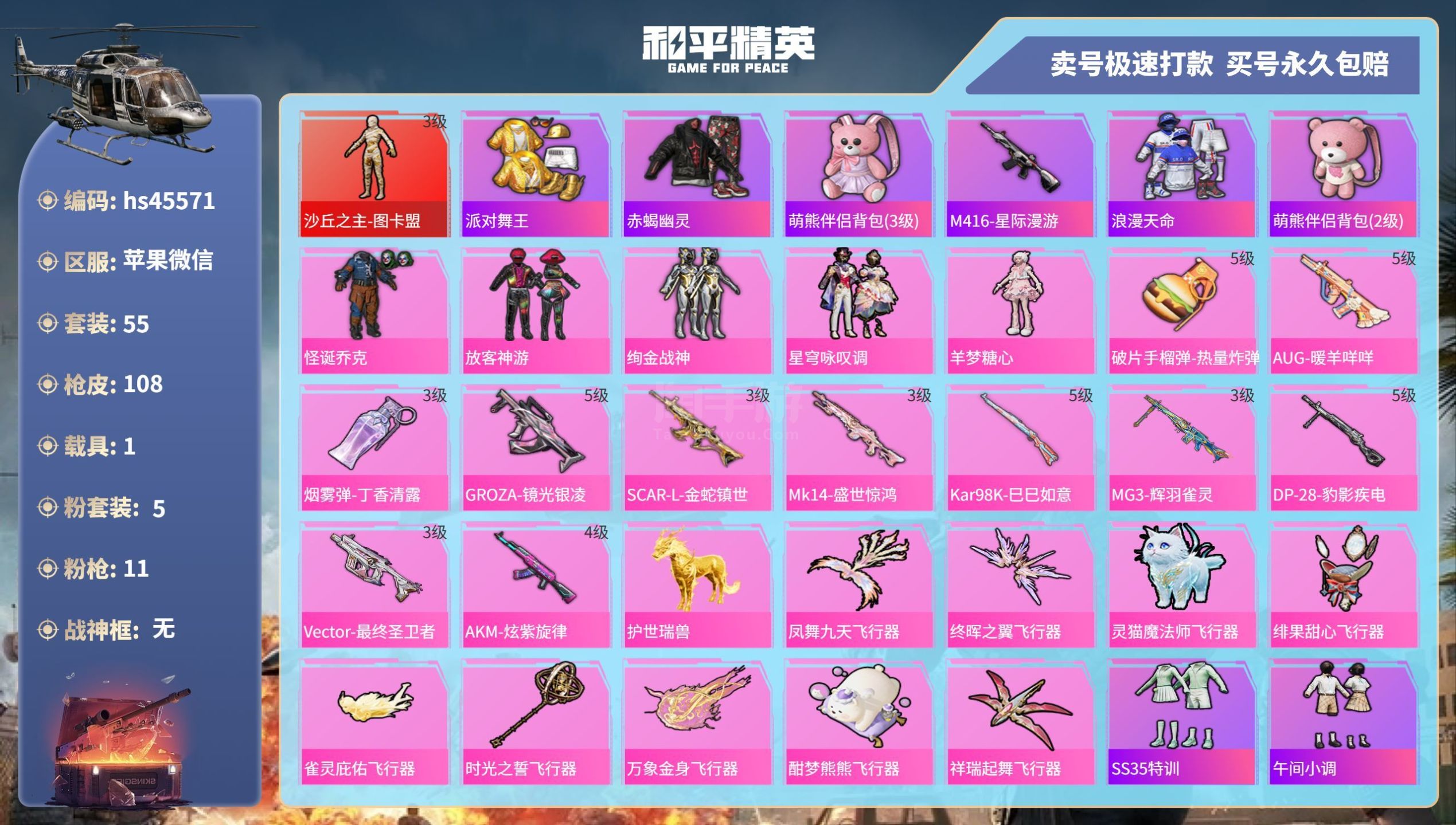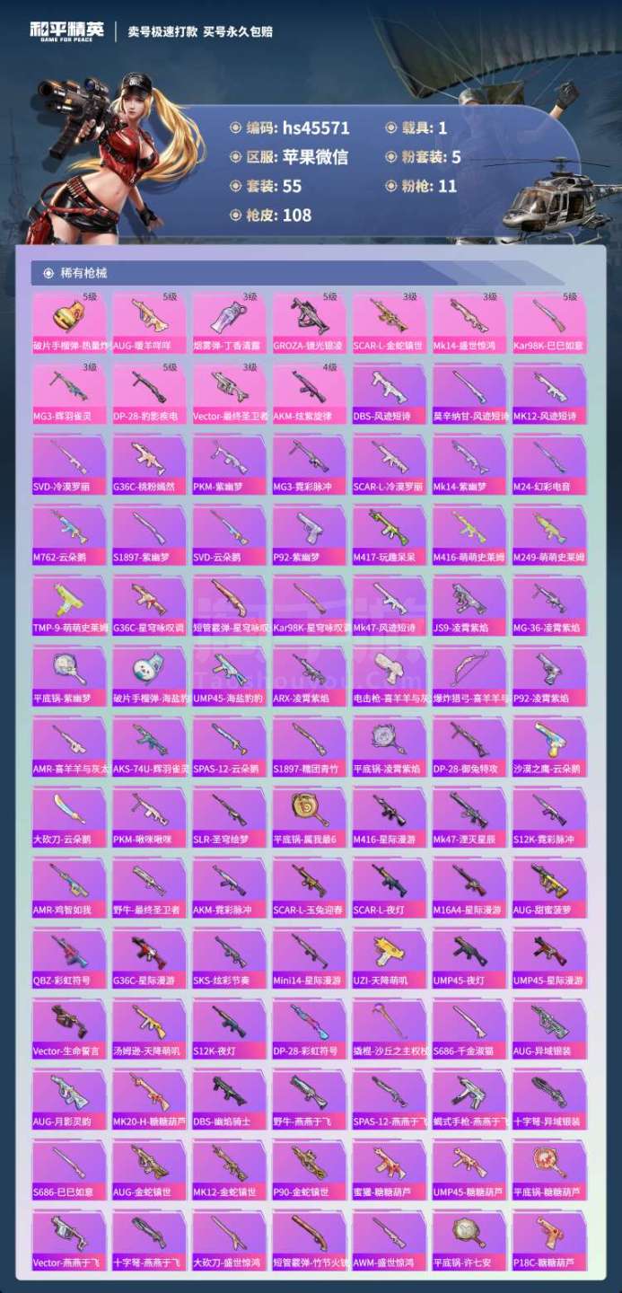 hs45571 苹果v-4王牌印记-5粉装-11特效枪-1载具-39788热力值-55套装-108