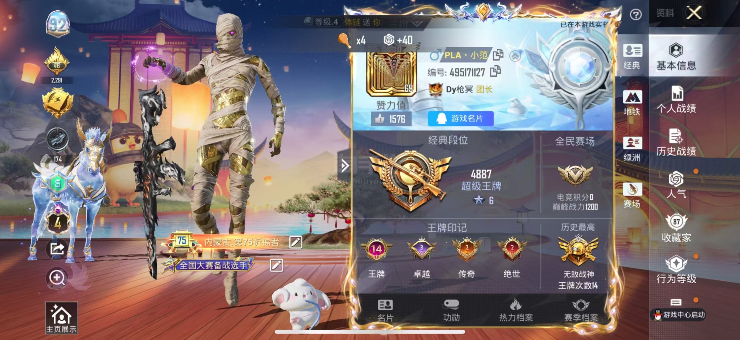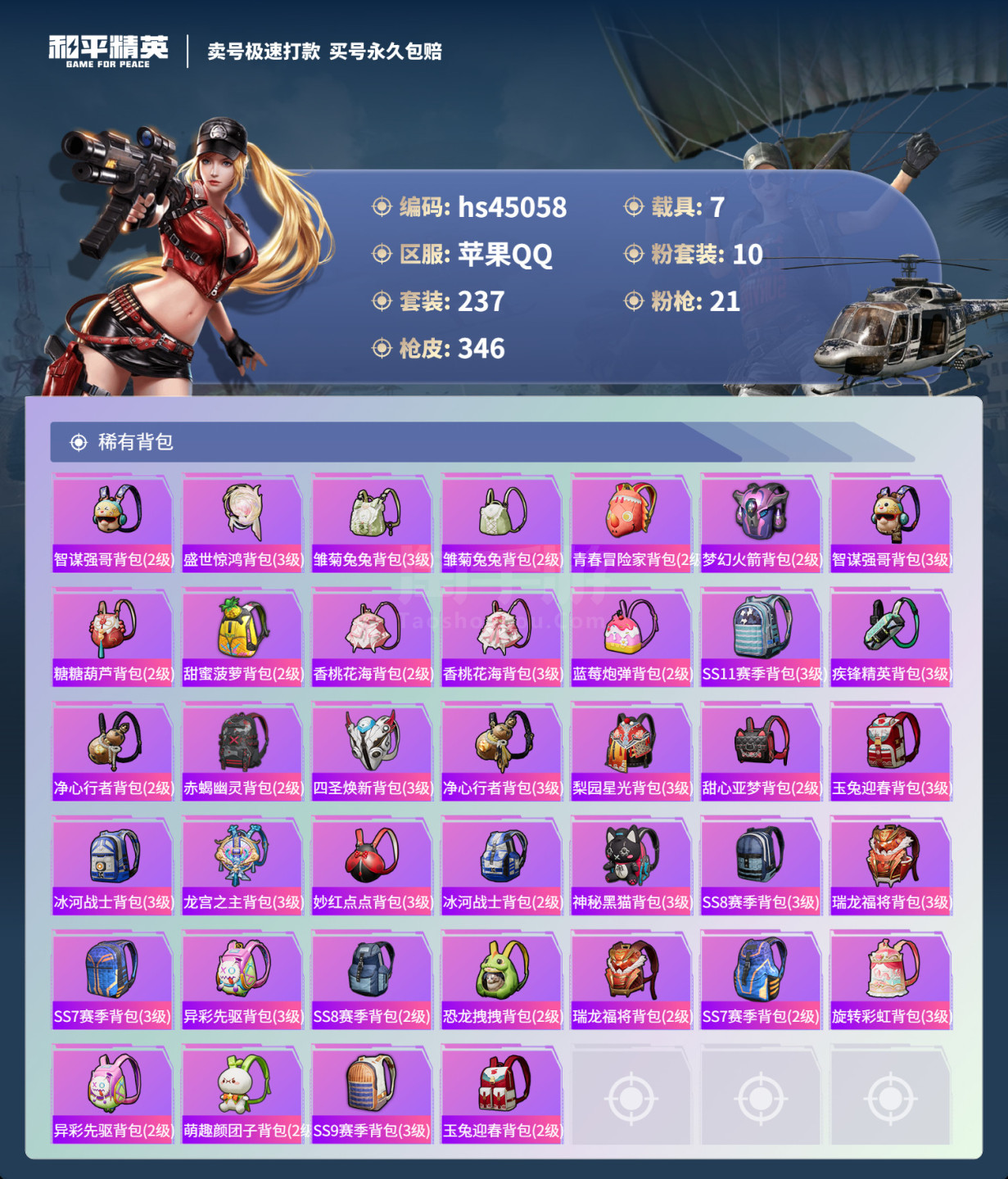 hs45058 苹果手Q-14王牌印记-有战神框-10粉装-21特效枪-7载具-126900热力值-