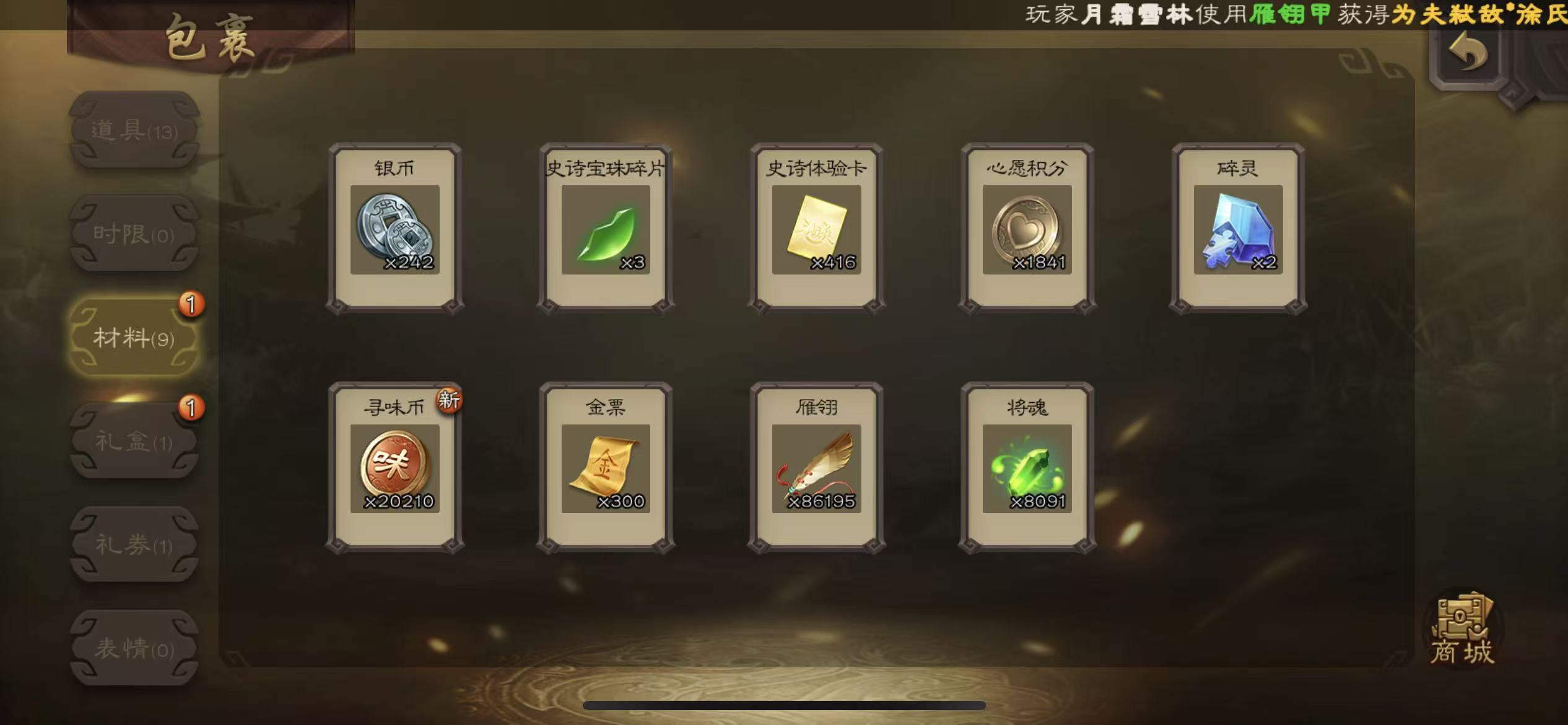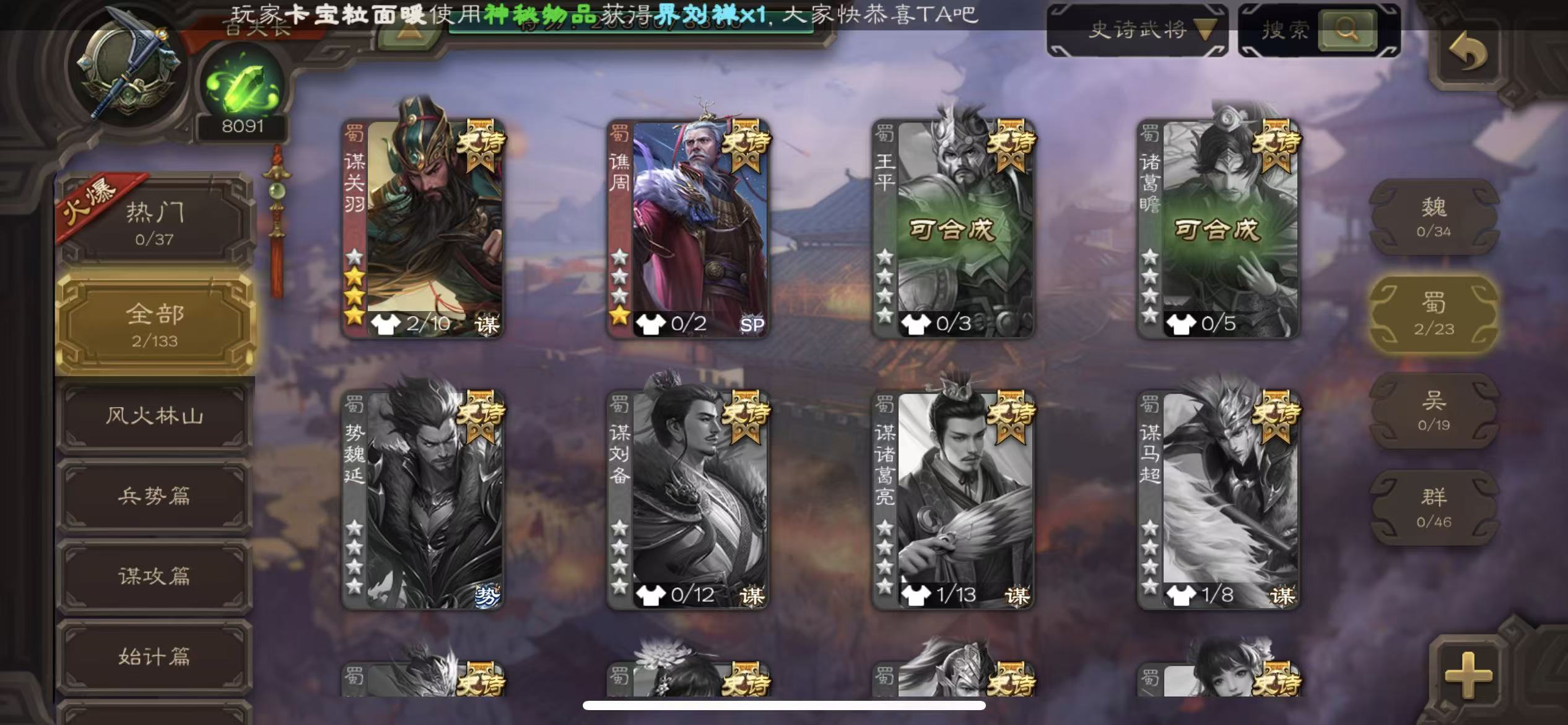 百夫长谋关羽8.5万羽毛8000将魂三卡
