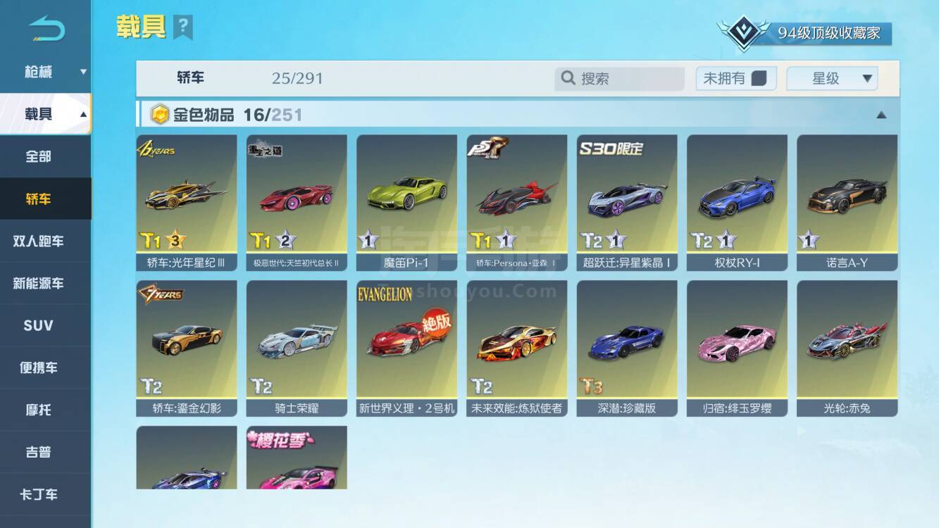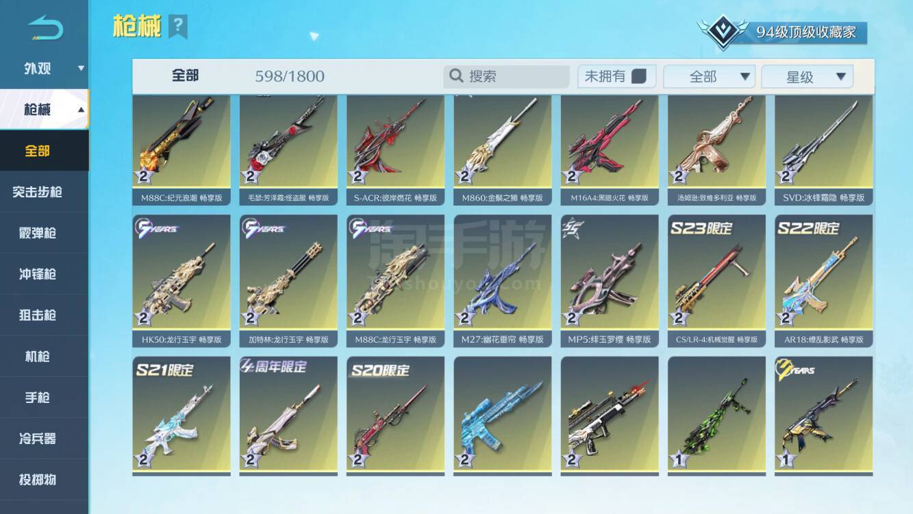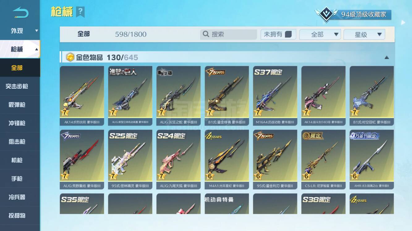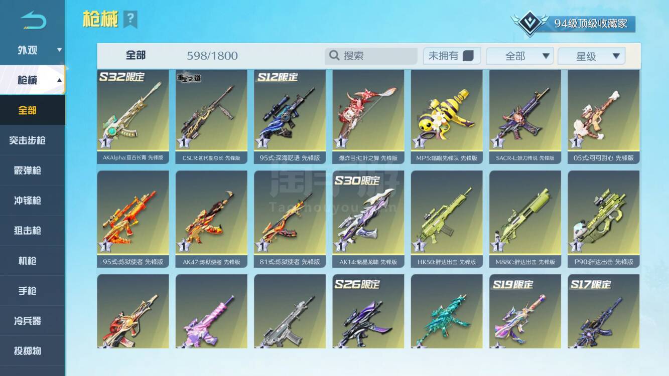 一个殿堂水晶,周年庆m4,95式很多满级枪,t1双跑,周年庆满级轿车,t1油车,多款满级击杀音效衣服