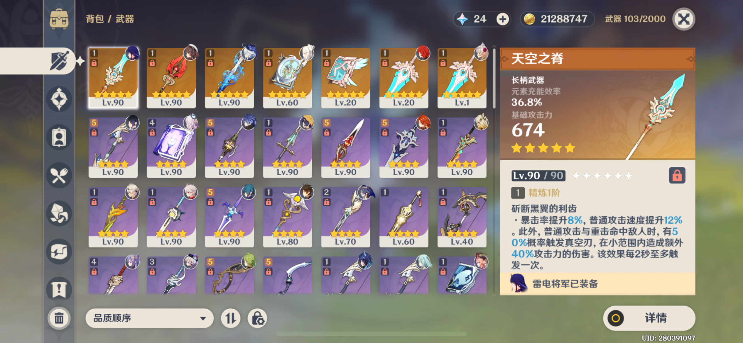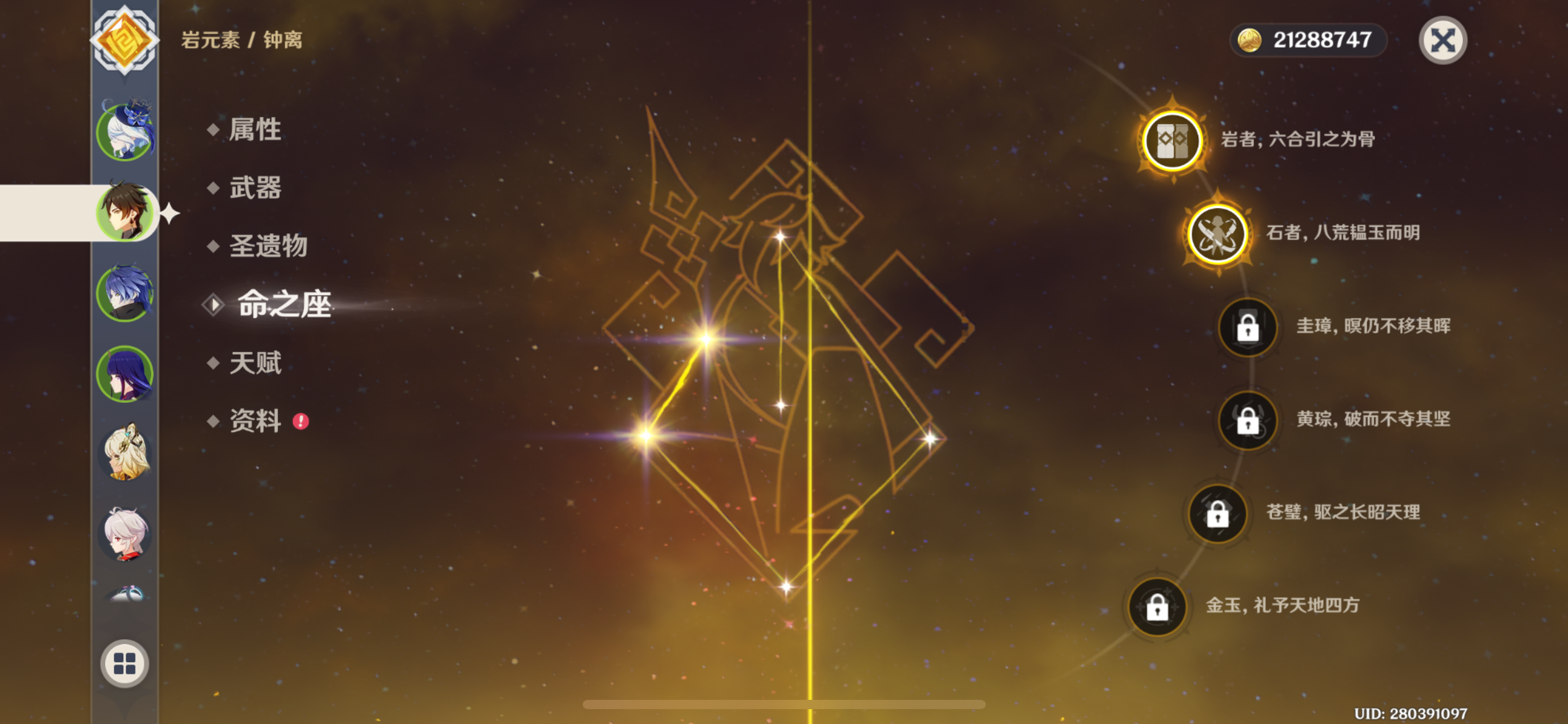 6+1芙芙,二命雷神二命钟离胡桃有皮肤加护摩,五命七七,多金