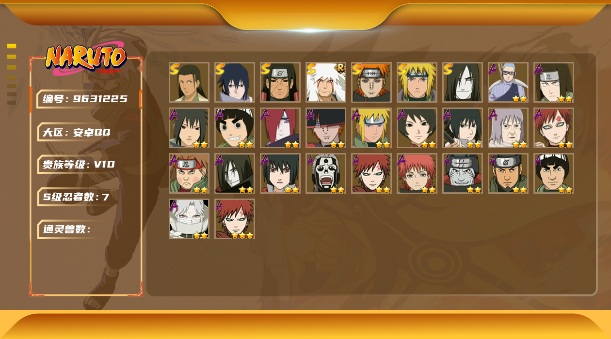 [9631225]7S!实名: 可修改 贵族等级: V10 S忍数: 7 A忍数: 21 战力值(万): 376 S级忍者: 千手柱间「秽土转生」,佩恩「天道」,大蛇丸,波风水门,自来也 「舞之豪杰」,宇智波佐助「永恒万花筒」,千手柱间·木叶创立 通灵兽: 忍犬,忍龟,蛤蟆吉,蓝蛇,猿魔,蛞蝓,蛤蟆仙人,镰鼬,山椒鱼,蜃,鲛鲨,蛤蟆健,乌鸦,砂之守鹤