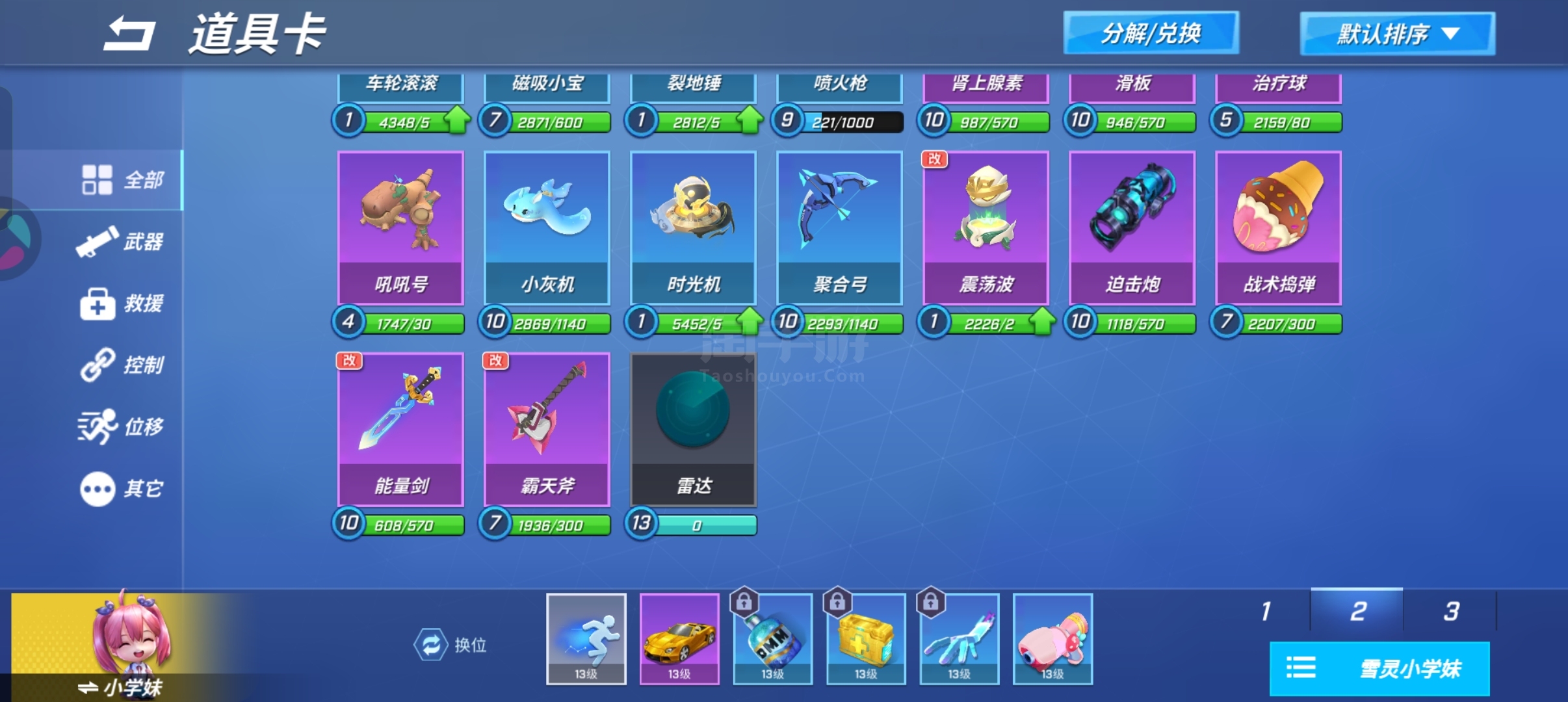 有学妹双王白卡全满,蓝卡差不多全满,紫卡有13级车,其他的差不多都10级