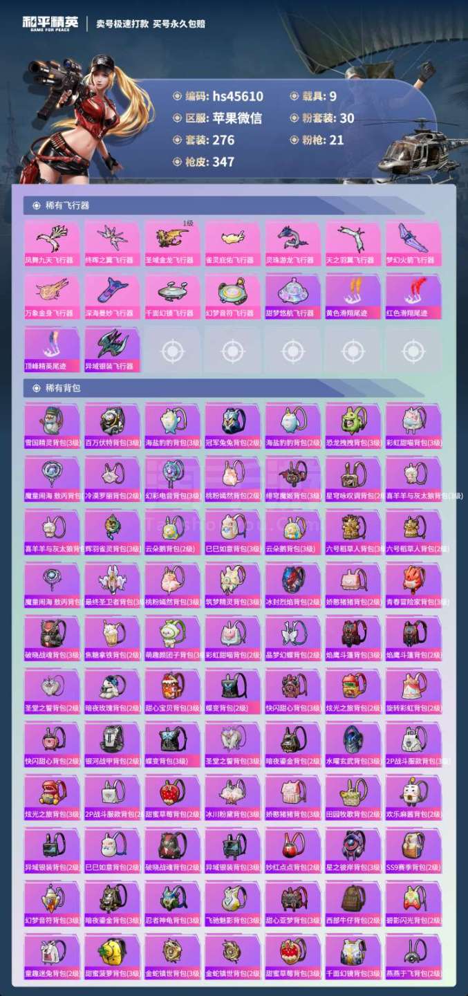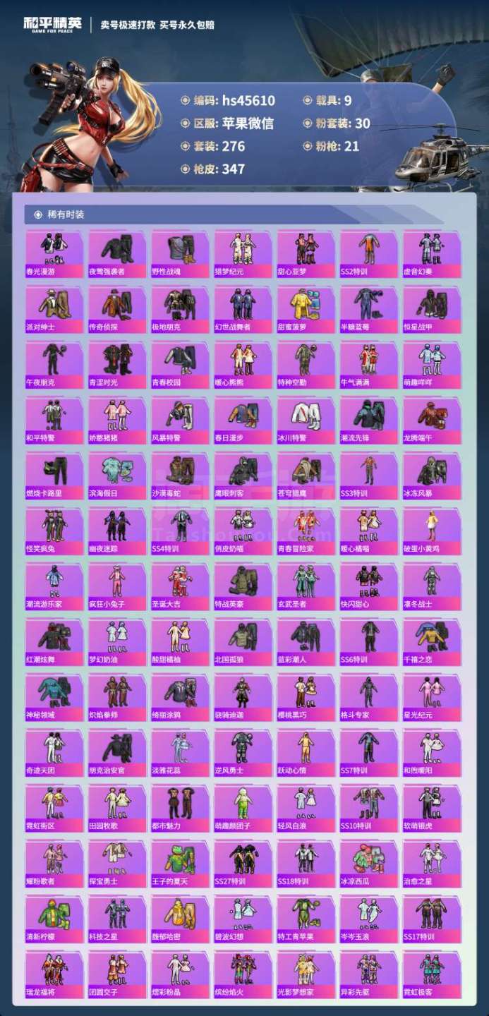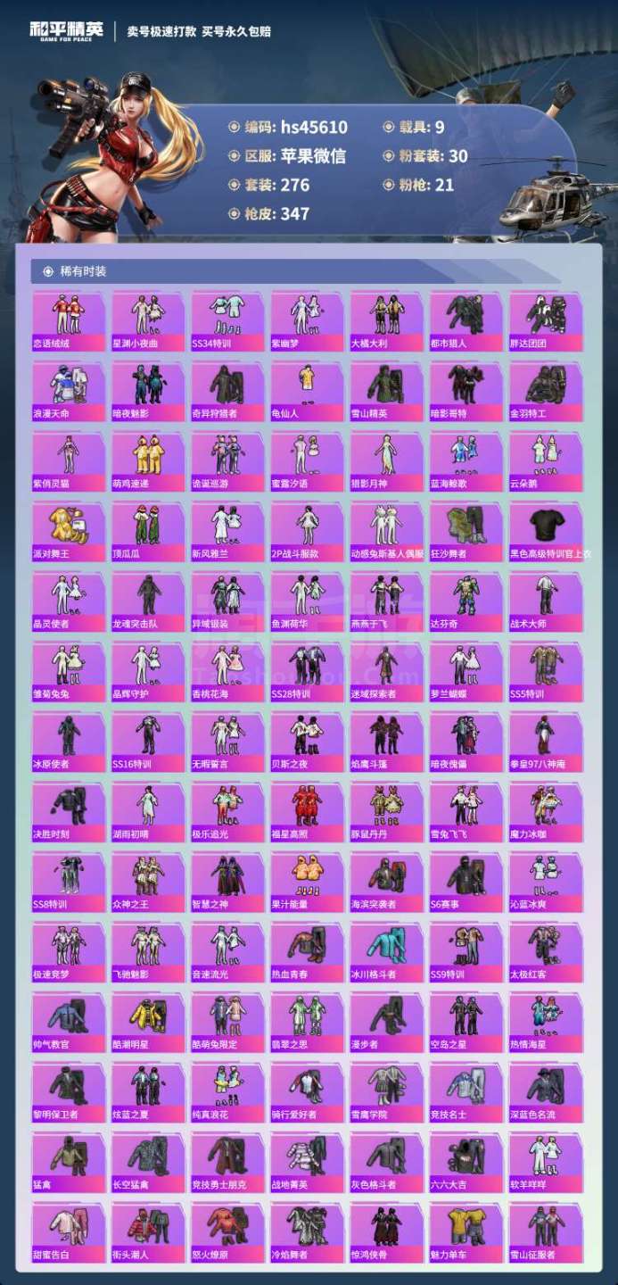 hs45610 苹果微-26王牌印记-有战神框-30粉装-21特效枪-9载具-144187热力值-