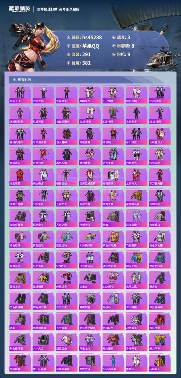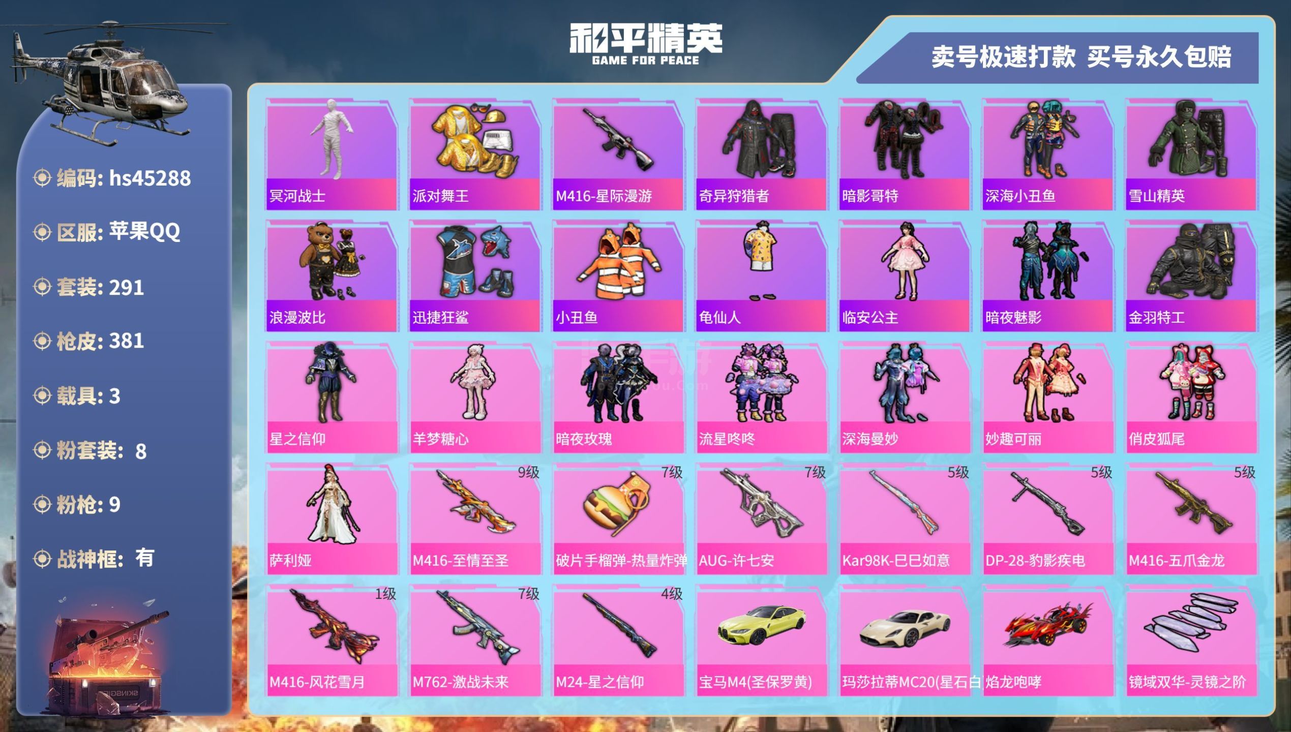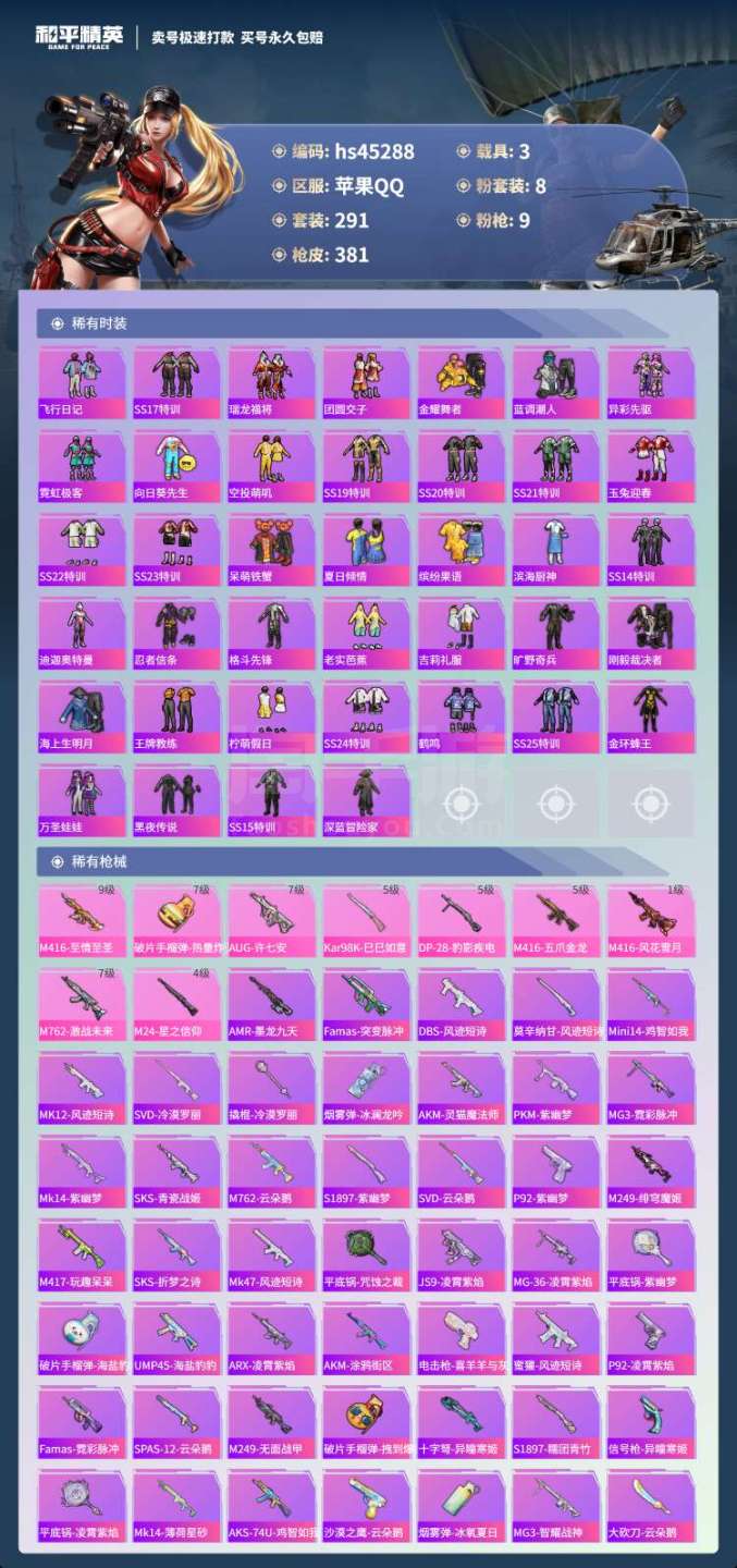 hs45288 苹果手Q-18王牌印记-有战神框-8粉装-9特效枪-3载具-122348热力值-29