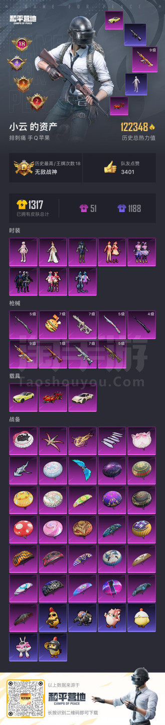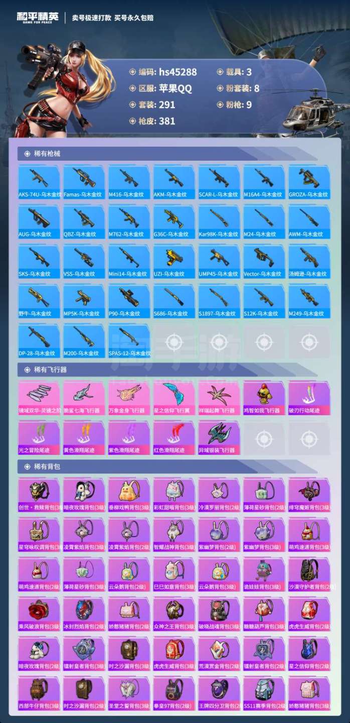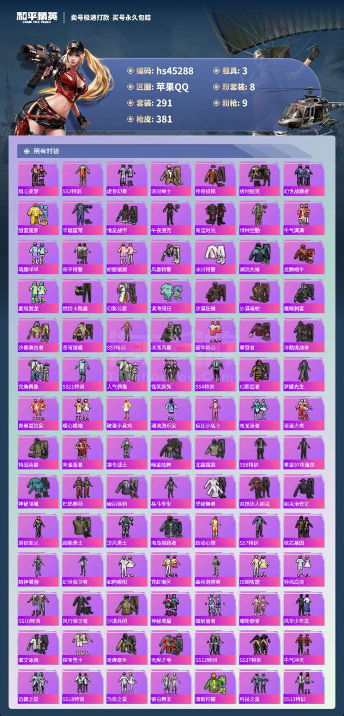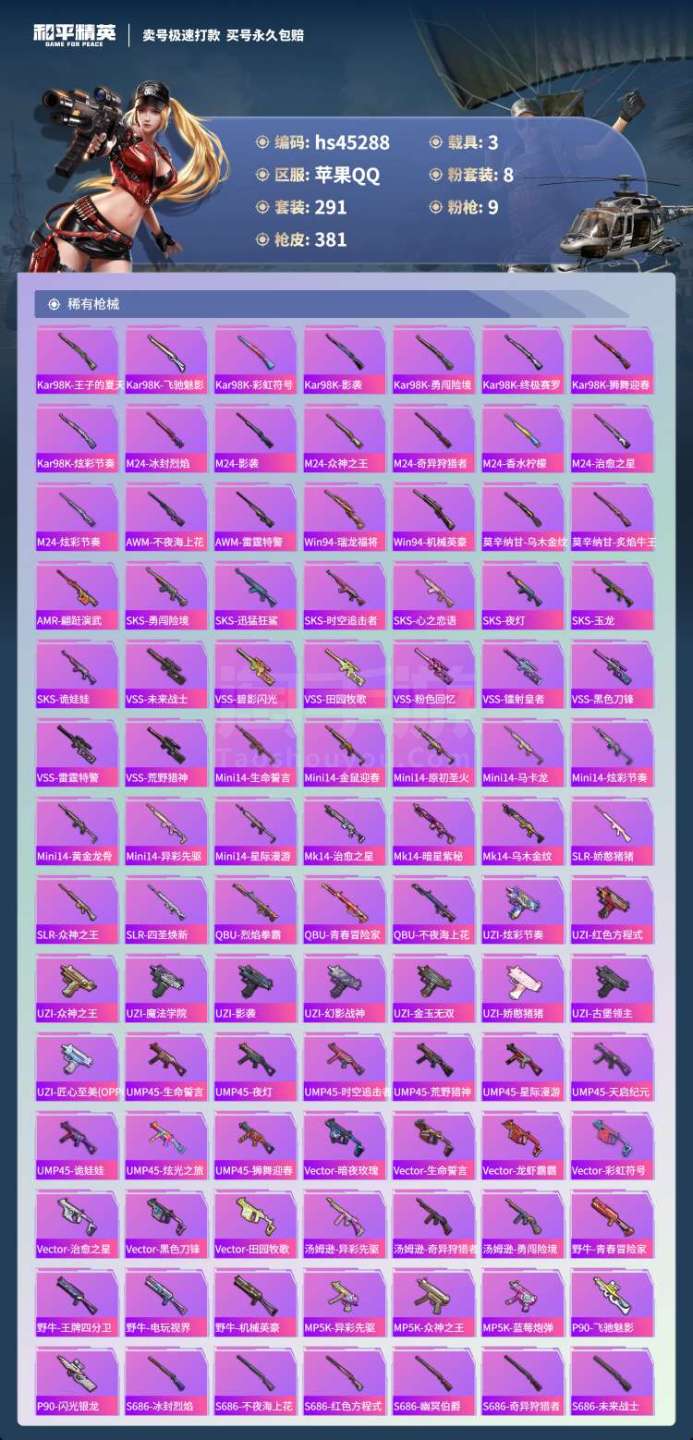 hs45288 苹果手Q-18王牌印记-有战神框-8粉装-9特效枪-3载具-122348热力值-29
