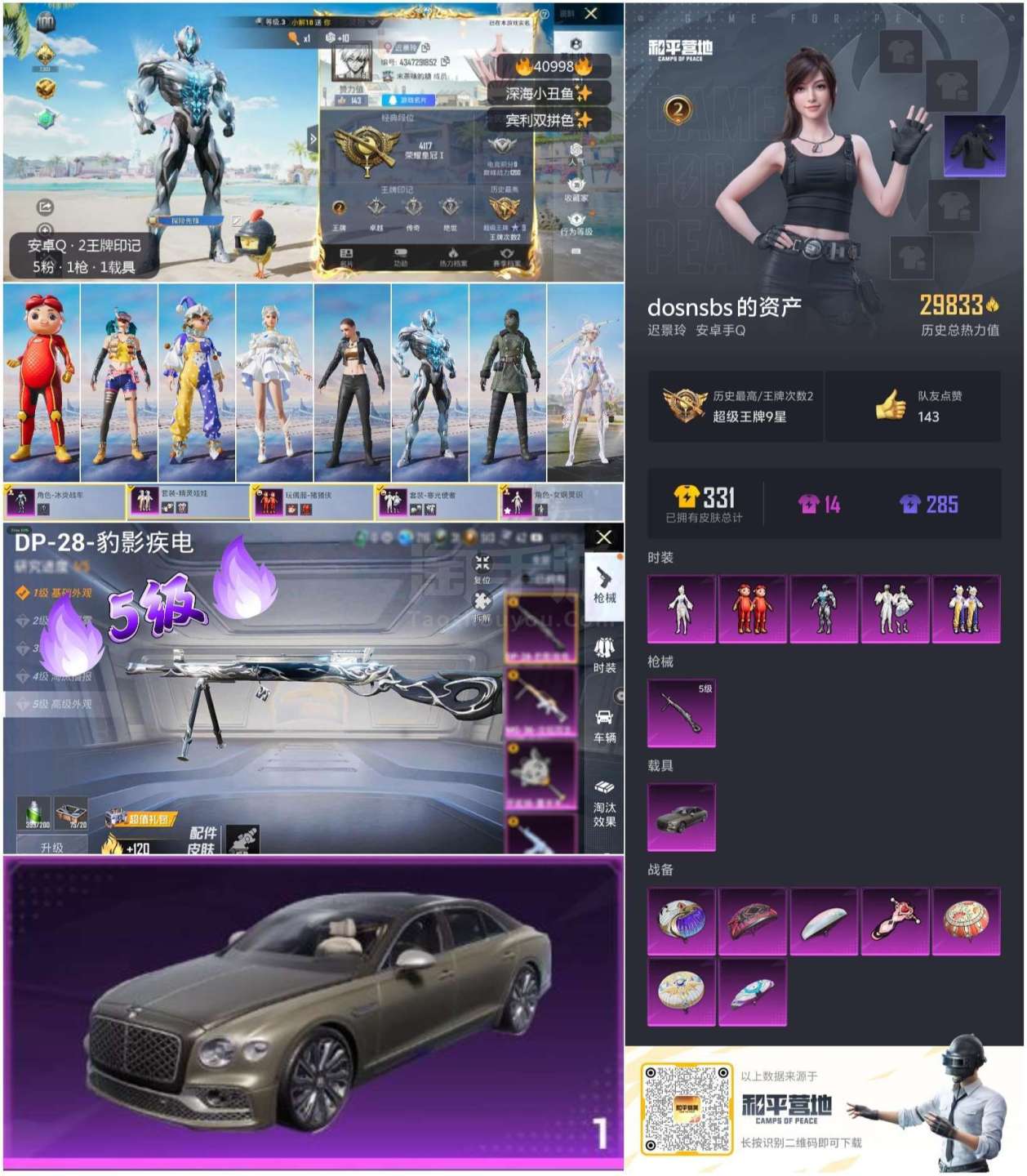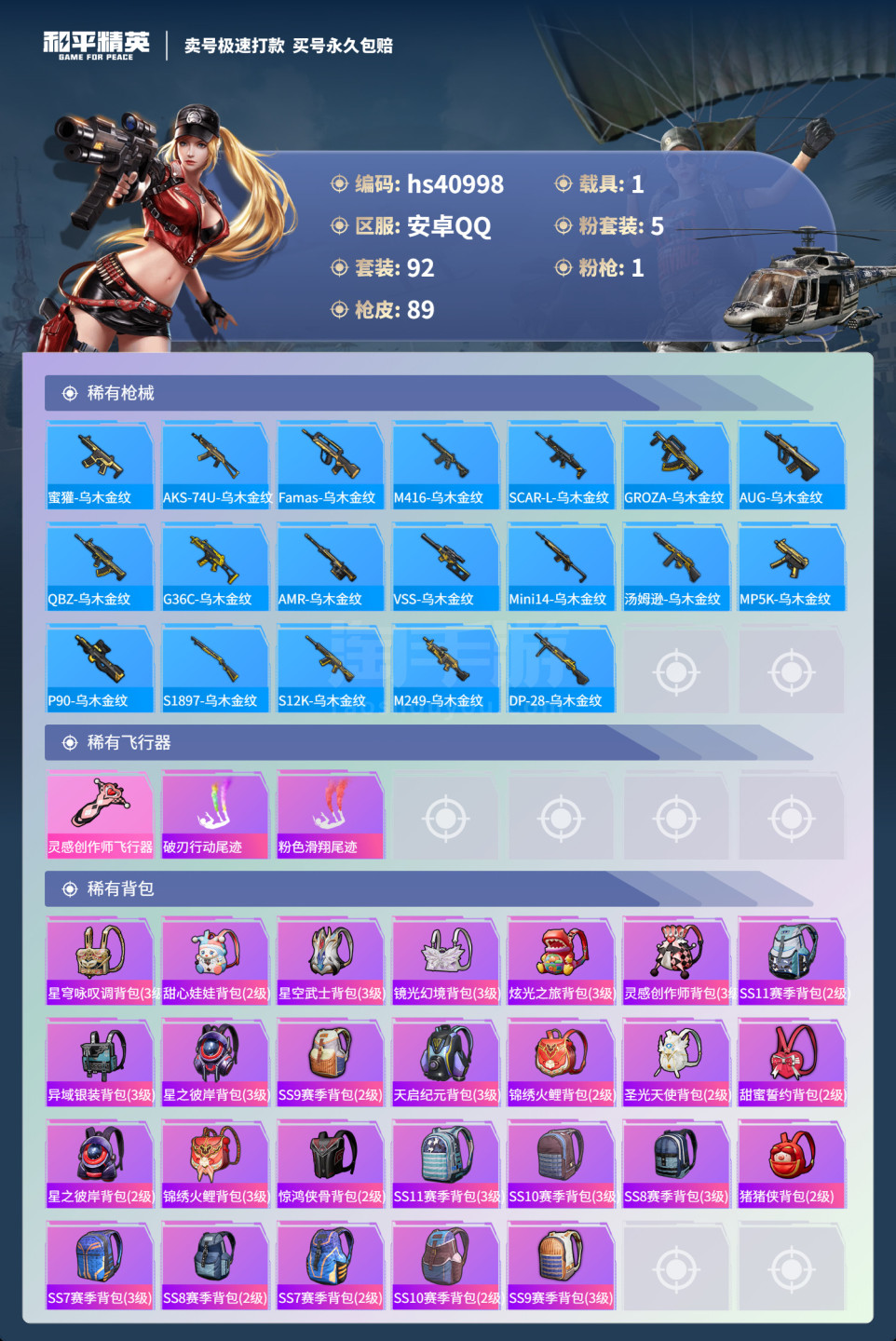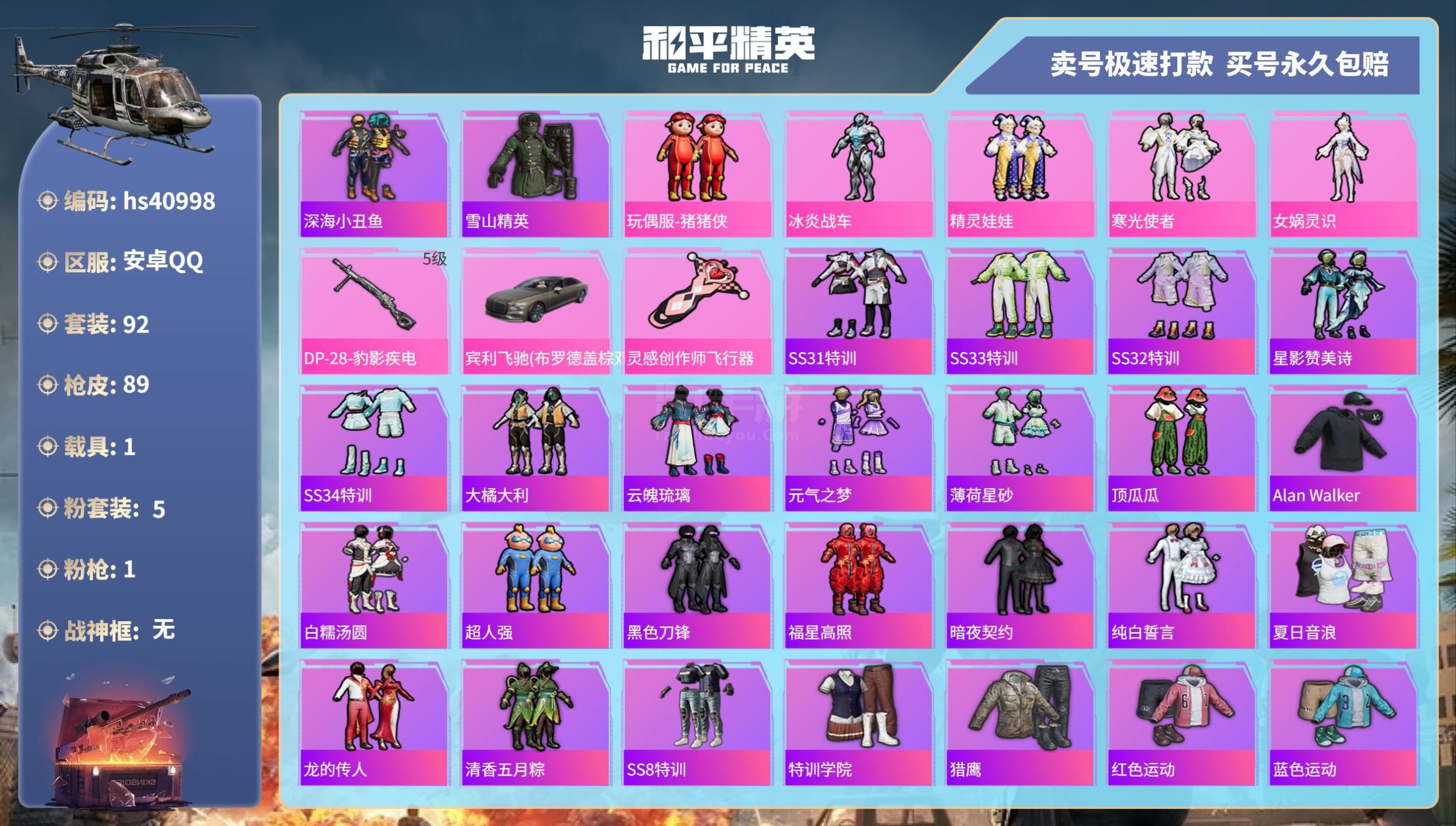 hs40998 安卓手Q-2王牌印记-5粉装-1特效枪-1载具-29893热力值-92套装-89枪皮