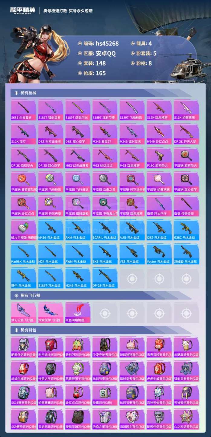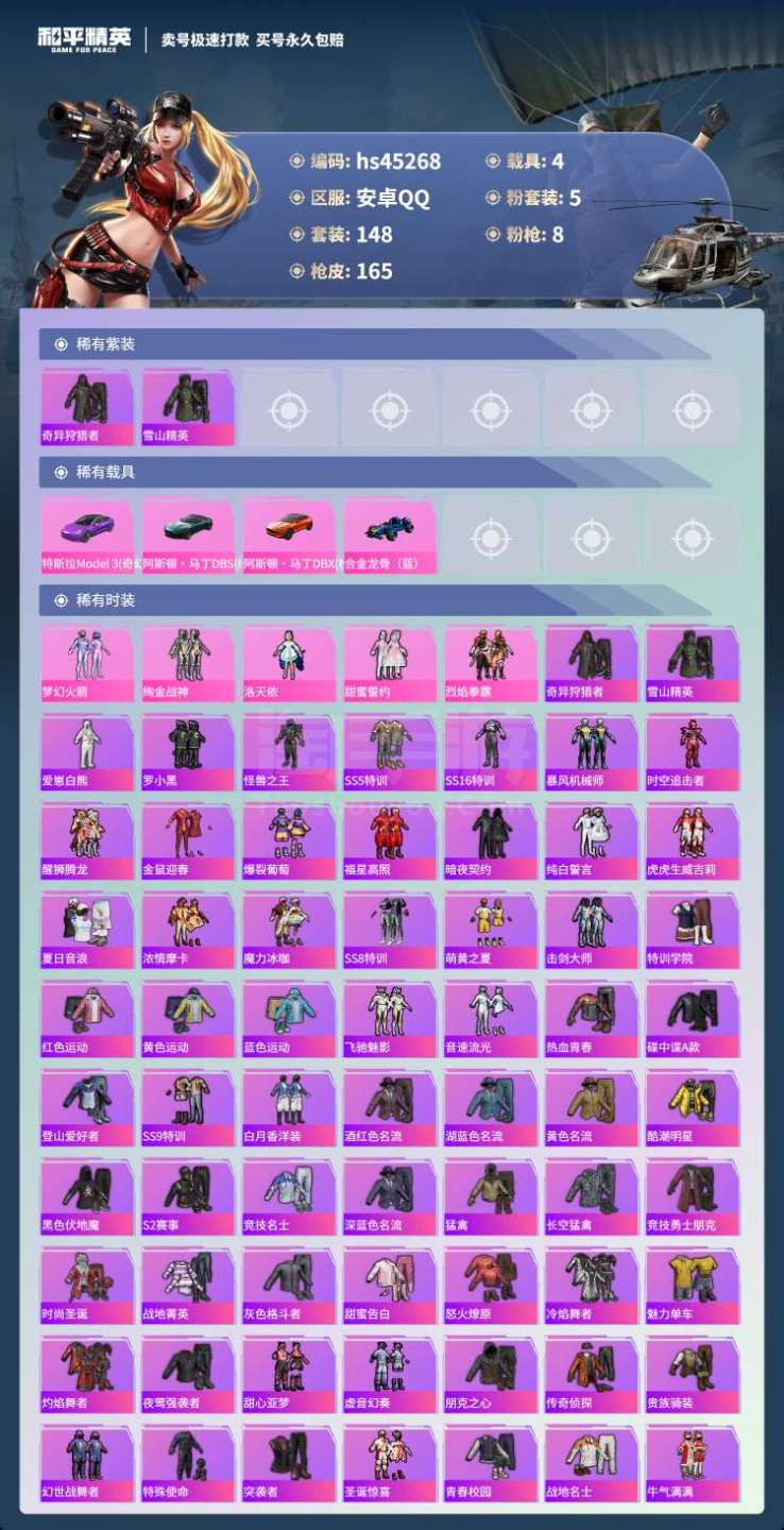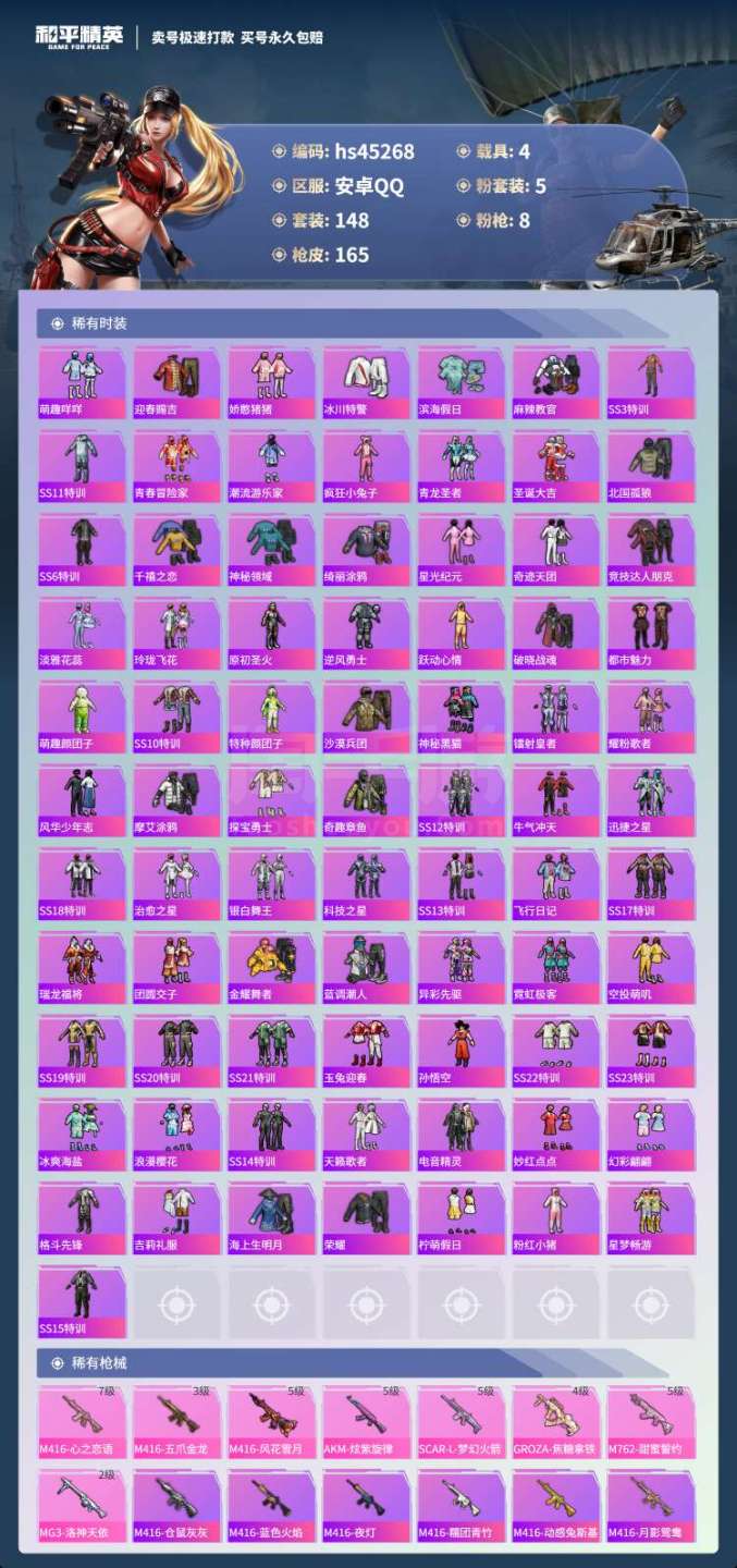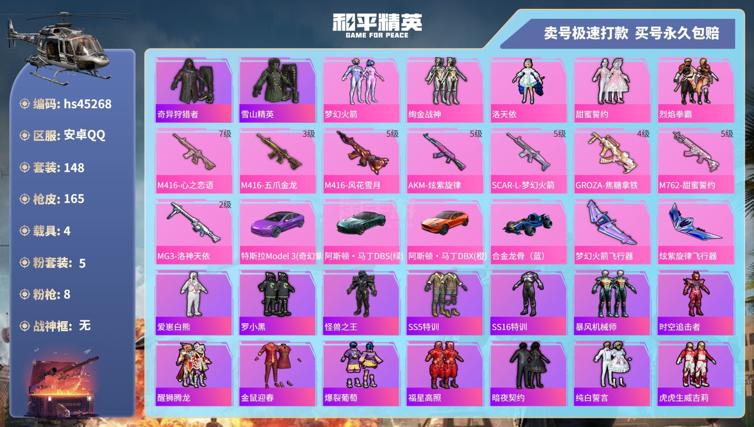 hs45268 安卓手Q-12王牌印记-5粉装-8特效枪-4载具-64441热力值-148套装-16