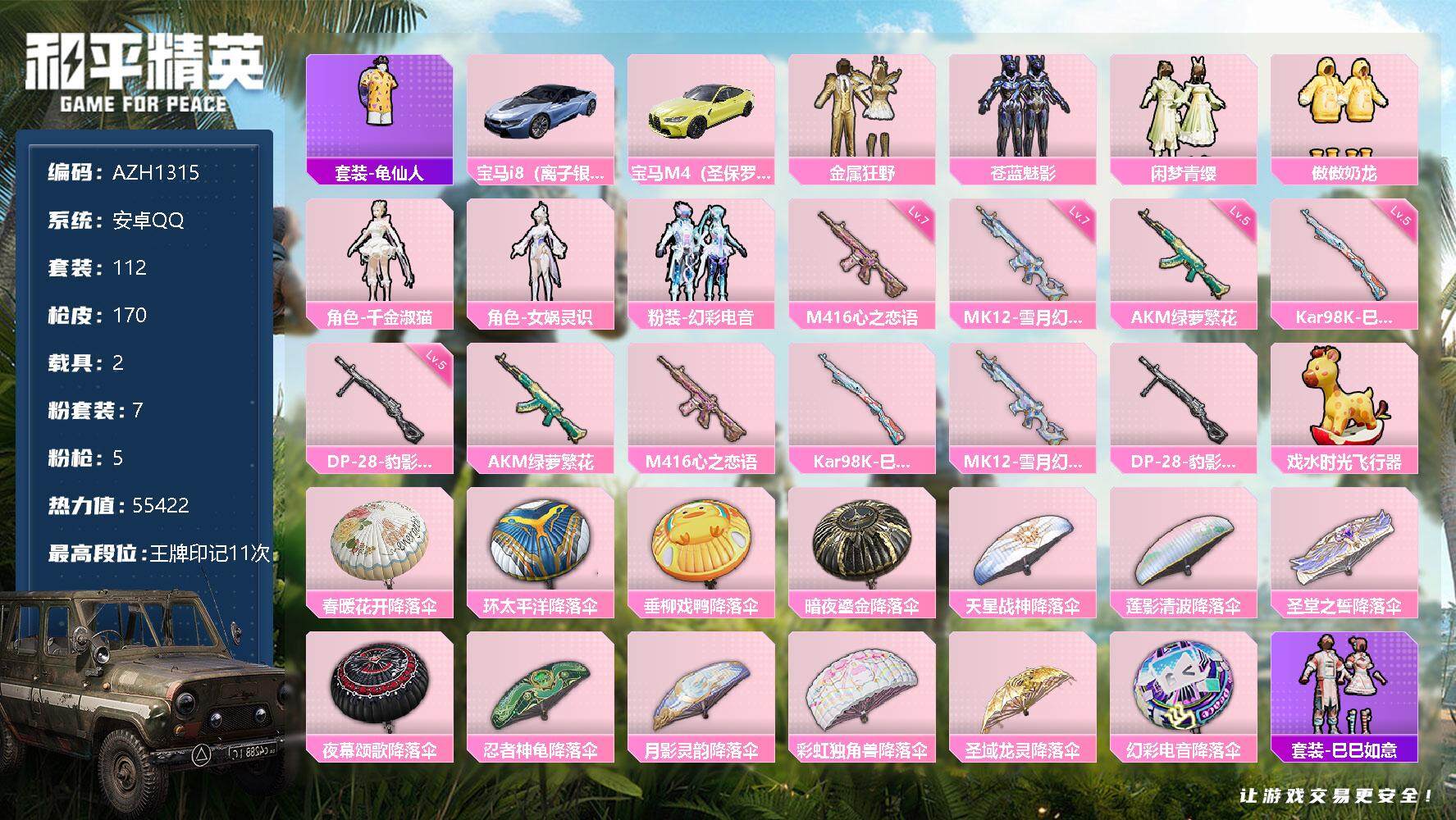 【AZH1315】【商品标题】:【7粉装5升级枪2车】安卓手Q-7粉装-5特效枪-2载具-1粉色飞行器-55422热力值-11王牌印记-112套装-170枪皮