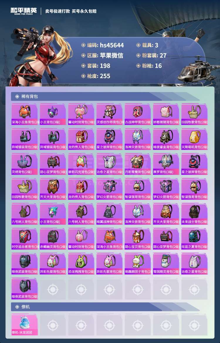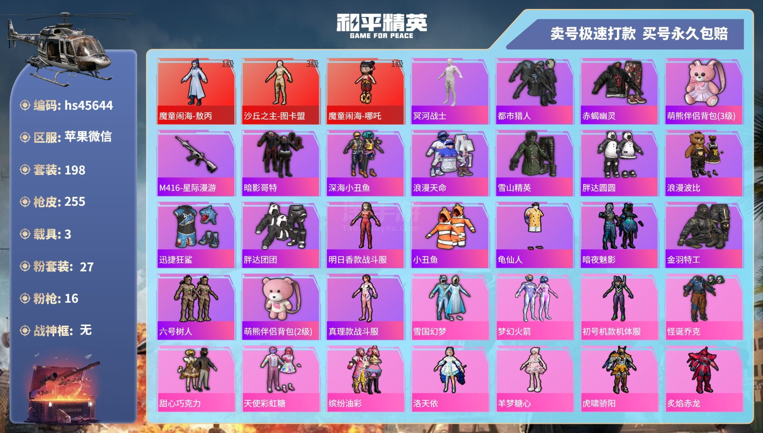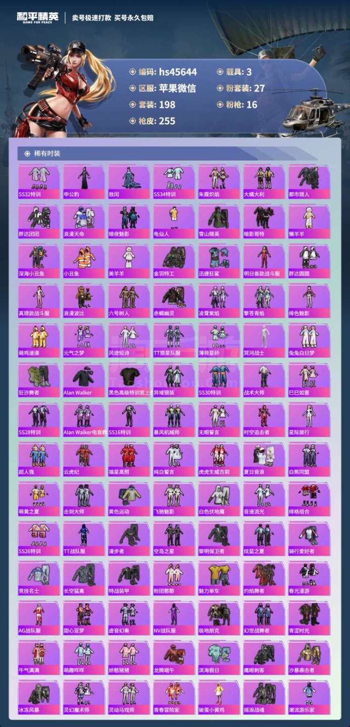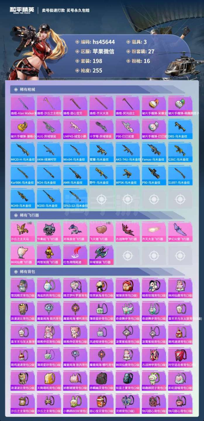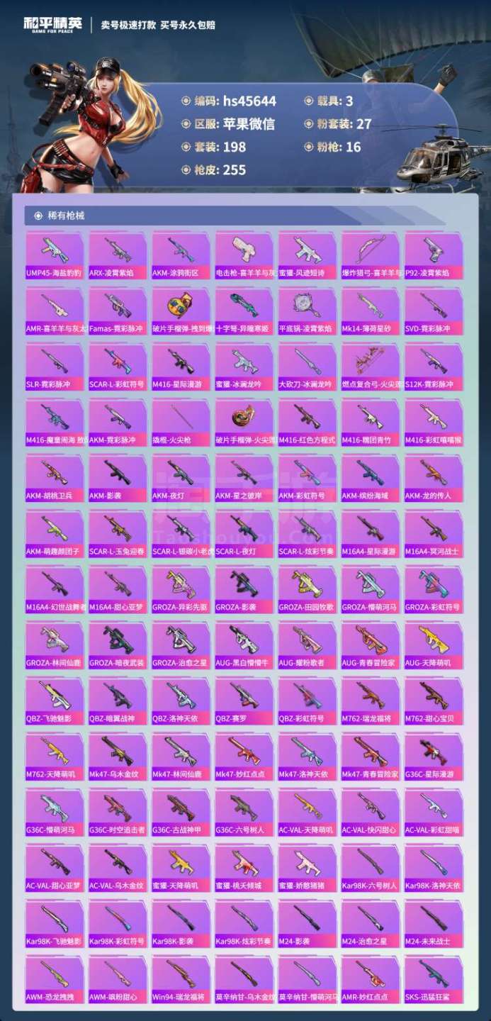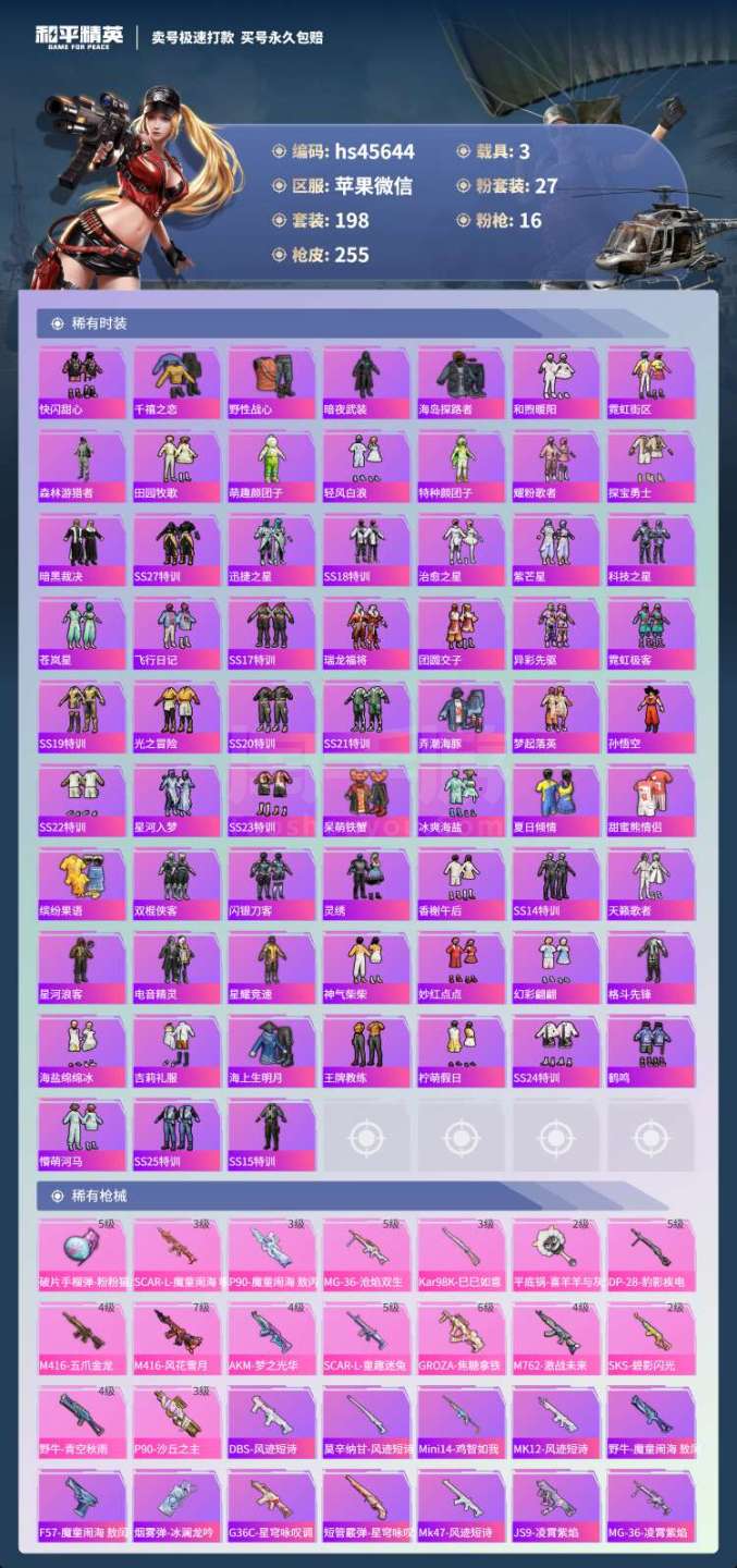 hs45644 苹果v-16王牌印记-27粉装-16特效枪-3载具-96623热力值-198套装-