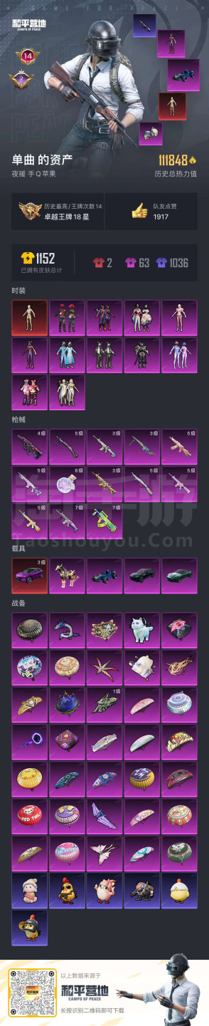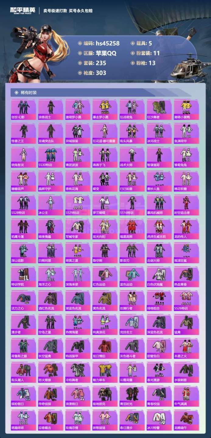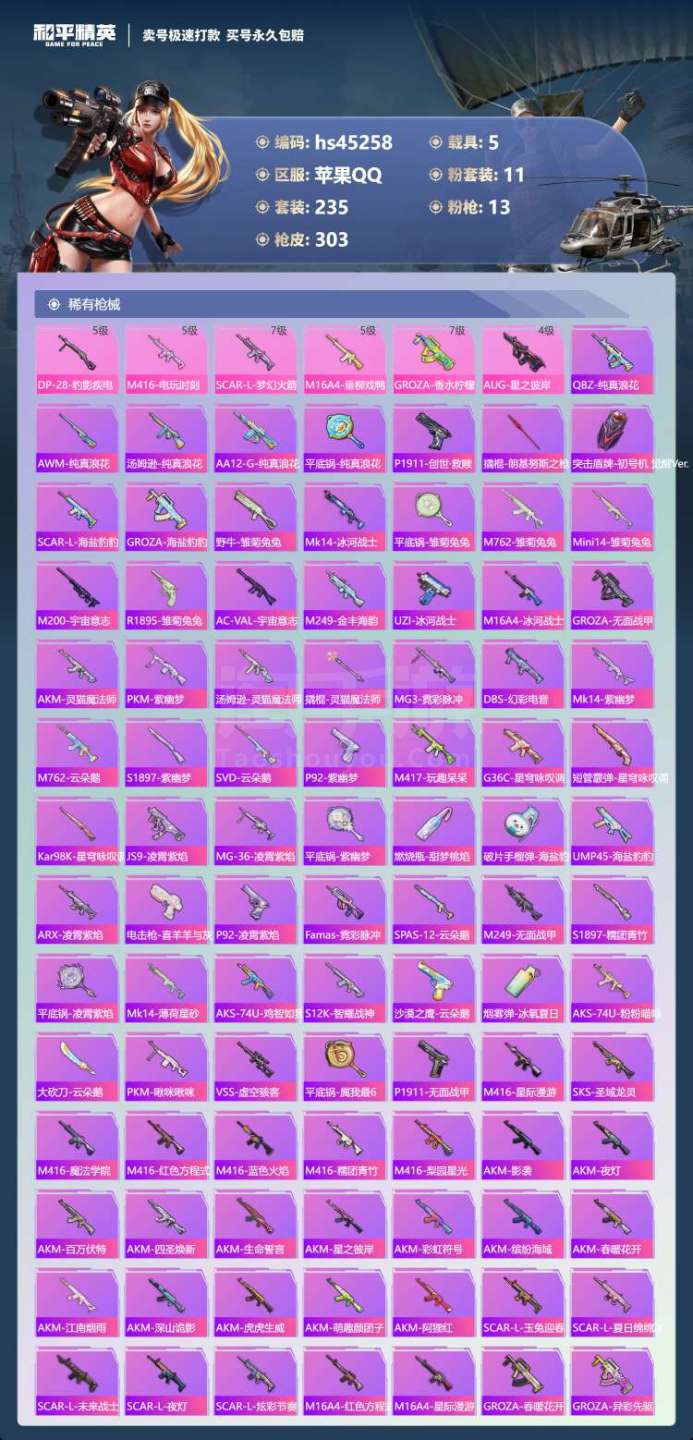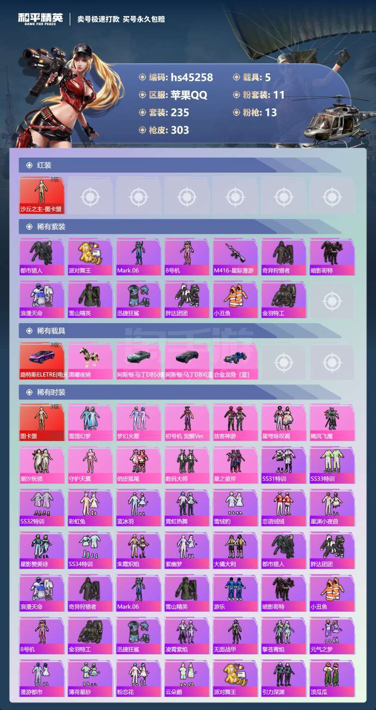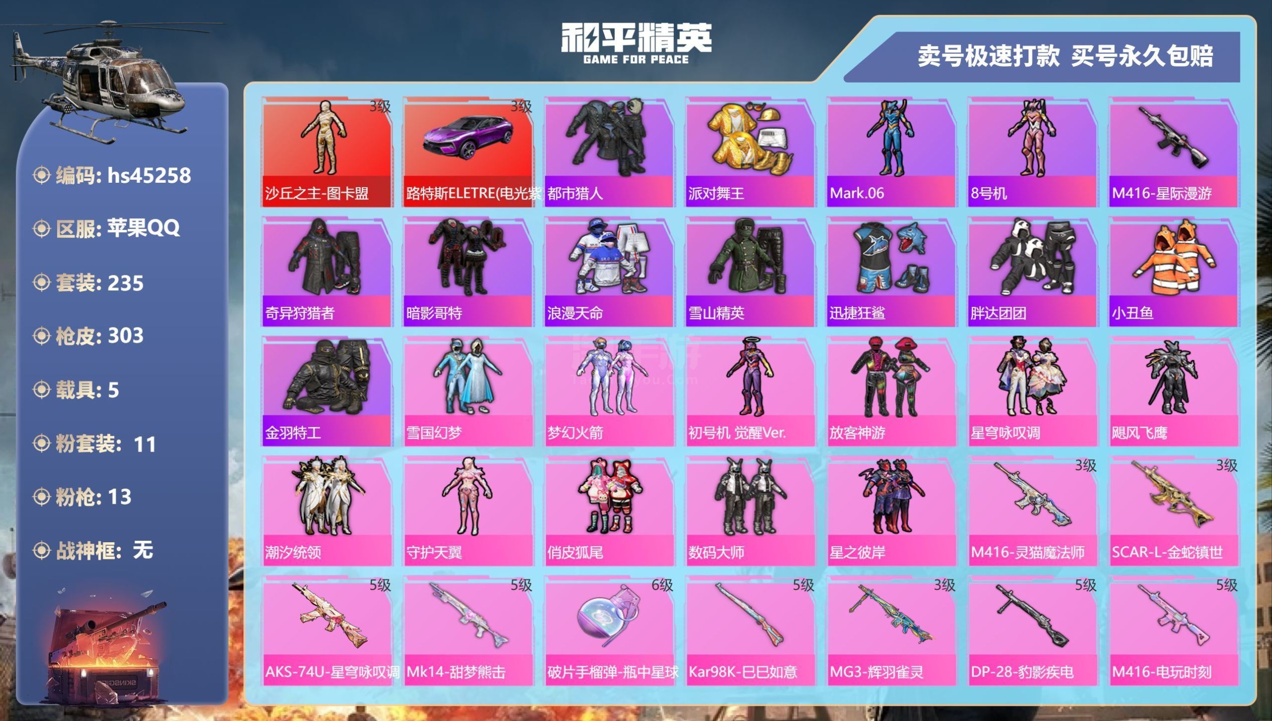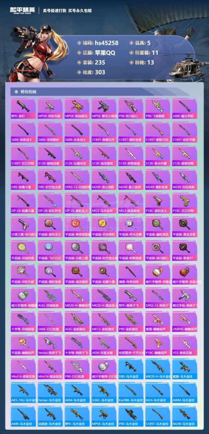 hs45258 苹果手Q-14王牌印记-11粉装-13特效枪-5载具-111848热力值-235套装