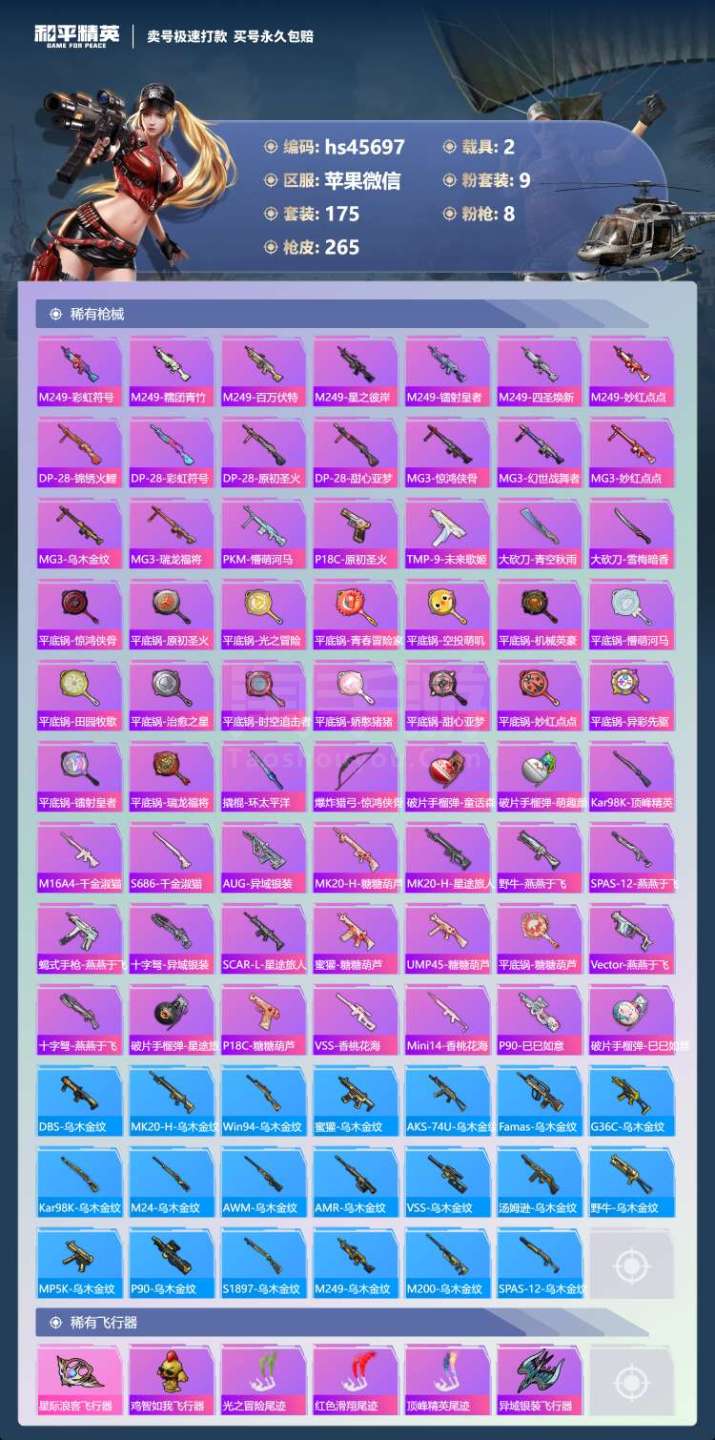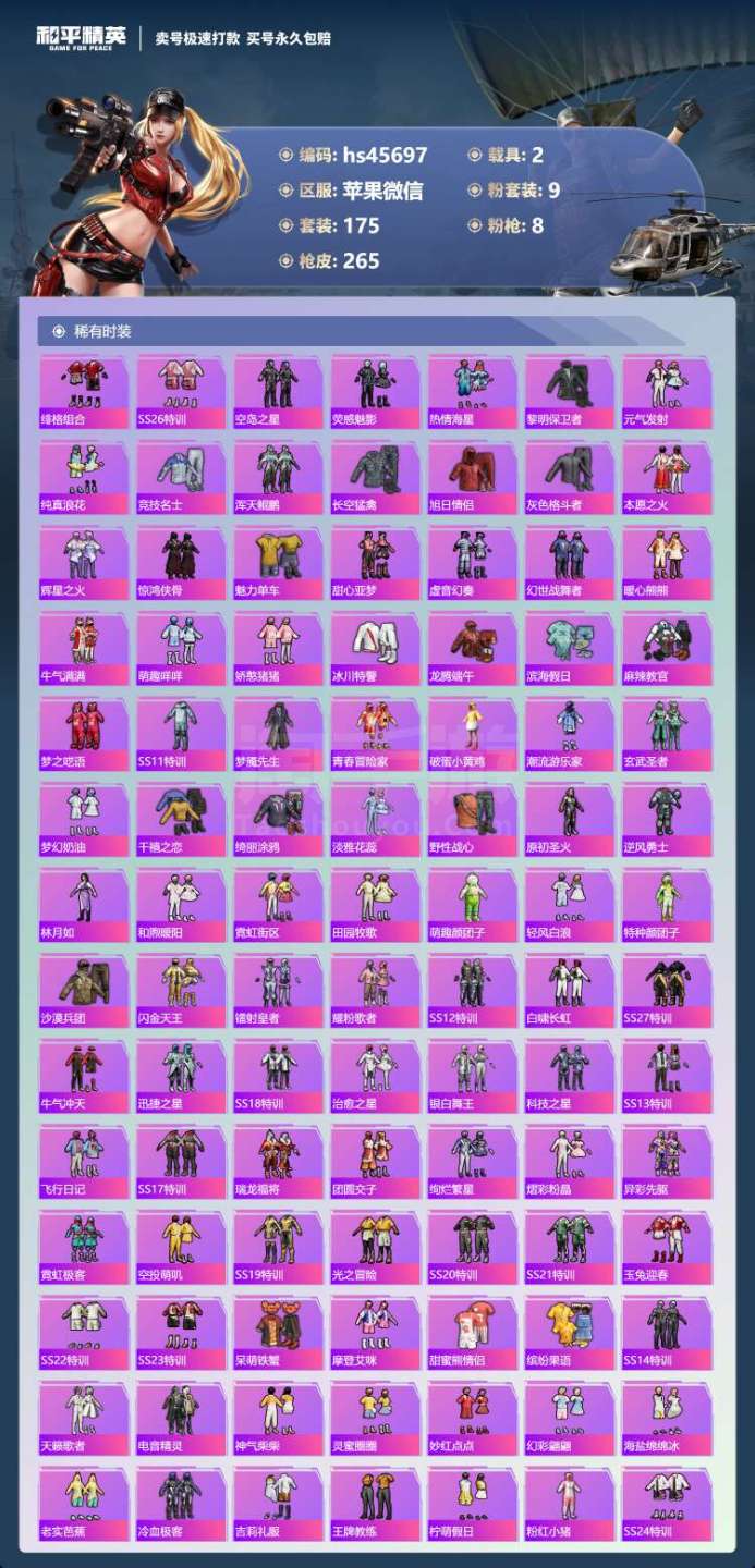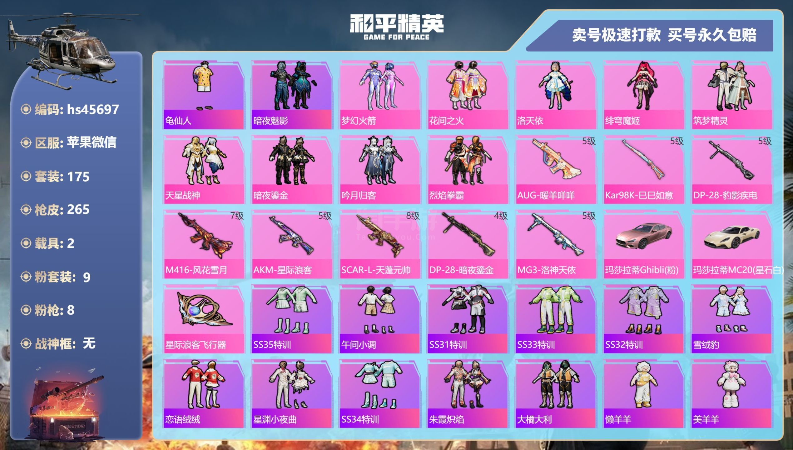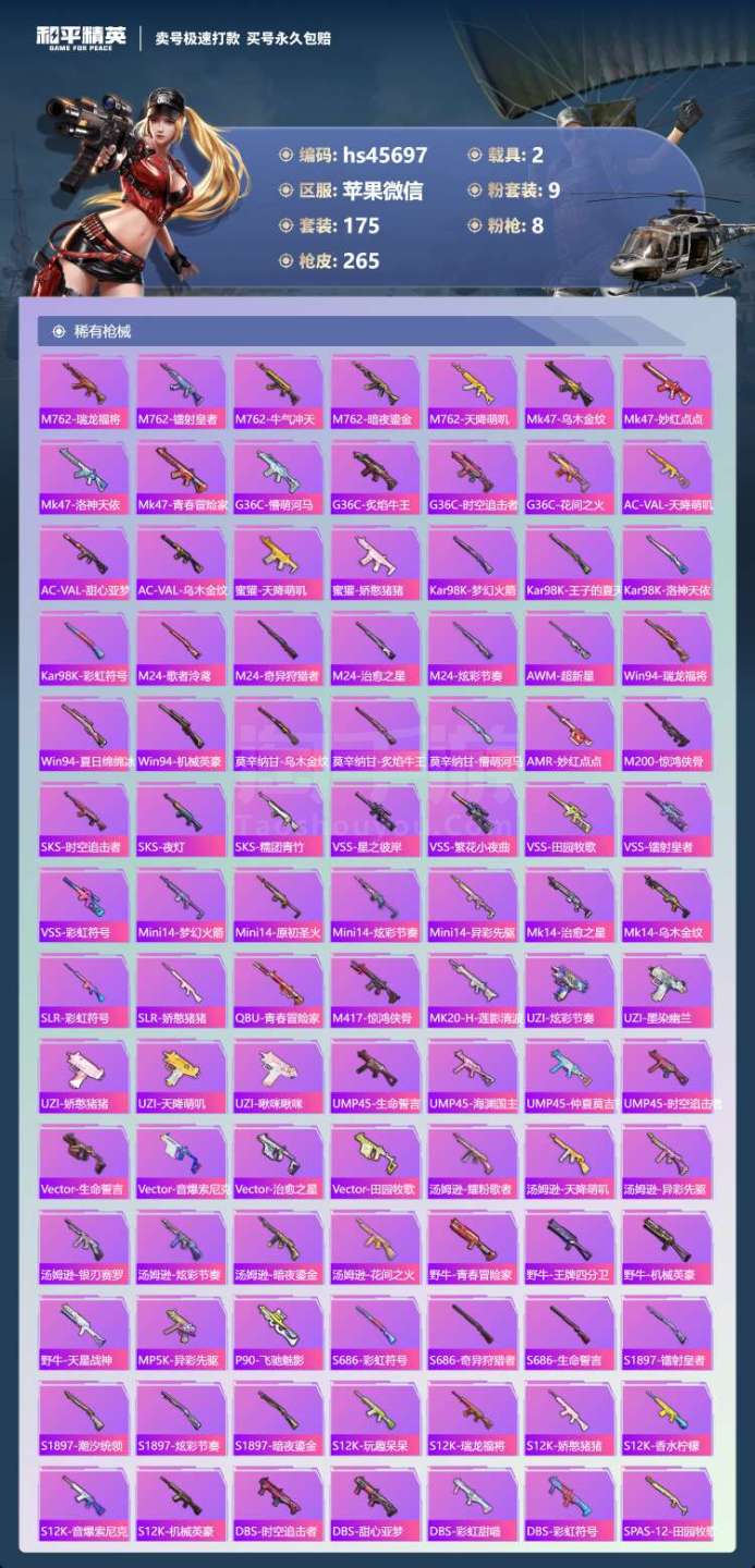 hs45697 苹果微-21王牌印记-9粉装-8特效枪-2载具-87612热力值-175套装-26