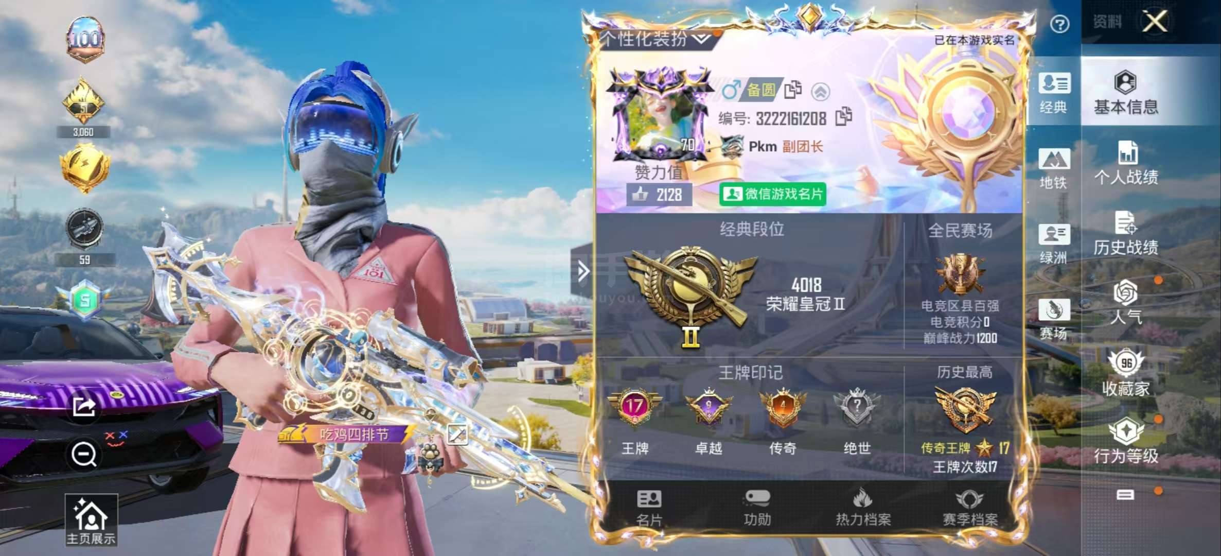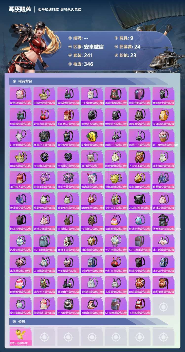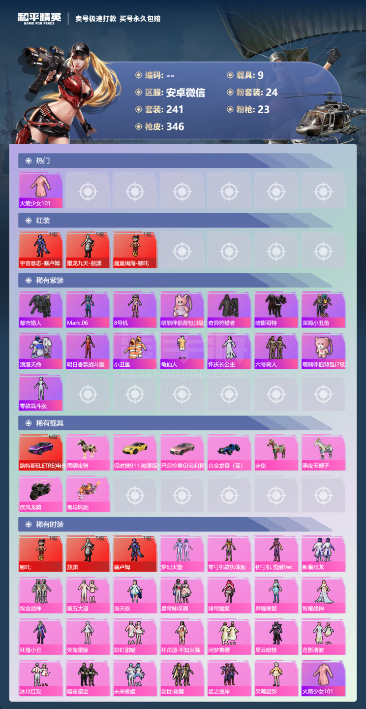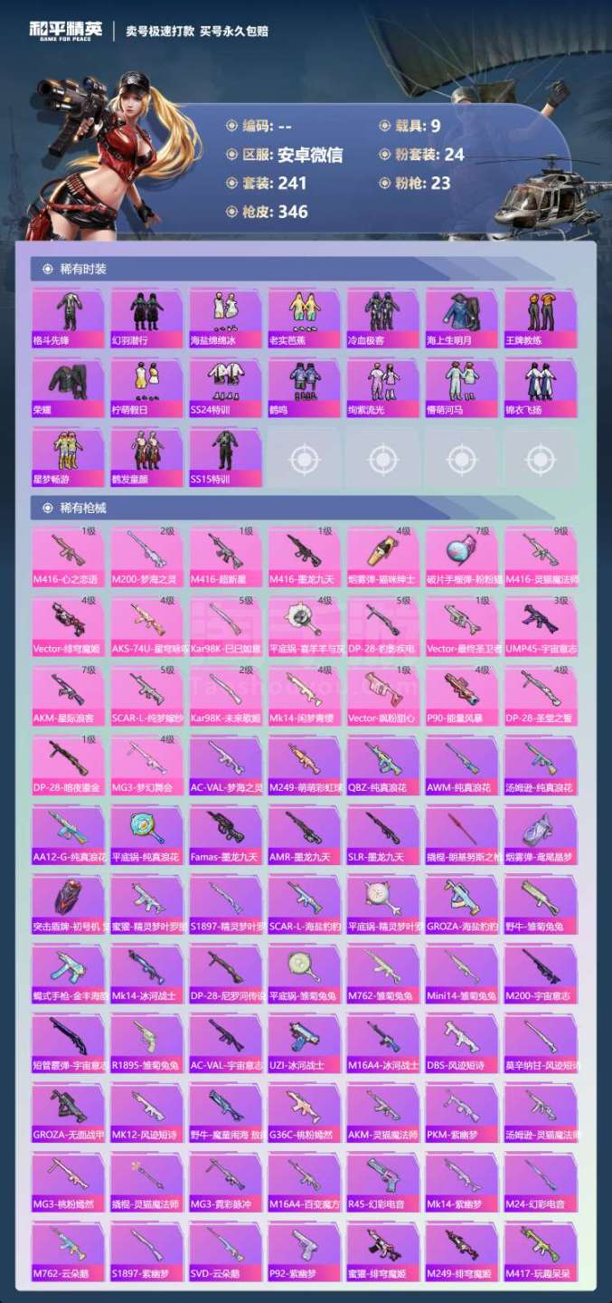 hs45684 安卓微-17王牌印记-24粉装-23特效枪-9载具-153601热力值-241套装