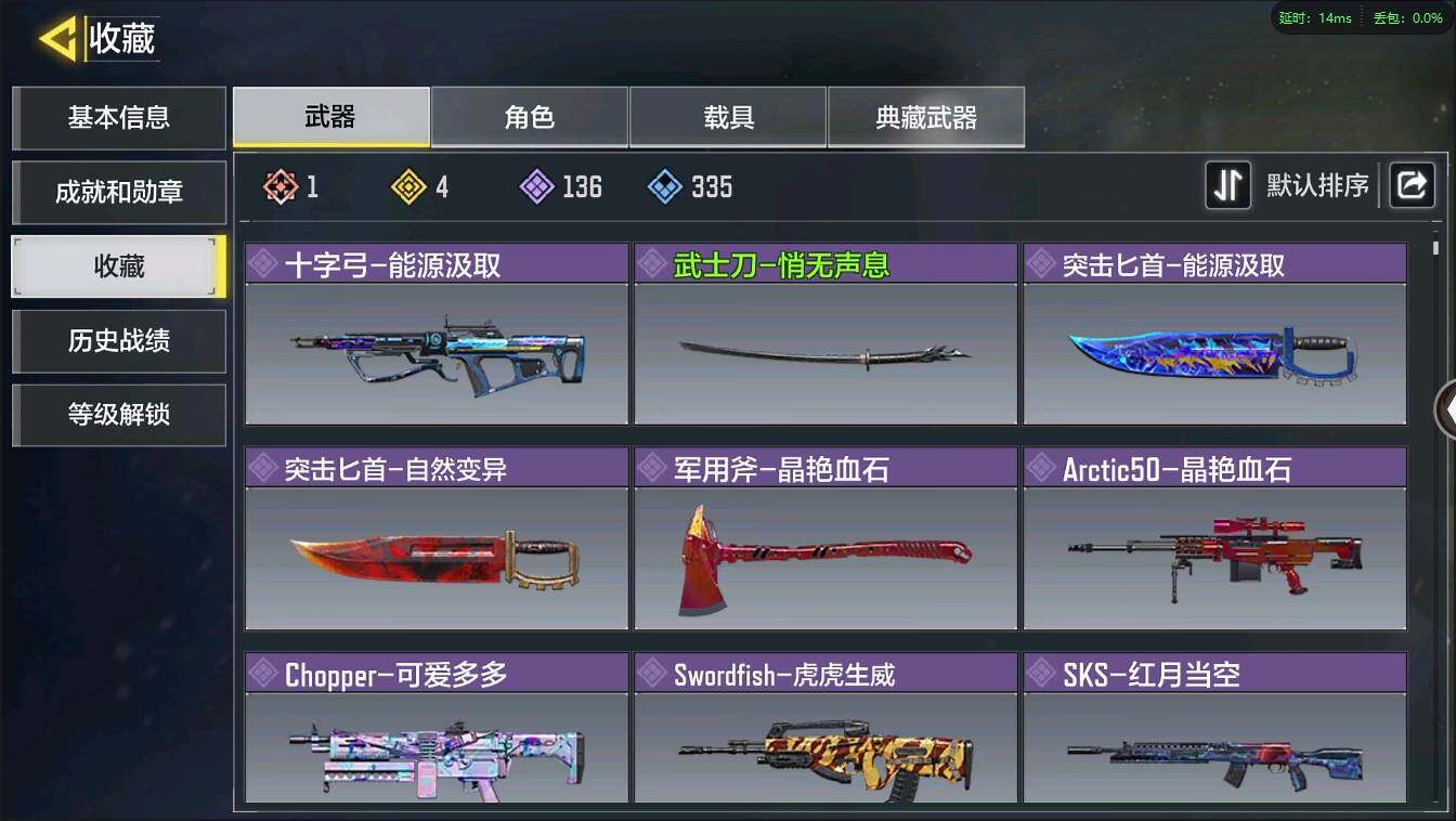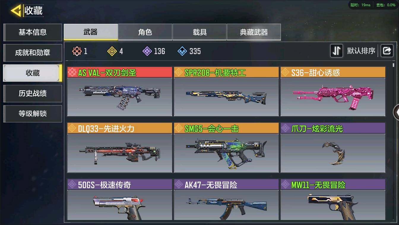 武器:1神话 4传说 AS VAL-双刃剑圣,SPR208-机要特工,S36-甜心诱惑,DLQ33-先进火力,SMG5-会心一击,爪刀-炫彩流光,50GS-极速传奇,AK47-无畏冒险,MW11-无畏冒险,十字弓-能源汲取,武士刀-悄无声息,突击匕首-能源汲取详情请看图,AS VAL-双刃剑圣