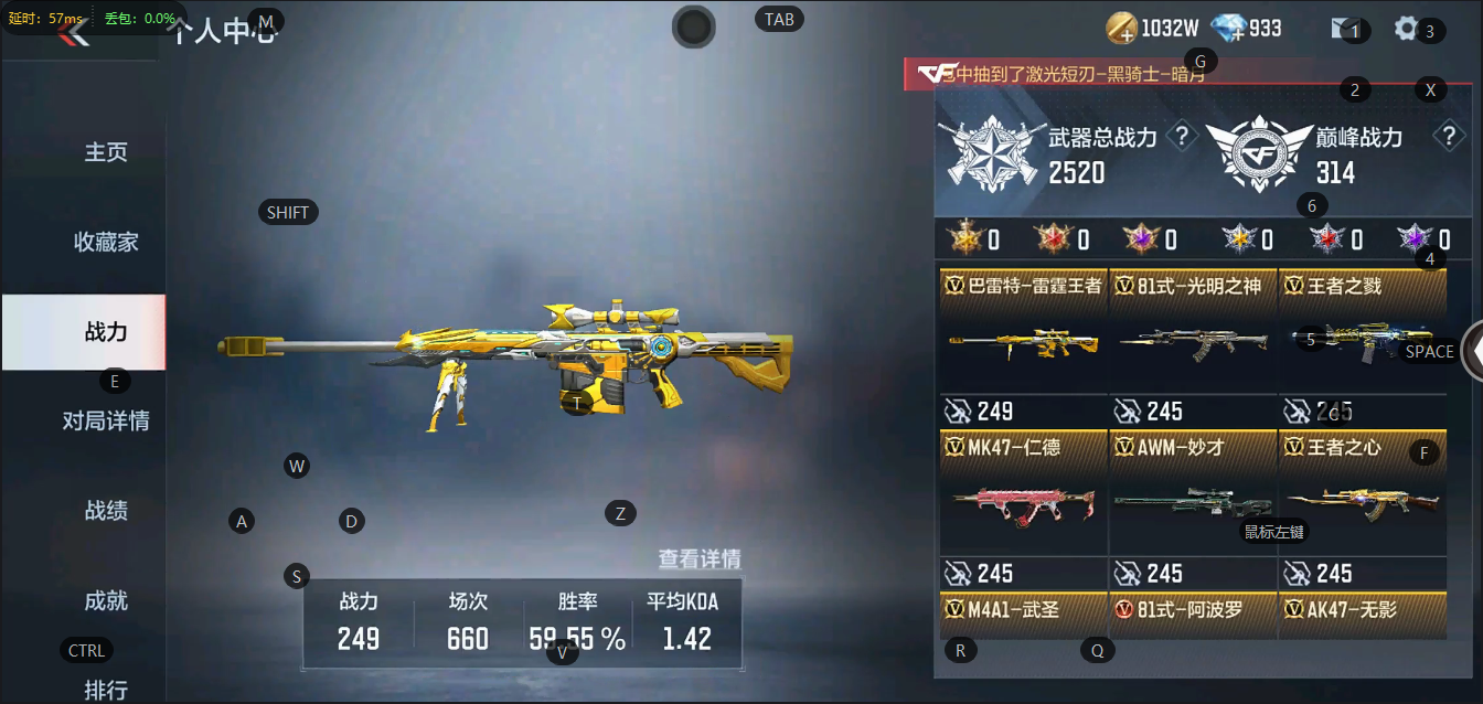 贵族等级: V7 v武器: M4A1-海骑士,AK47-血武士,MK47-机械纪元,MK47-仁德,AK47-雷麒麟,M4A1-机械迷城,M14EBR-天神,QBZ19-天使,AUG-机械纪元,AK47-变色龙,M4A1-樱龙·超觉,M4A1-卧龙觉醒,M4A1-武圣,AN94-超新星,M4A1-死神,AK47-麒麟,AWM-妙才,09式狙-天神,加特林-炼狱,CZS2-心动次元觉醒,双持斯泰尔