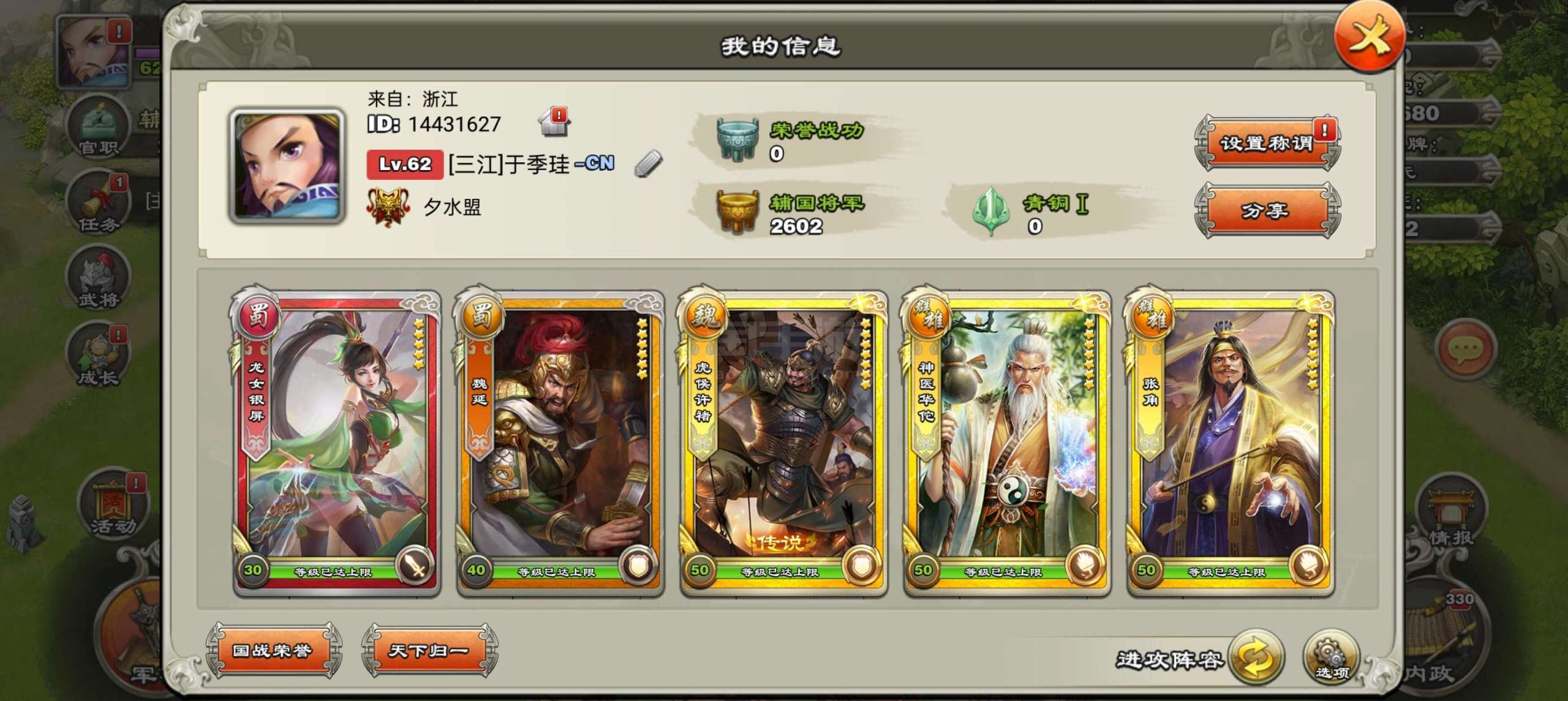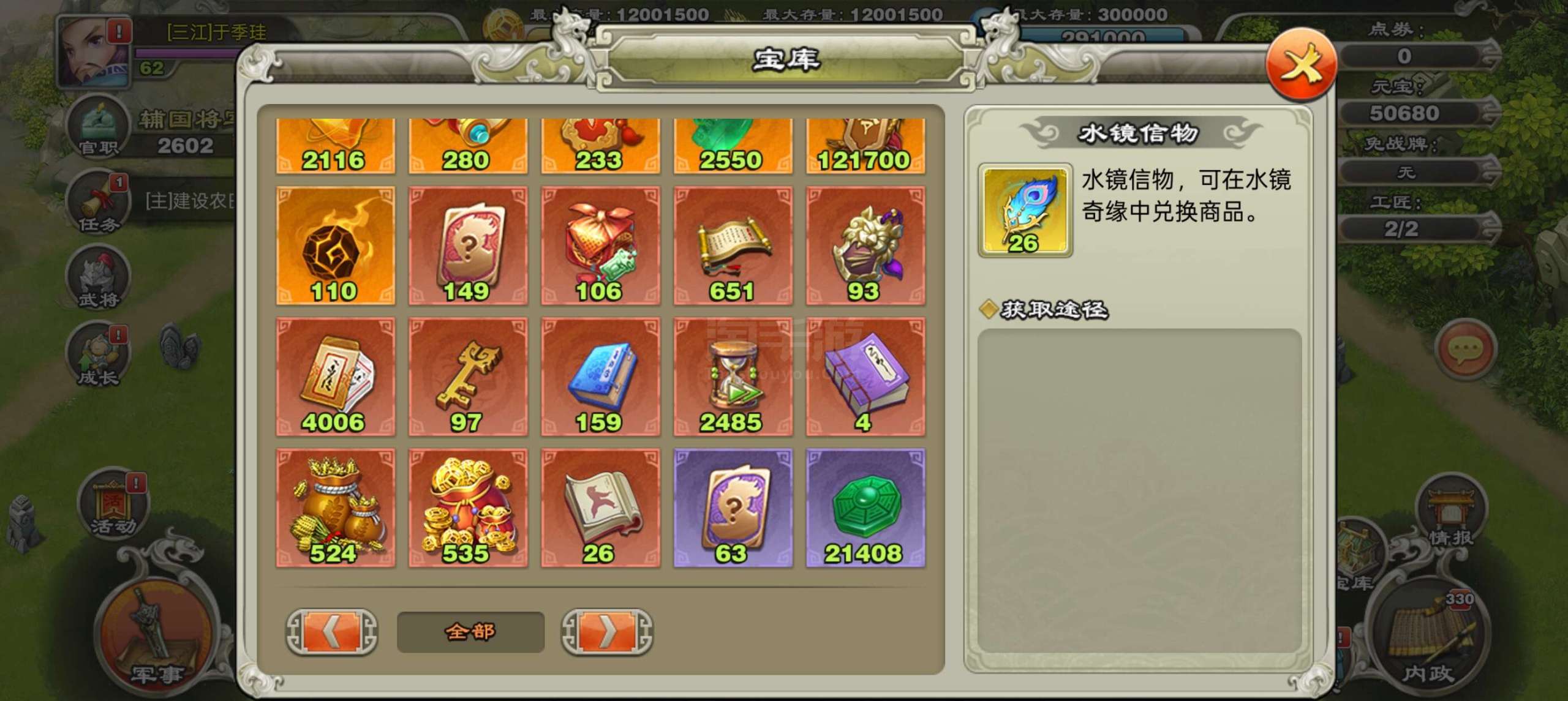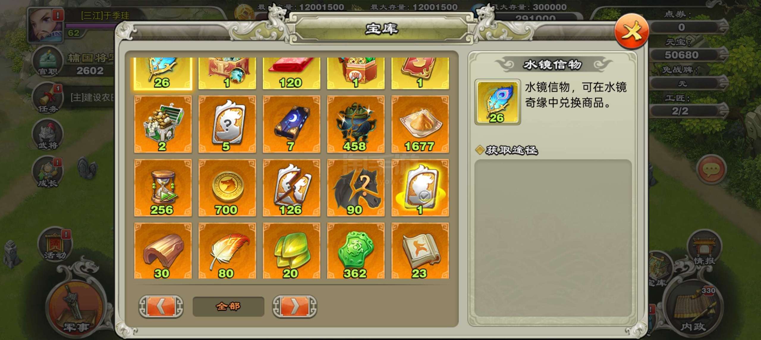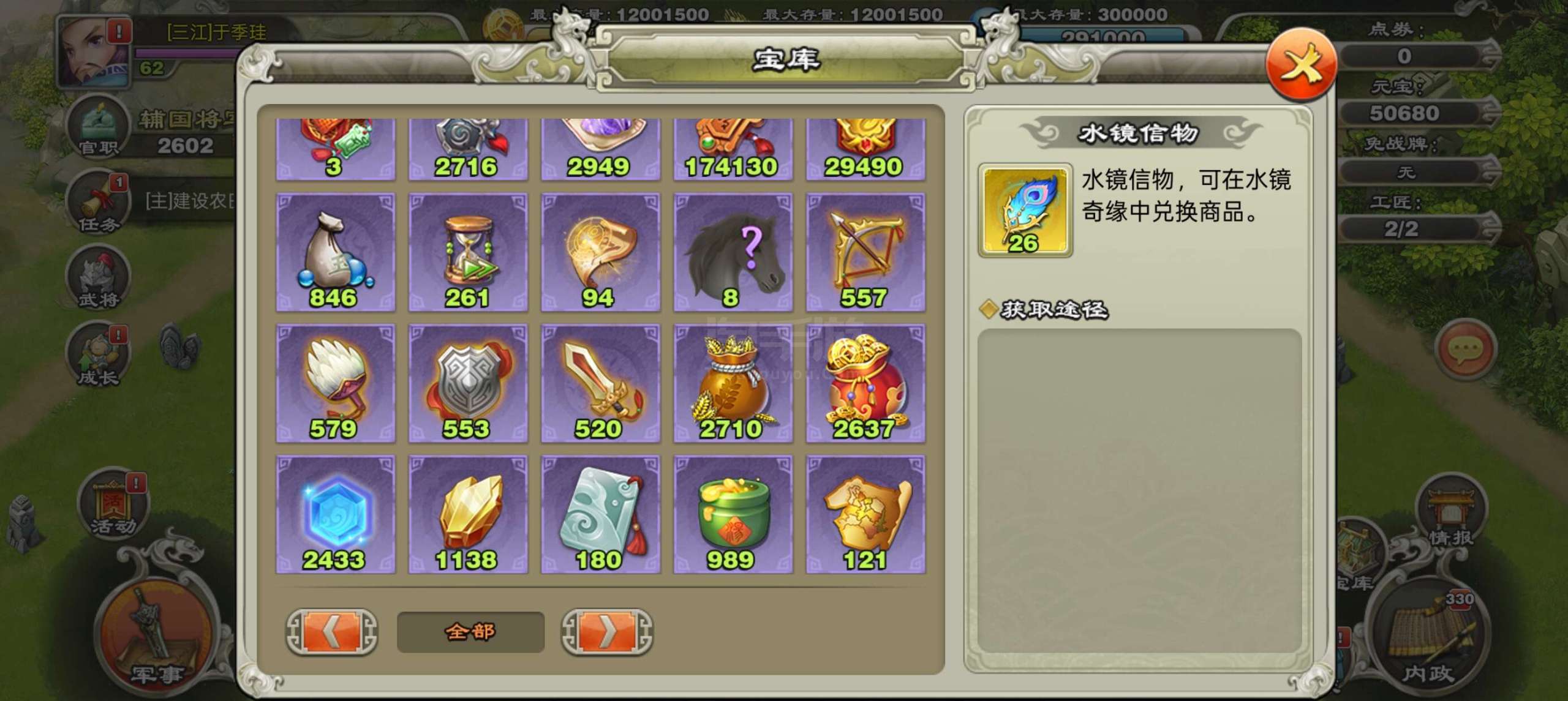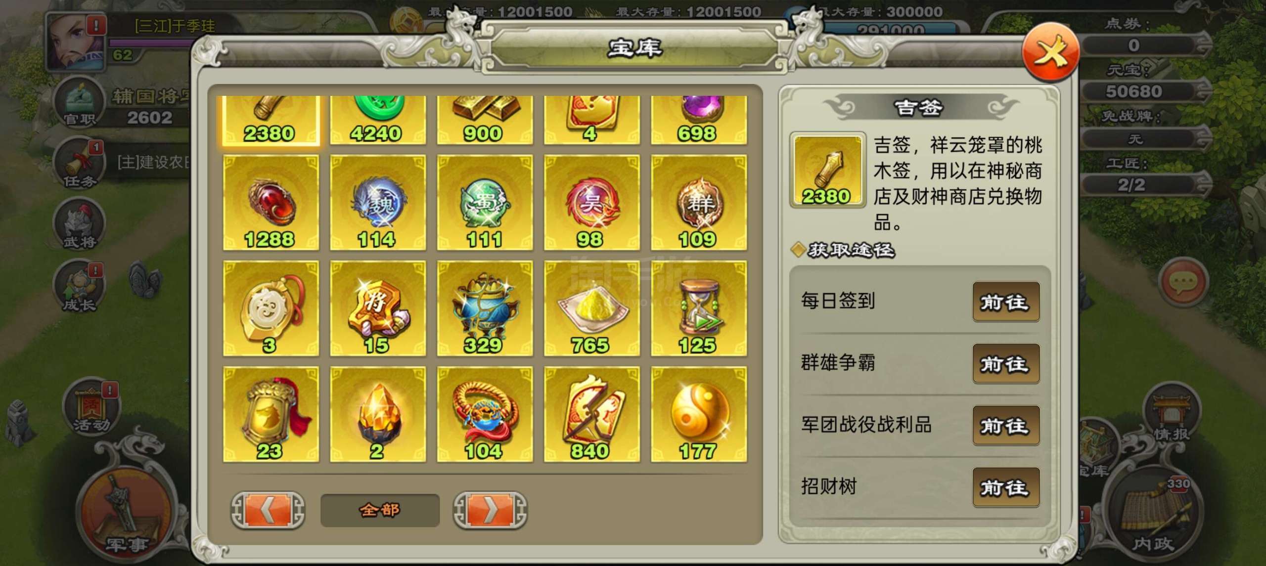 君临天下【安卓其他】水镜许褚,26羽毛,50000元宝,2380吉签,自选47,10本62级,多资源压级号