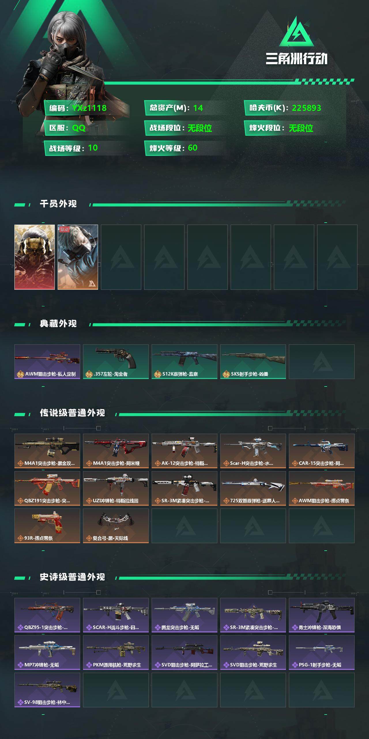 【Q区三端互通-蚀金玫瑰】【无二次】YXz1118-特勤处:仓库6级/训练中心6级/靶场4级-总资产14m-哈夫币22589w-烽火等级:60级【勾选了部分账号,详细看图,平台认证商家店铺,保证金商家,安全有保障,性价比超高,永久包赔】