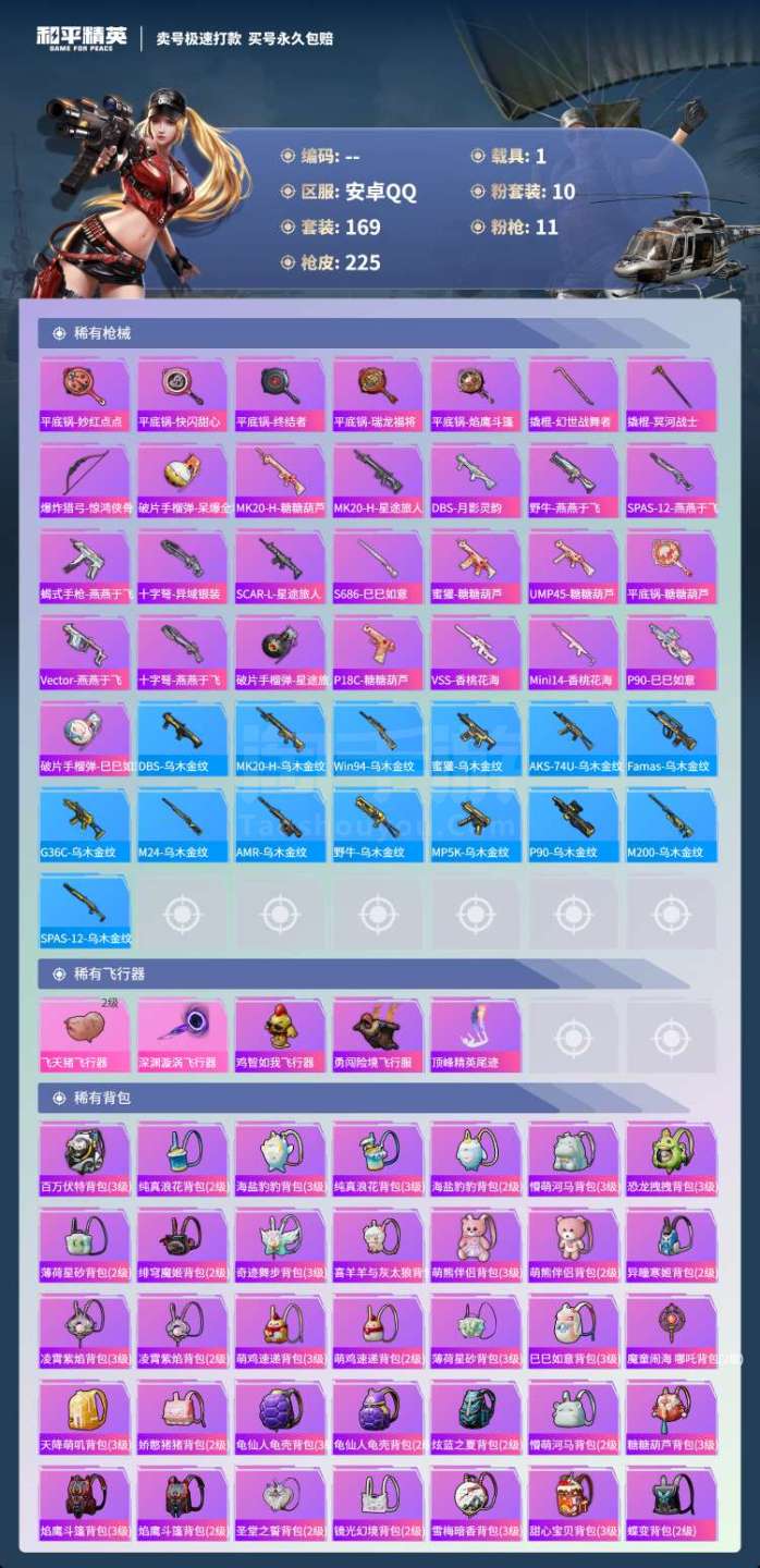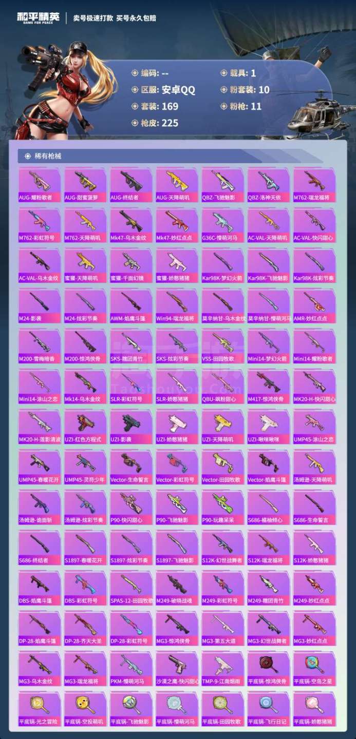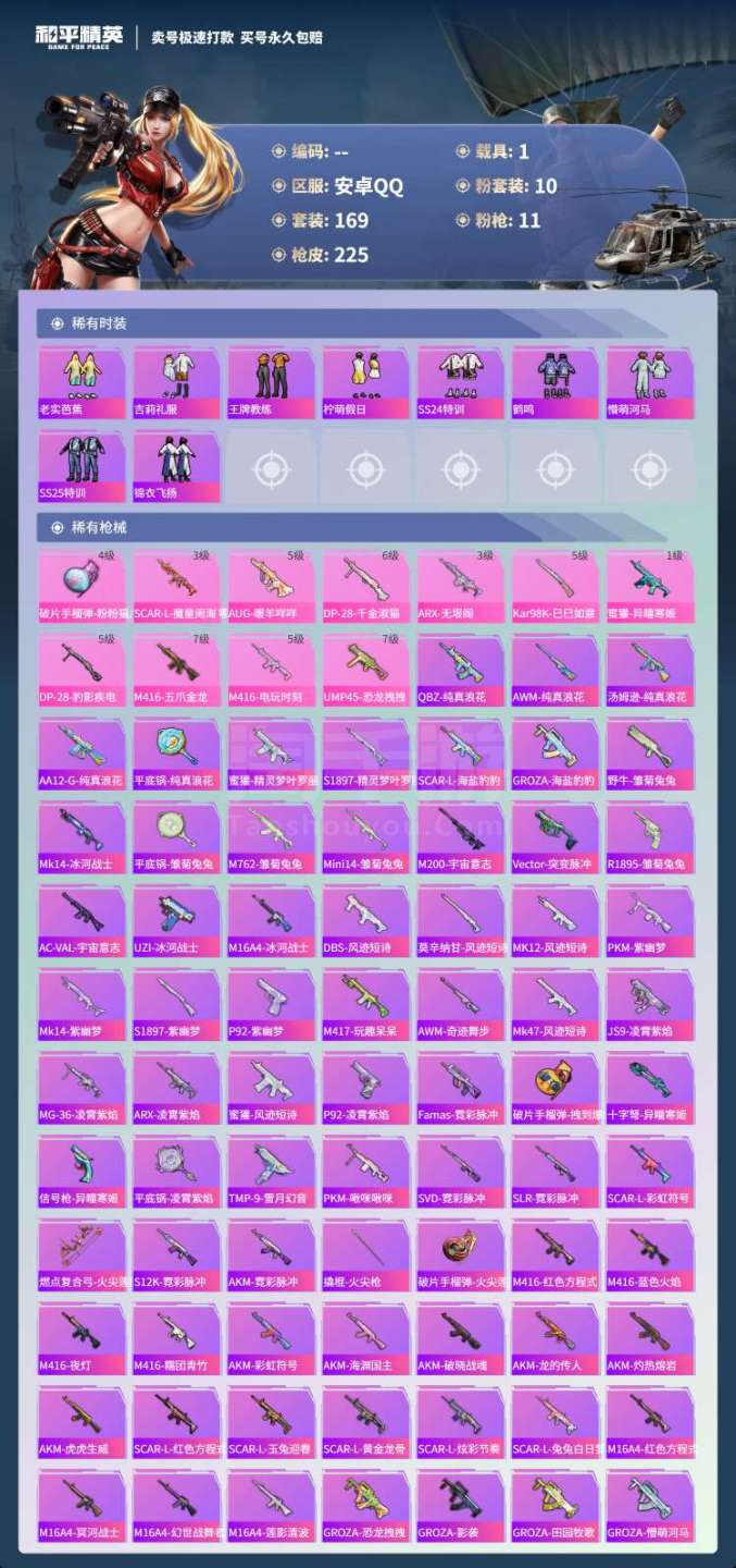 hs45344 安卓手Q-17王牌印记-10粉装-11特效枪-1载具-73895热力值-169套装-