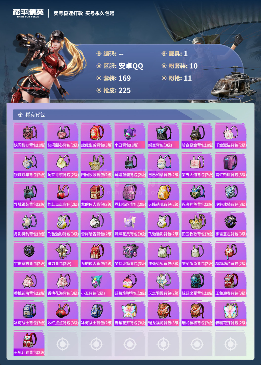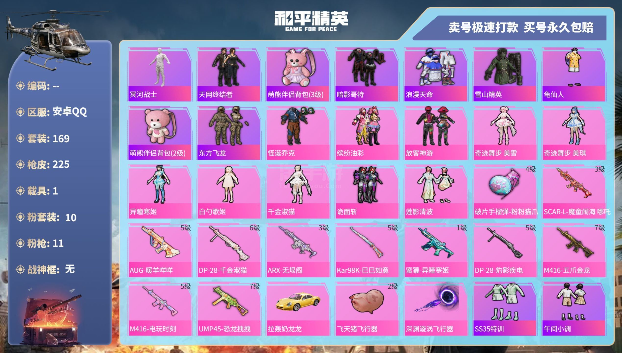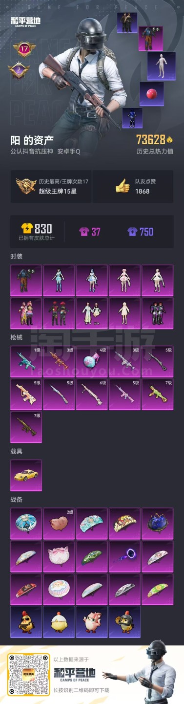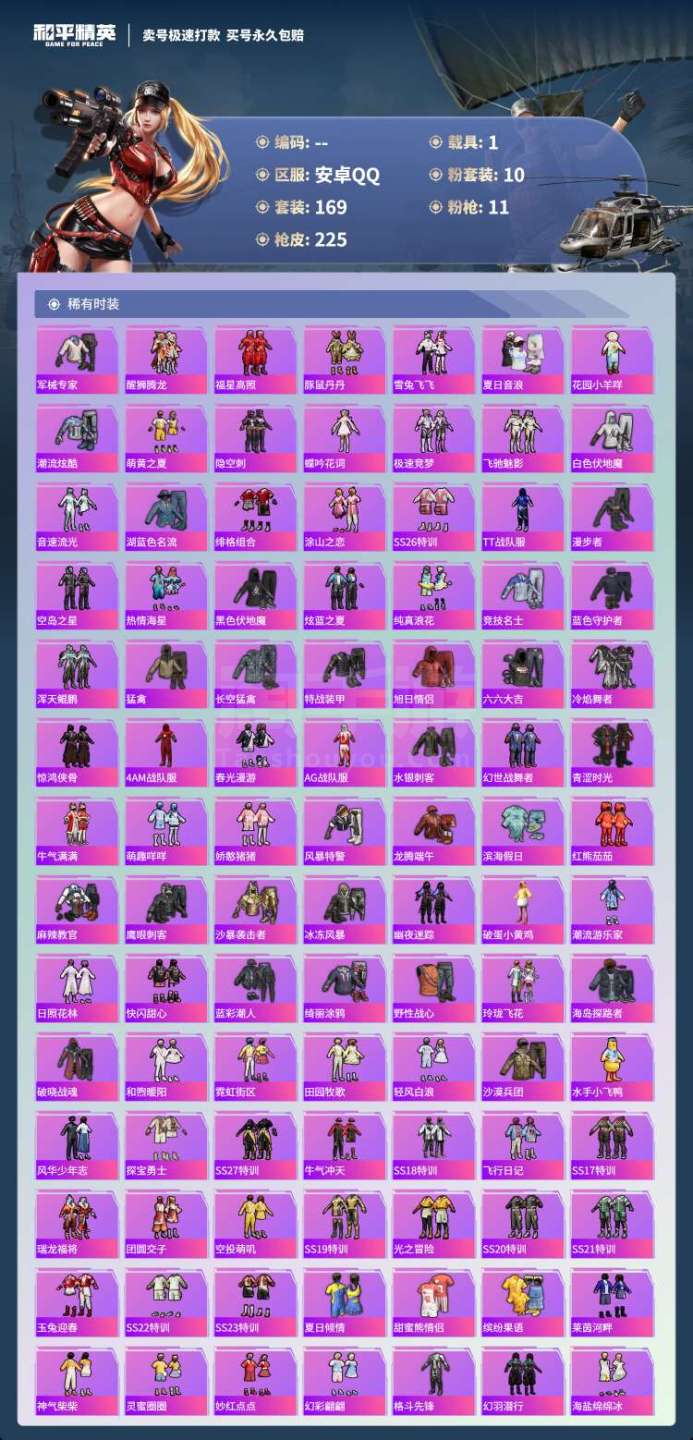 hs45344 安卓手Q-17王牌印记-10粉装-11特效枪-1载具-73895热力值-169套装-