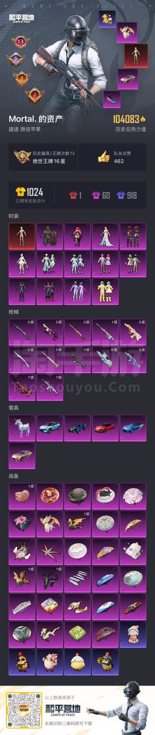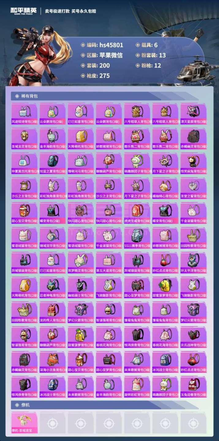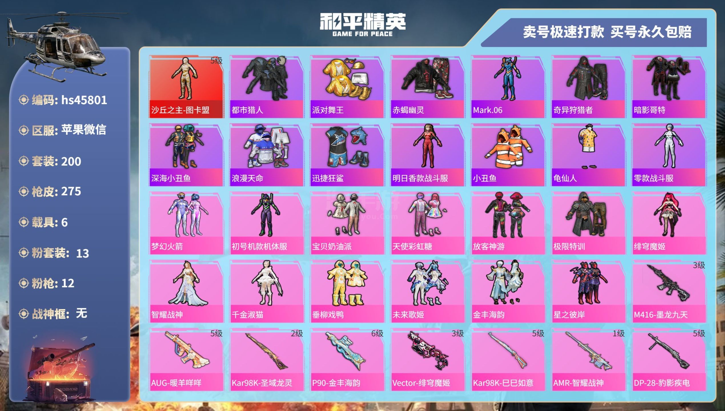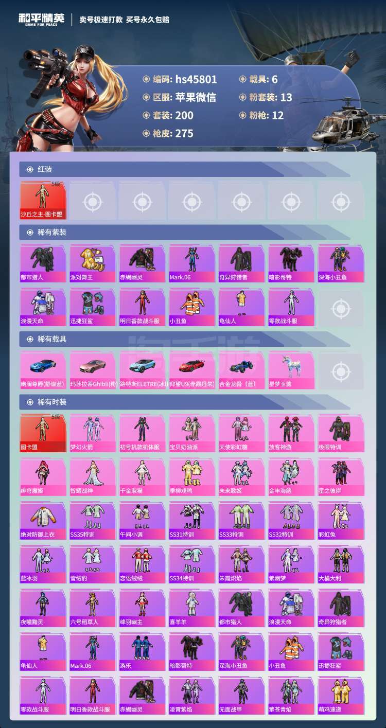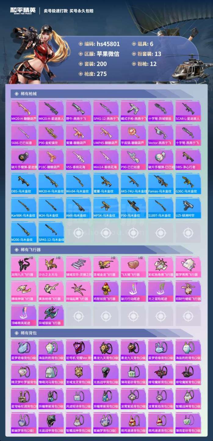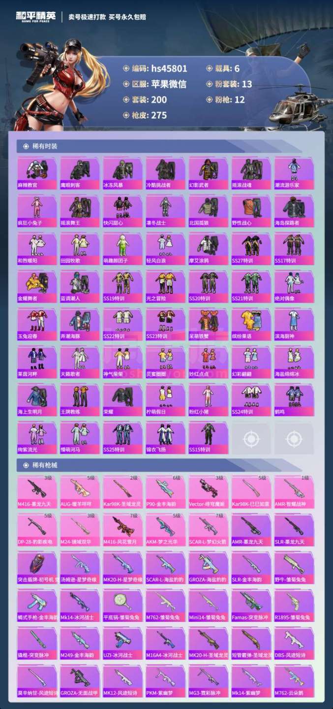 hs45801 苹果微-13王牌印记-13粉装-12特效枪-6载具-104083热力值-200套装