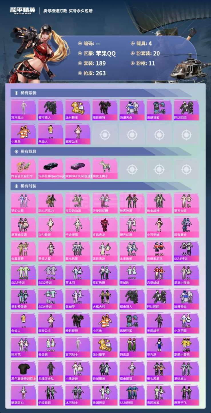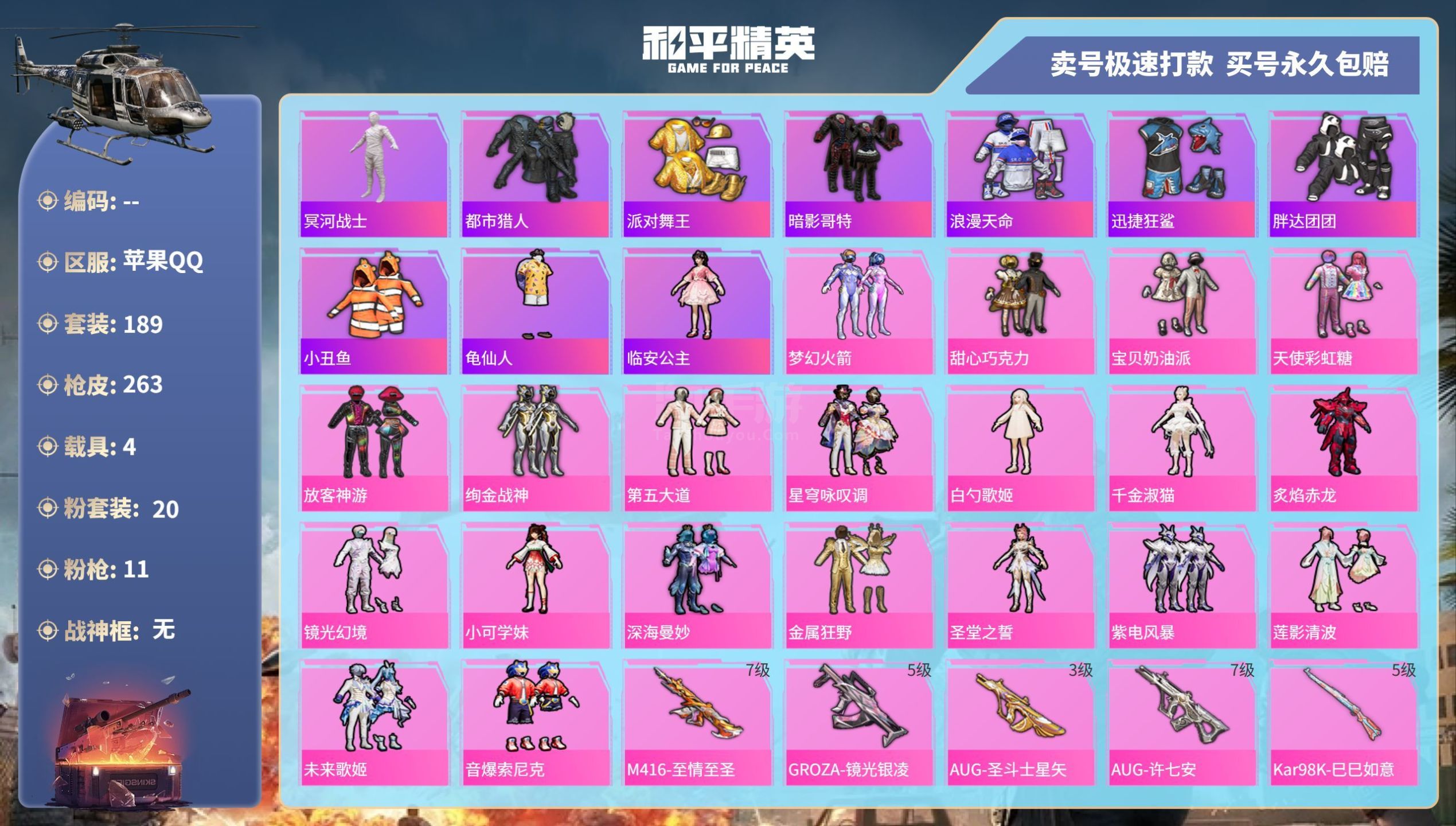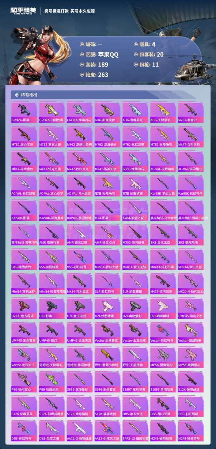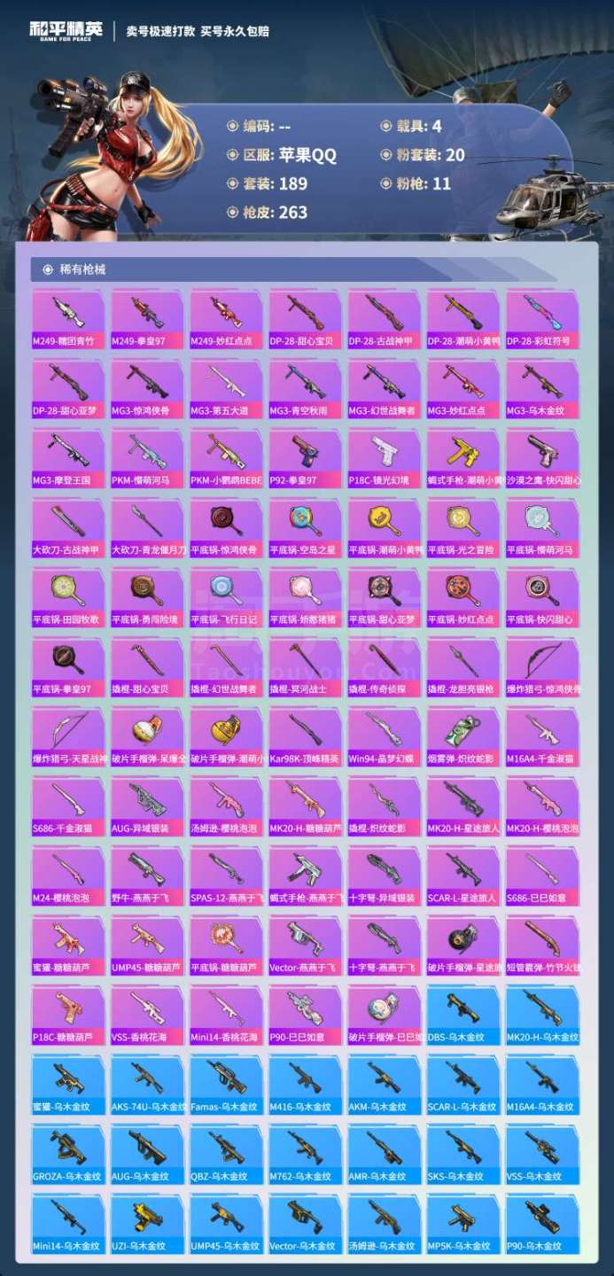 hs45315 苹果手Q-14王牌印记-20粉装-11特效枪-4载具-91504热力值-189套装-