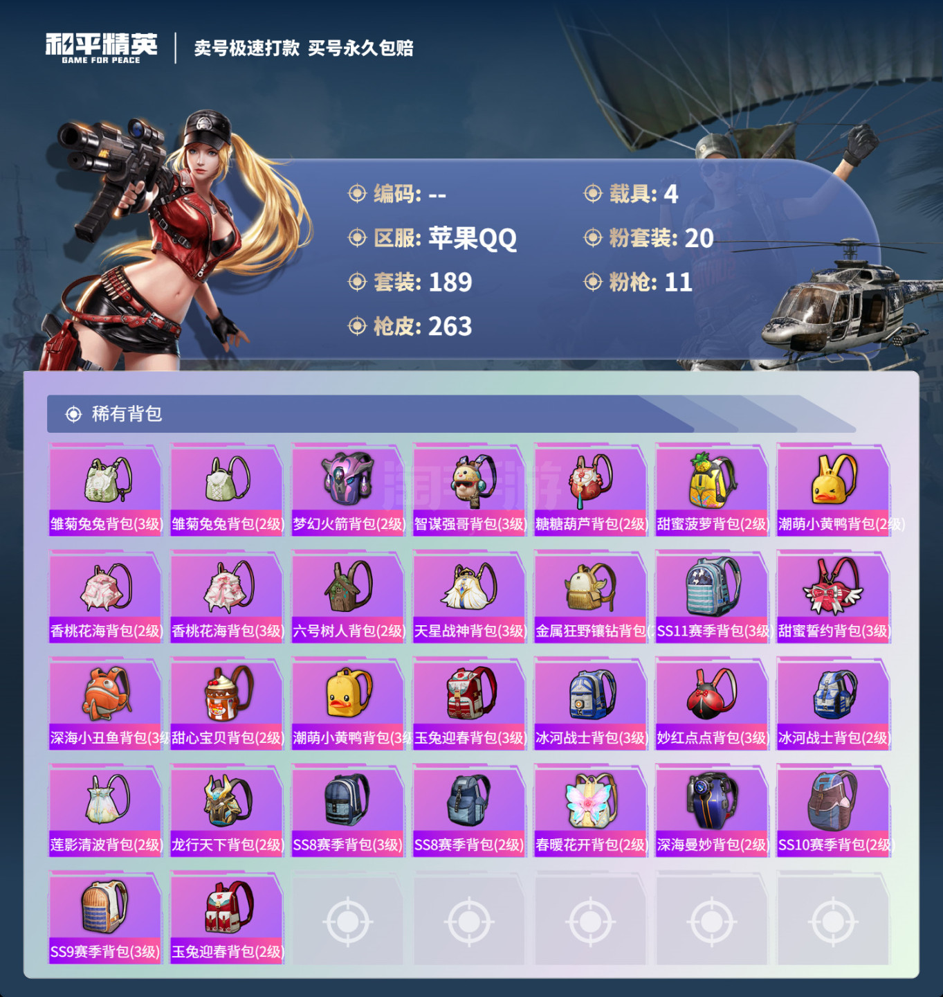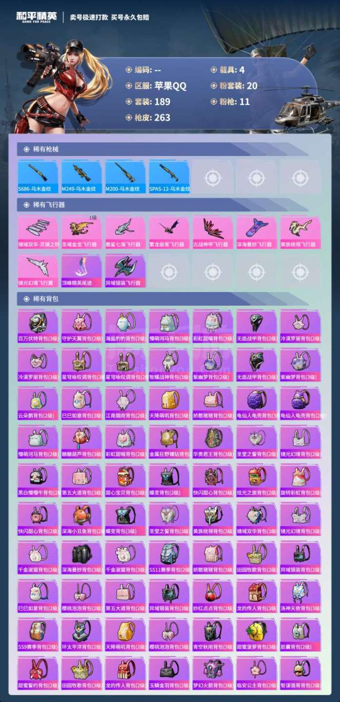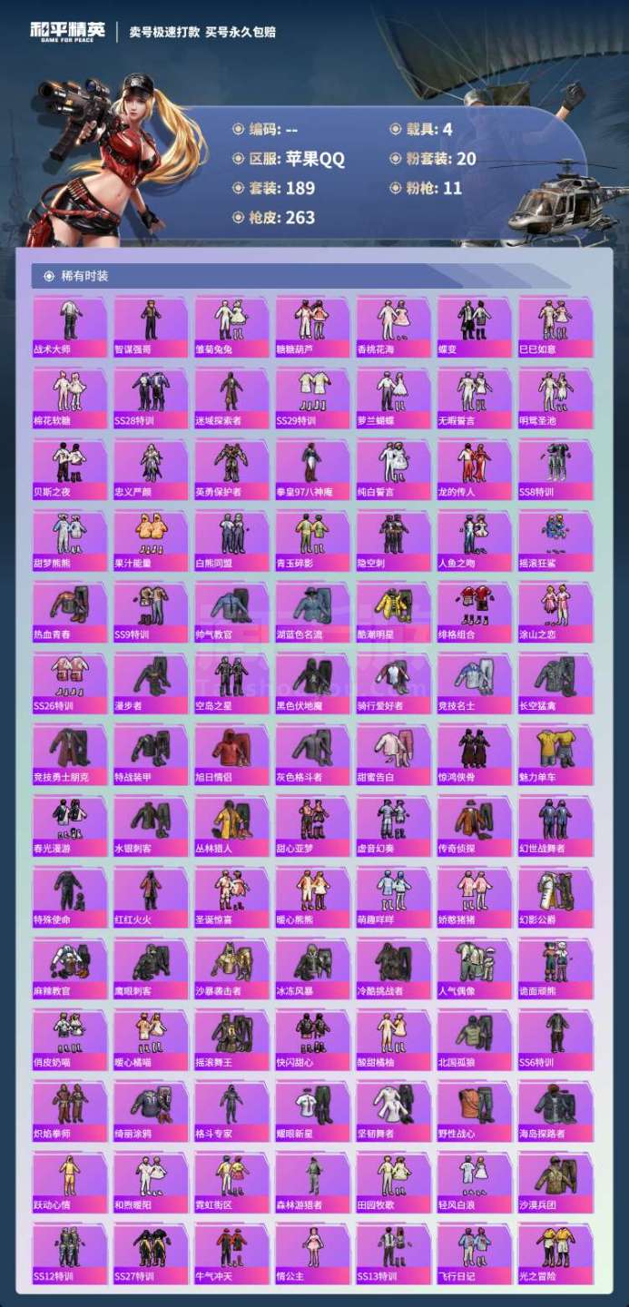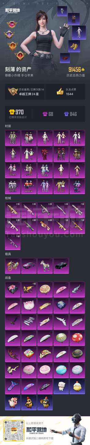 hs45315 苹果手Q-14王牌印记-20粉装-11特效枪-4载具-91504热力值-189套装-