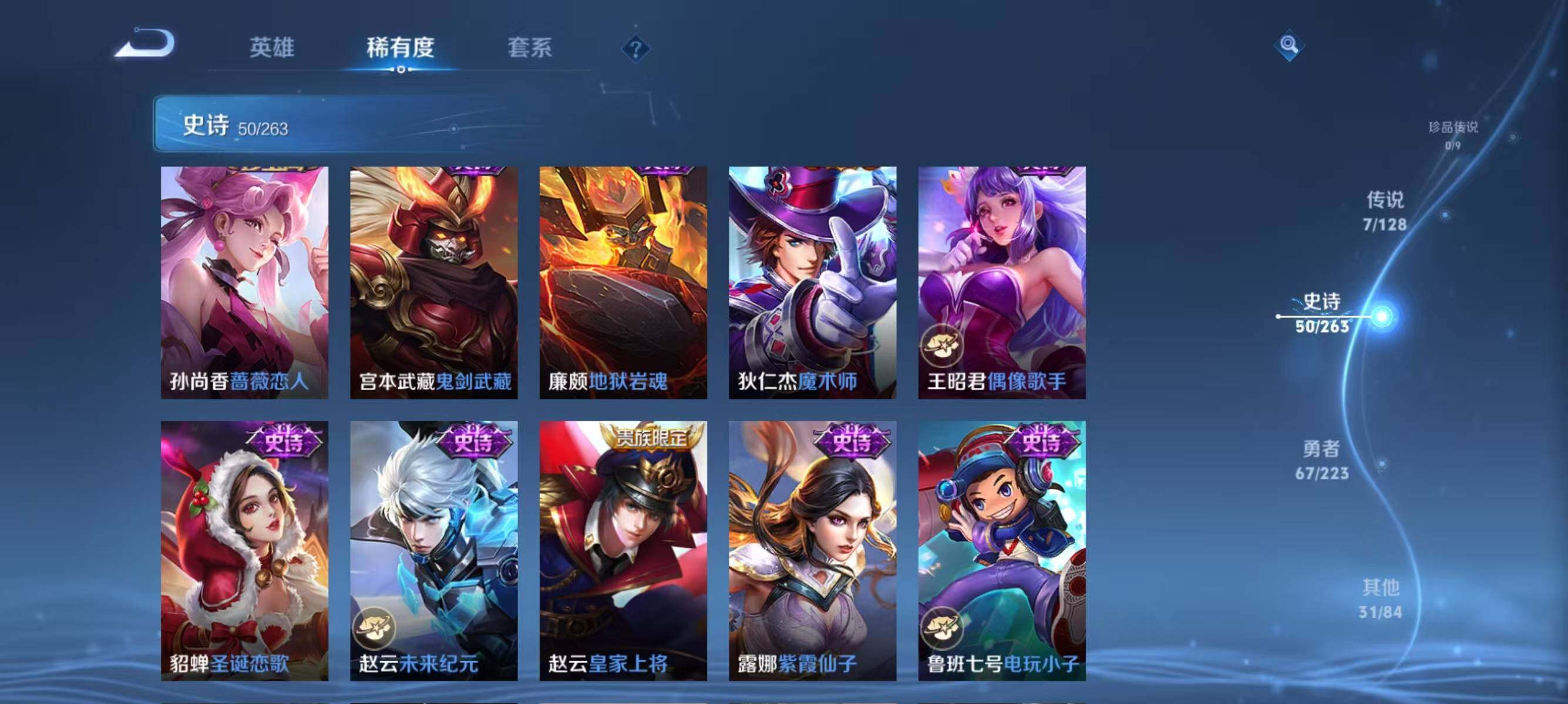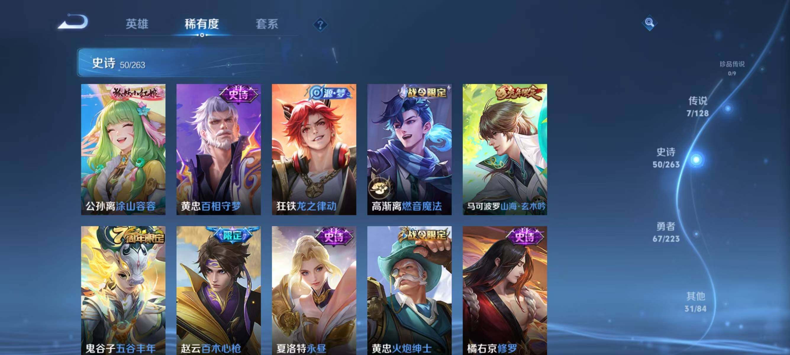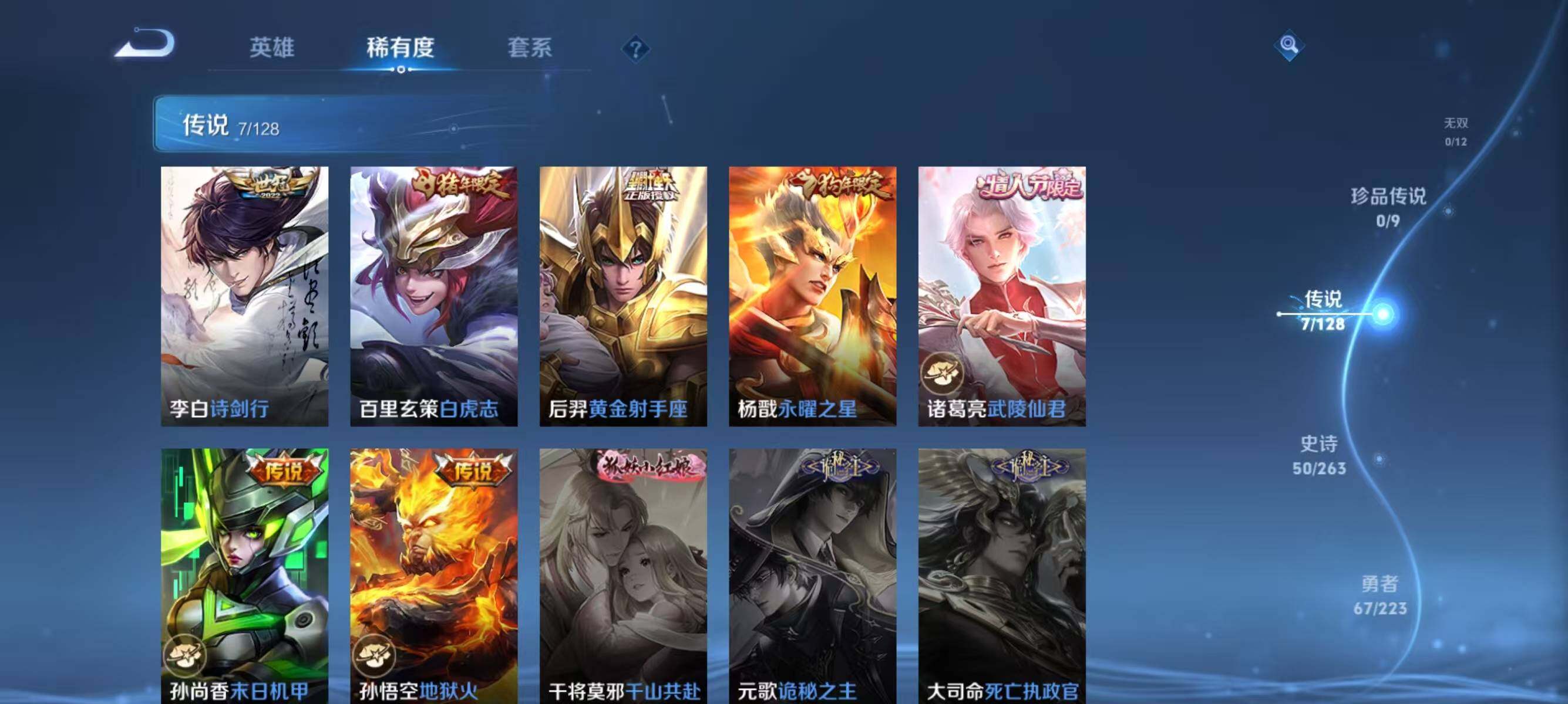 【传说皮肤】:李白诗剑行,百里玄策白虎志,后羿黄金射手座,杨戬永曜之星,诸葛亮武陵仙君,孙尚香末日机甲,孙悟空地狱火
