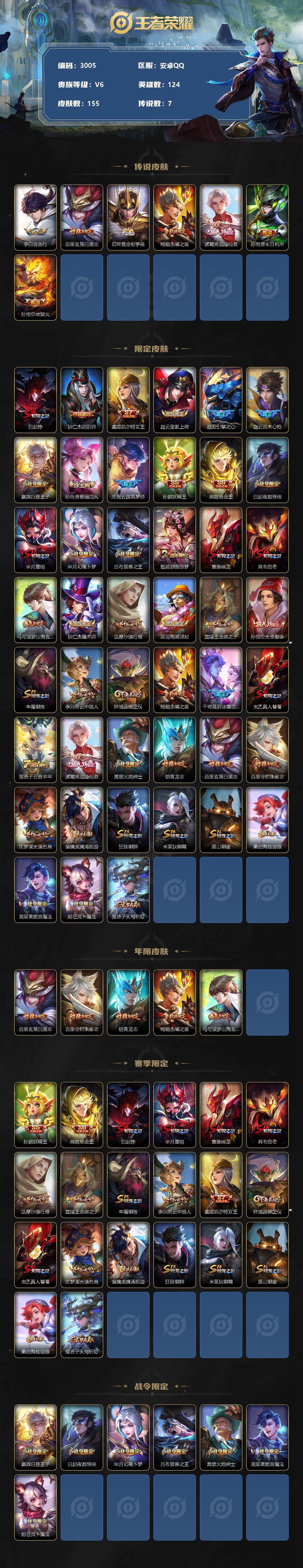 【商品标题】:安卓Q-V6-永恒钻石III段位-124英雄-155皮肤-0典藏