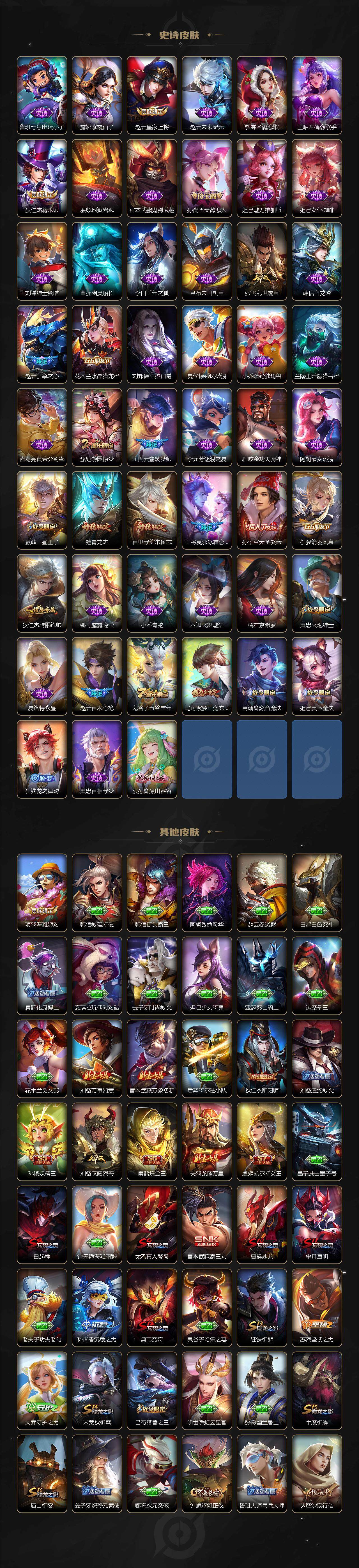 【限定皮肤】:白起狰,狄仁杰阴阳师,虞姬凯尔特女王,赵云皇家上将,赵云引擎之心,赵云百木心枪,嬴政白昼王子,孙尚香蔷薇恋人