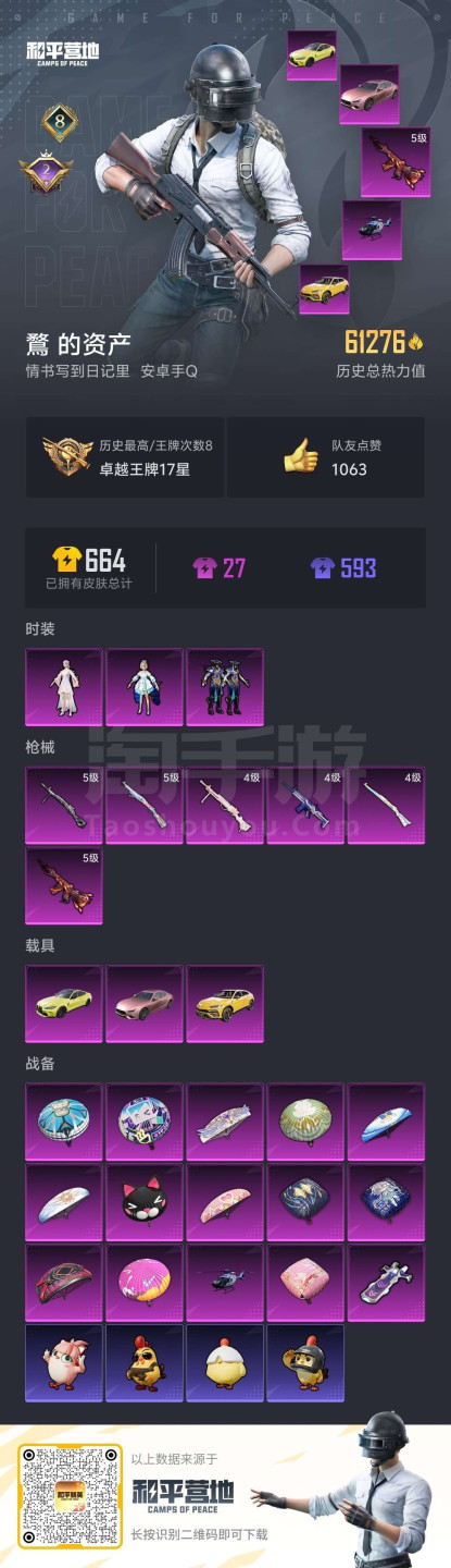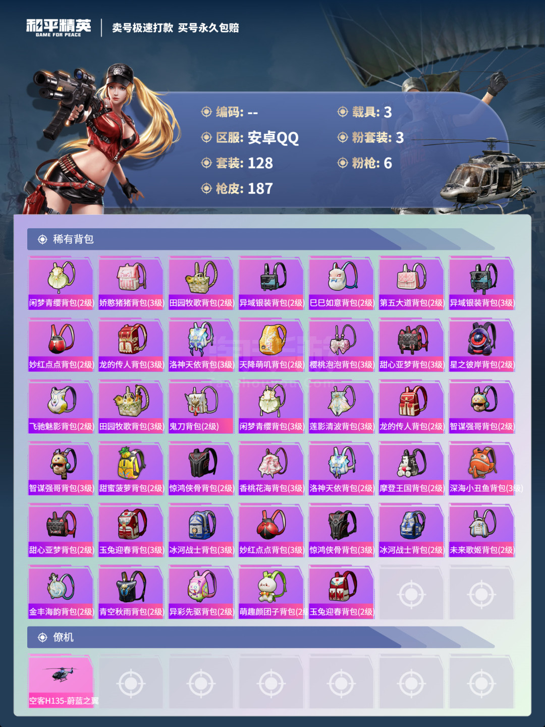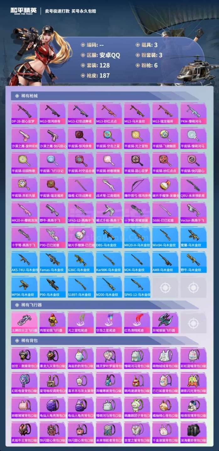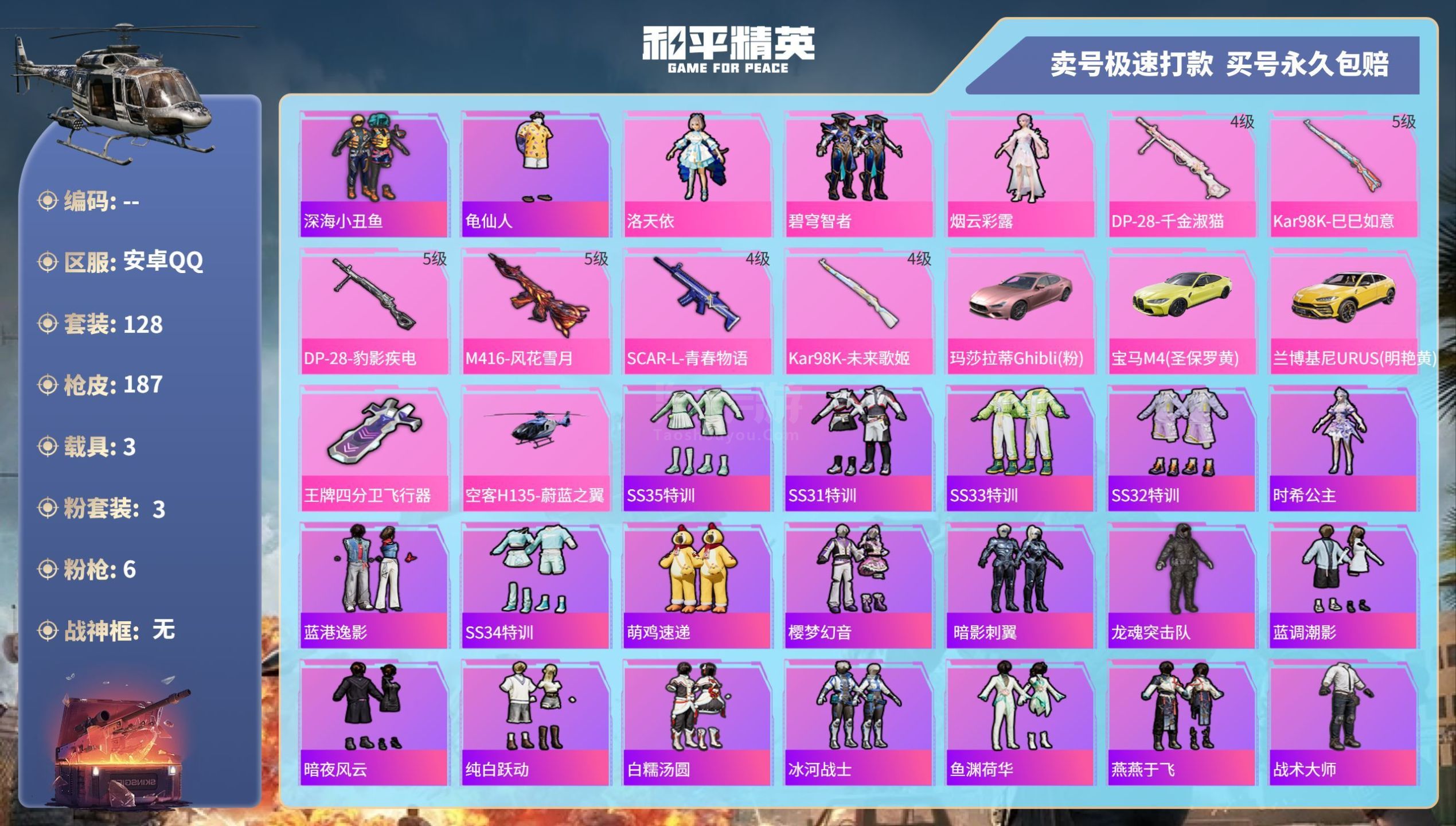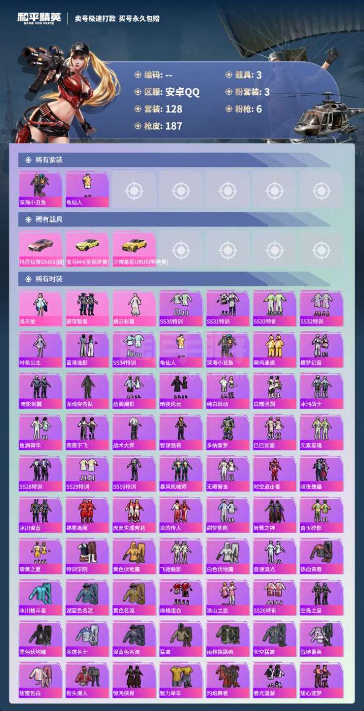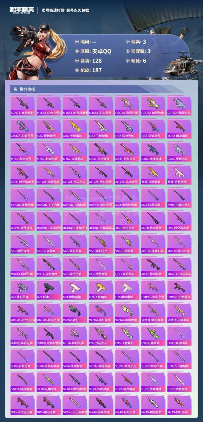 hs45205 安卓手Q-8王牌印记-3粉装-6特效枪-3载具-61281热力值-128套装-187